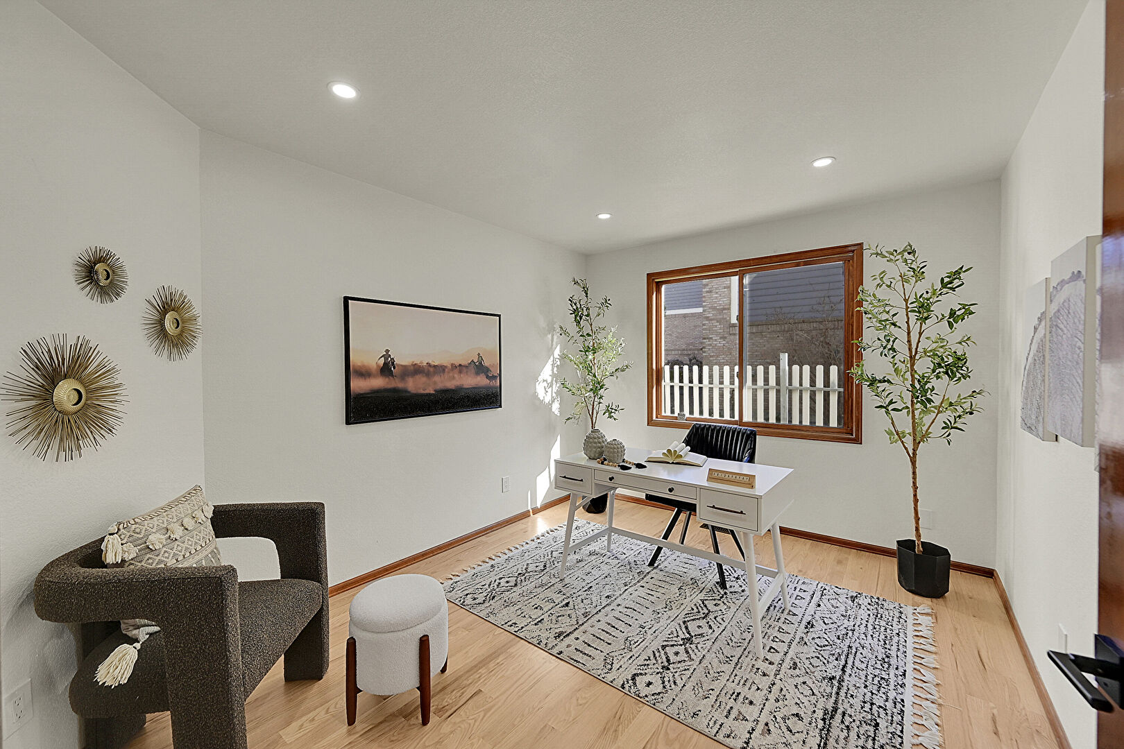 Baseboards Wall, Drywall, Natural Light, Office Area, Wood Finish Floor, Recessed Lighting