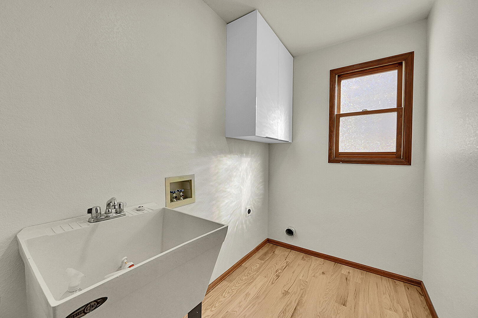 Baseboards Wall, Electric Dryer Hookup, Laundry, Textured Wall, Washer Hookup, Wood Finish Floor, Natural Light