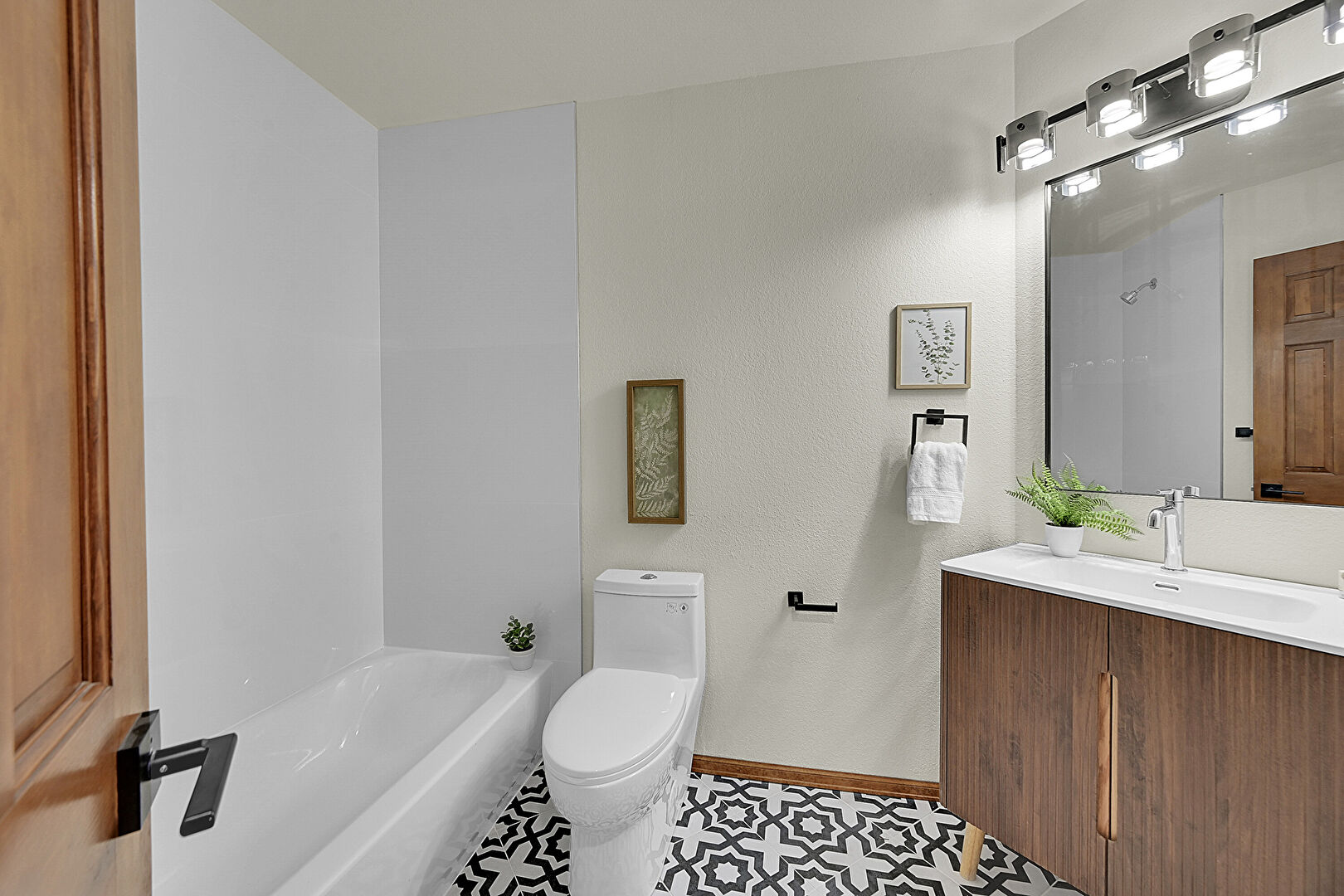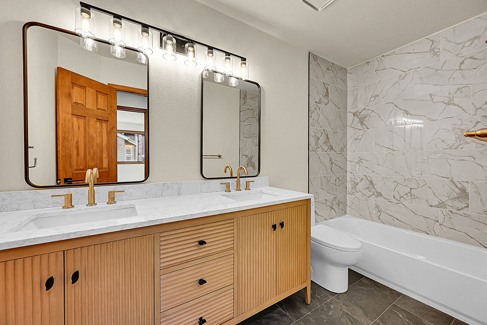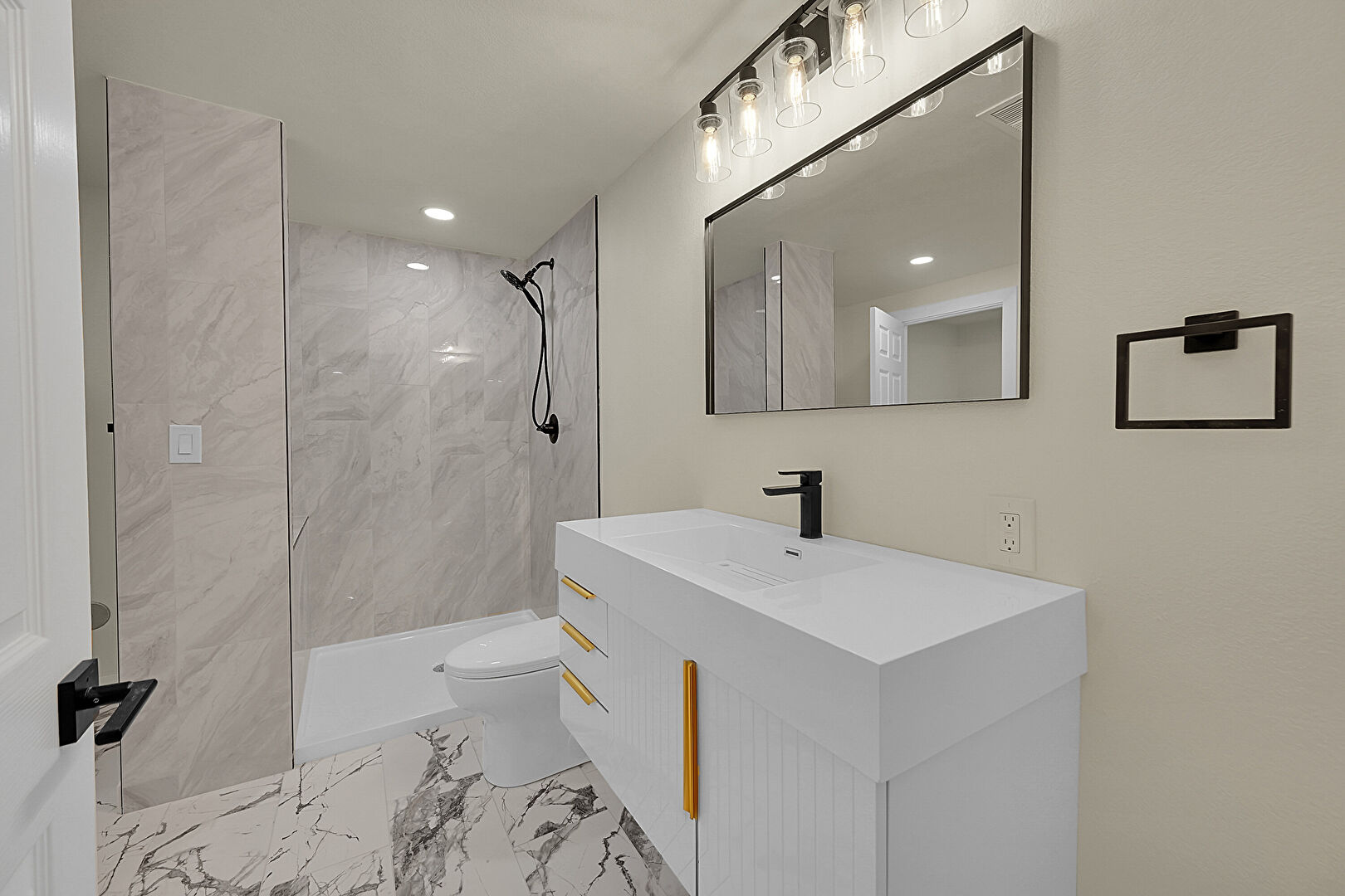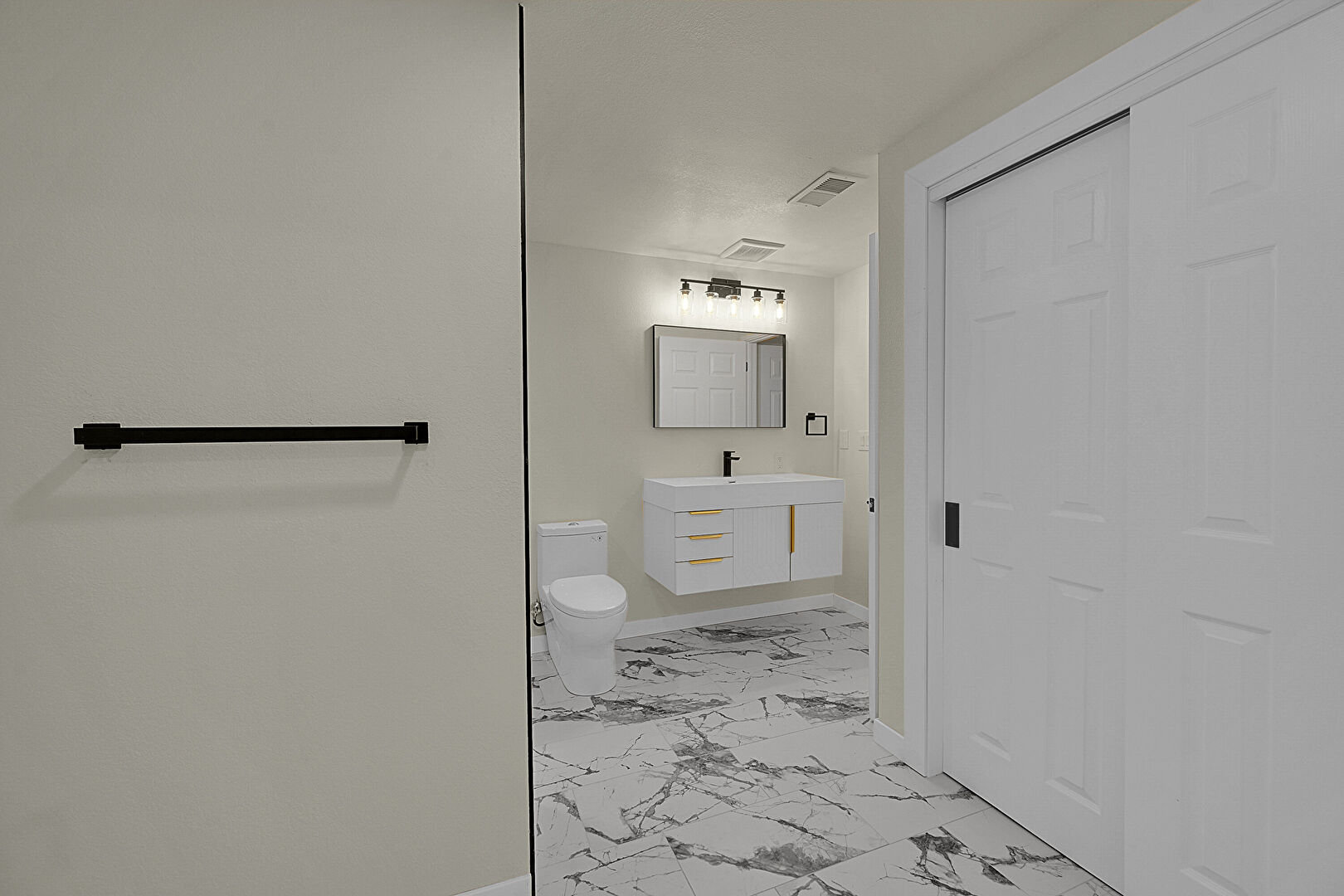 Baseboards Wall, Combined Bath Shower, Double Vanity, Drywall, Full Bathroom, Half Bathroom, Marble Finish Floor, Textured Wall, Tile Floor, Vanity, Vent, Combined Bath Shower, Full Bathroom, Recessed Lighting, Vent