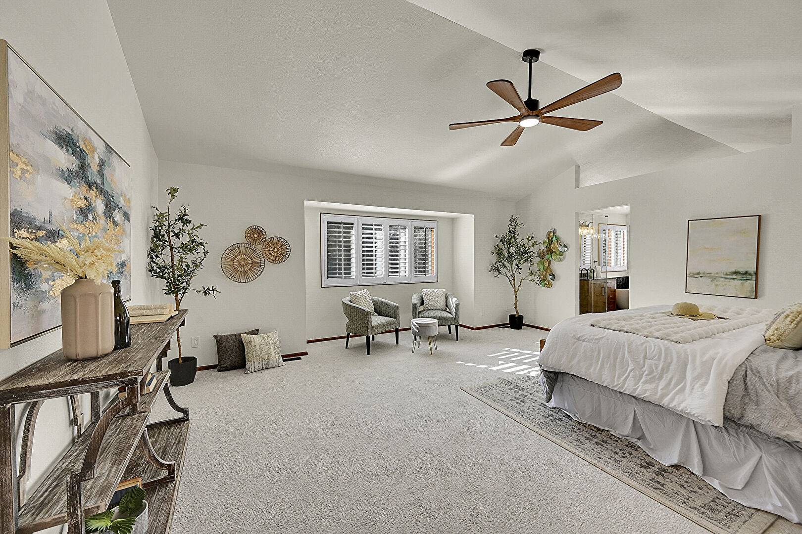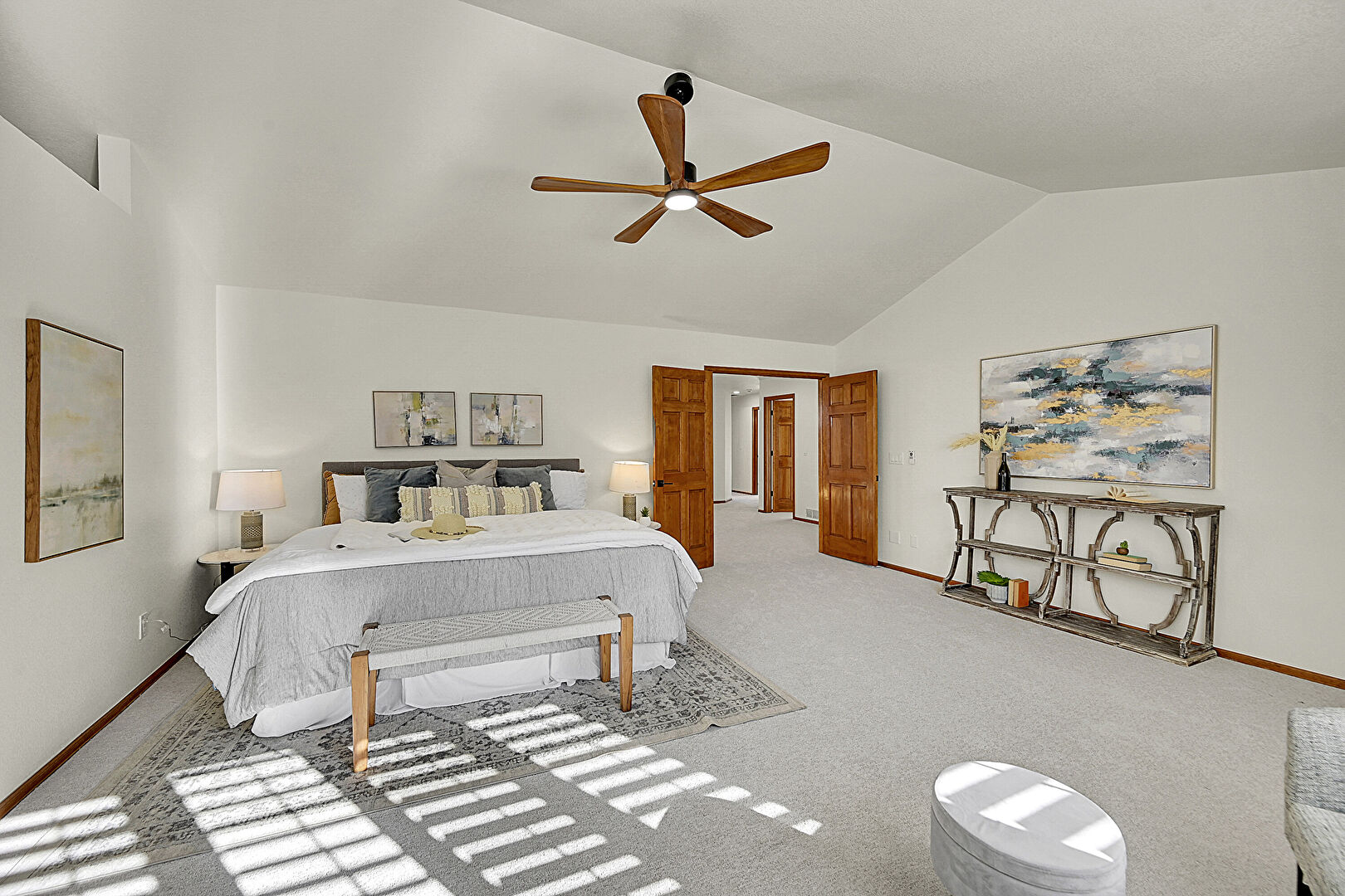 Baseboards Wall, Carpet, Cathedral Ceiling, Ceiling Fan, Drywall, Ensuite Bathroom, Natural Light, Vaulted Ceiling, Baseboards Wall, Drywall