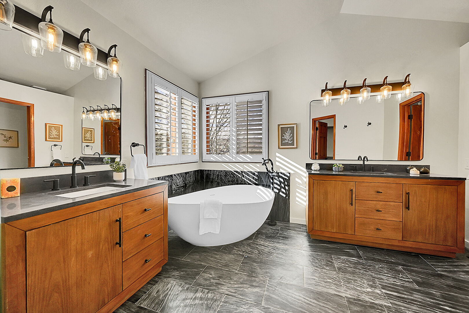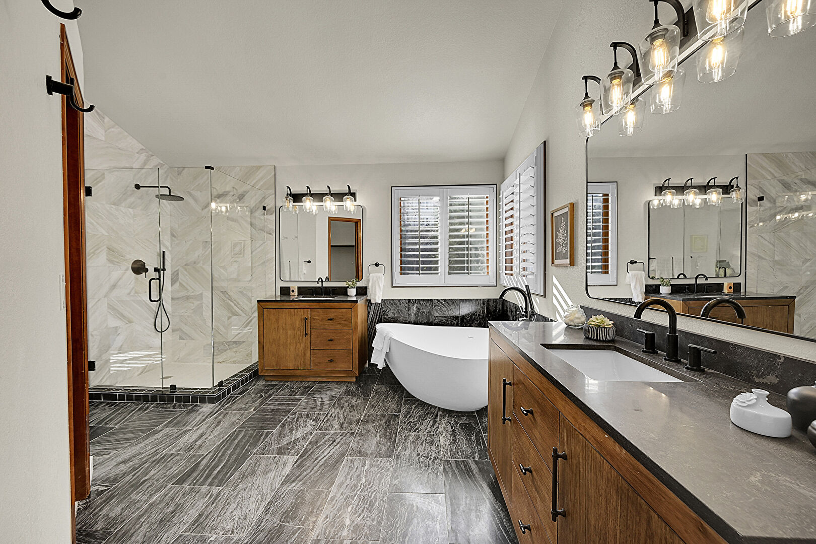 Drywall, Full Bathroom, Marble Finish Floor, Natural Light, Tile Wall, Vaulted Ceiling, Two Single Vanities
