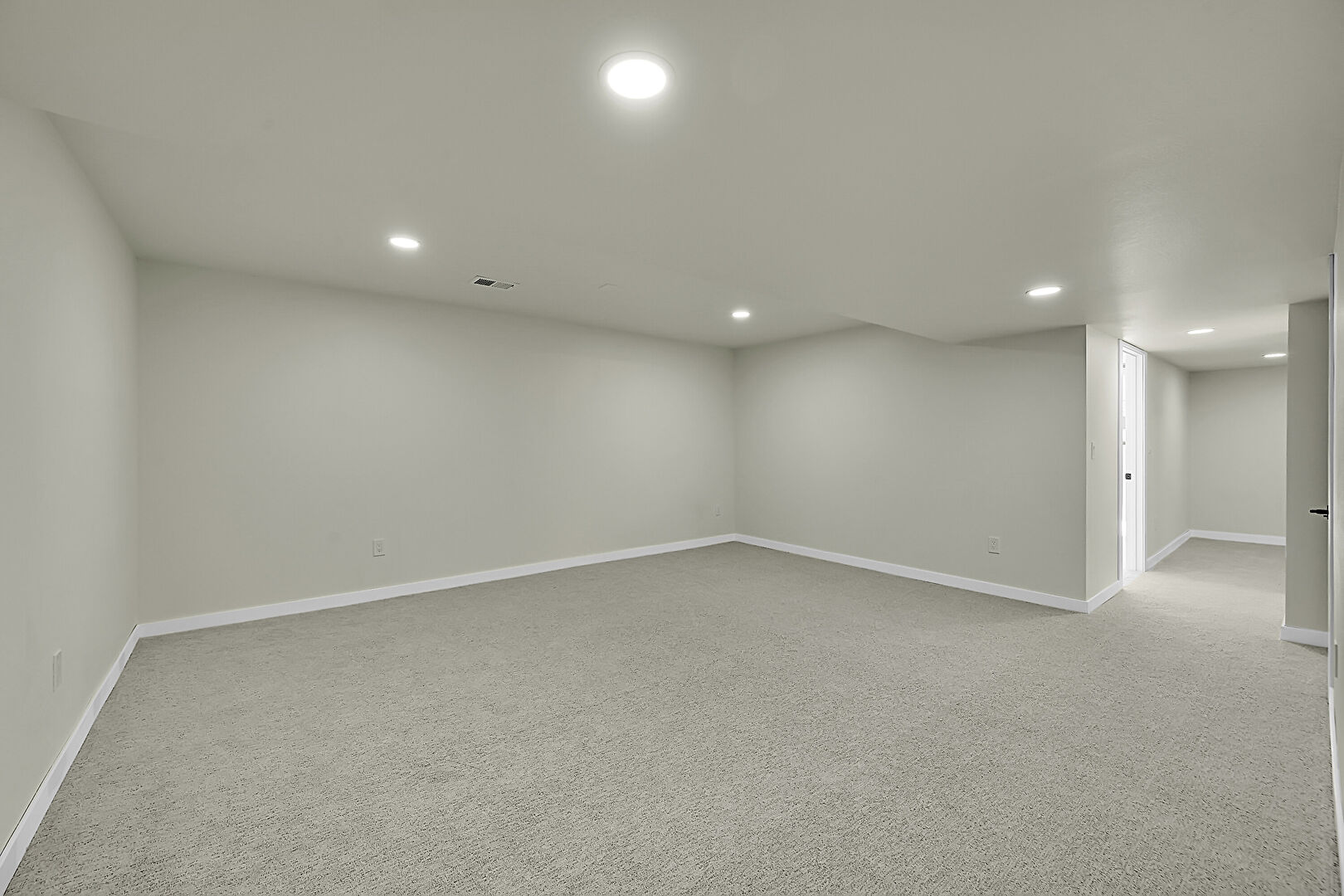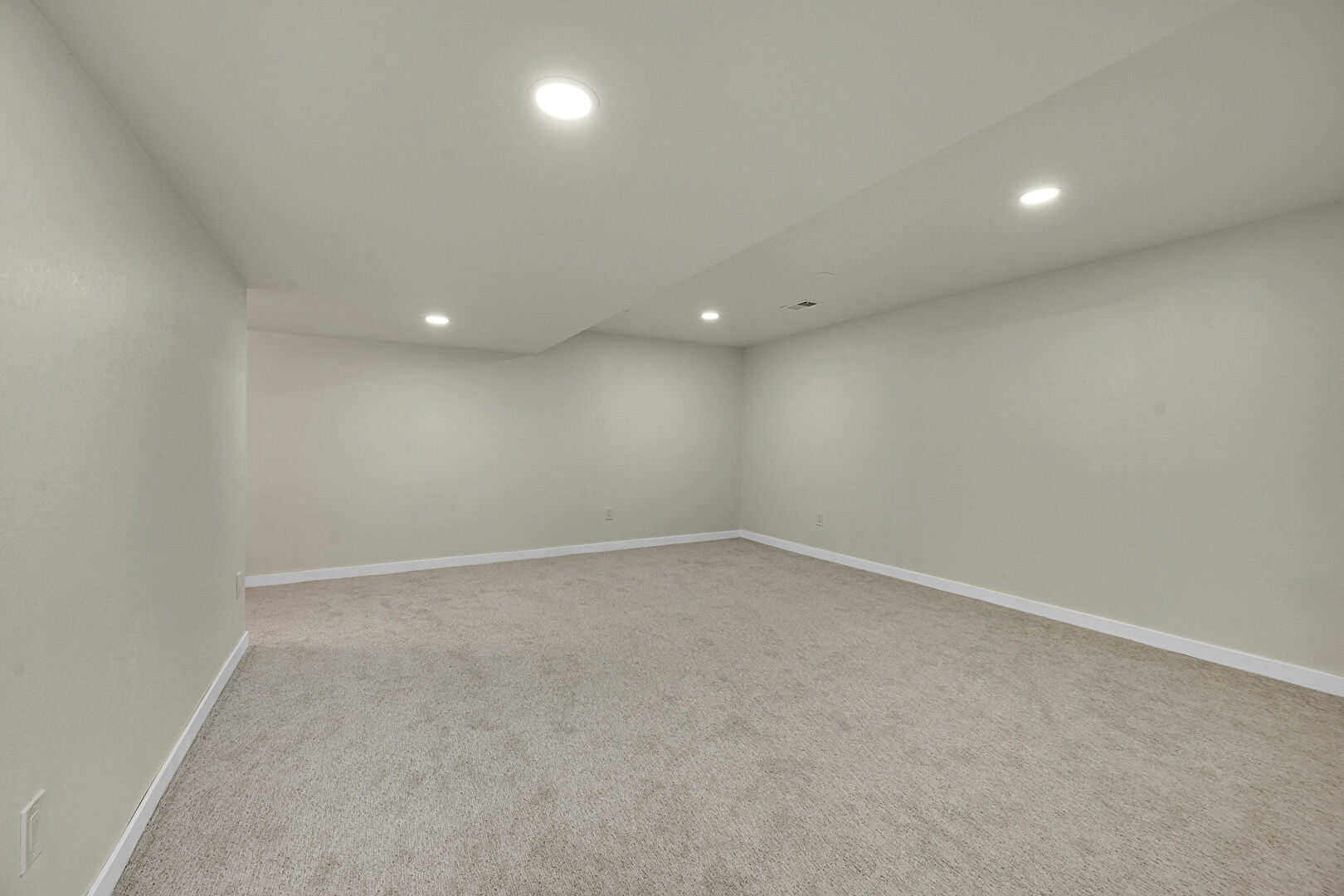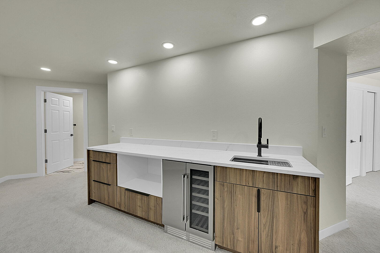 Baseboards Wall, Basement, Carpet, Drywall, Indoor Bar, Recessed Lighting, Shaker Cabinets, Stone Countertops, Vent, Wine Cooler, Baseboards Wall, Carpet, Drywall, Recessed Lighting