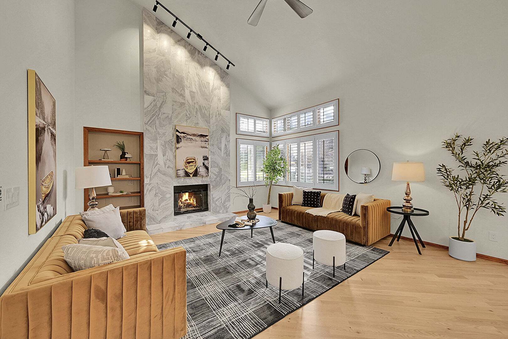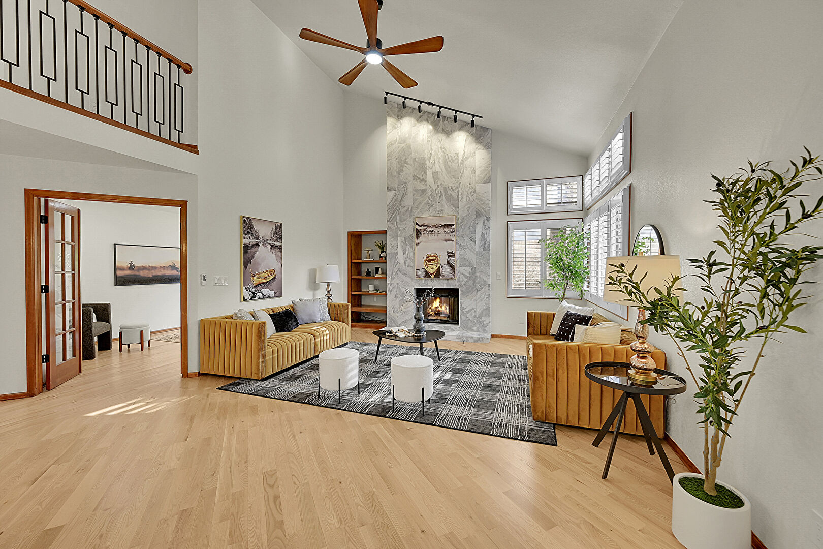 Baseboards Wall, Ceiling Fan, Double Oven, Drywall, Fireplace, French Doors, G Shaped Kitchen, High Ceiling, Natural Light, Recessed Lighting, Vaulted Ceiling, Wood Finish Floor, Baseboards Wall, Natural Light, Track Lighting