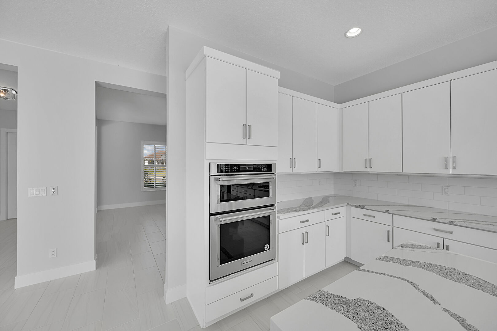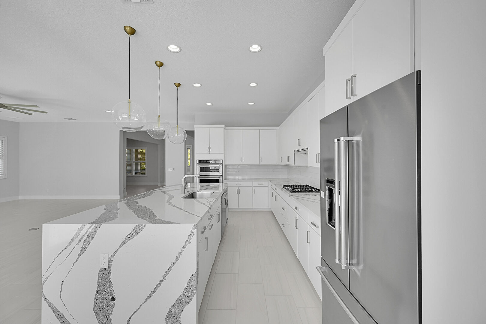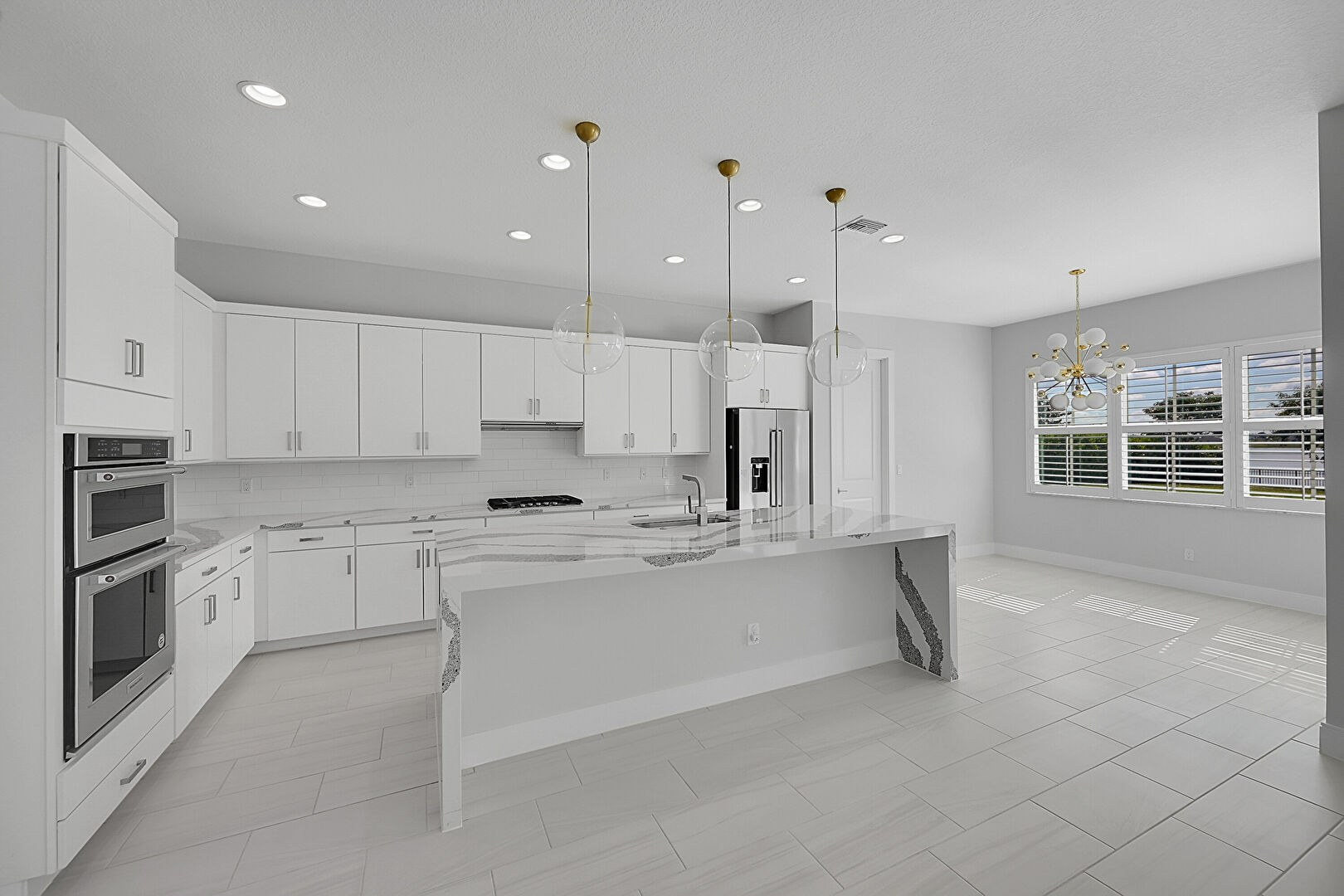 Baseboards Wall, Ceiling Fan, Double Oven, Drywall, Flat Panel Cabinets, Kitchen Bar, Kitchen Island, L Shaped Kitchen, Natural Light, Notable Chandelier, Opens To Living Area, Pendant Lighting, Recessed Lighting, Shaker Cabinets, Stone Countertops, Tile Floor, Vent, Baseboards Wall, Recessed Lighting, Stone Countertops, Tile Floor