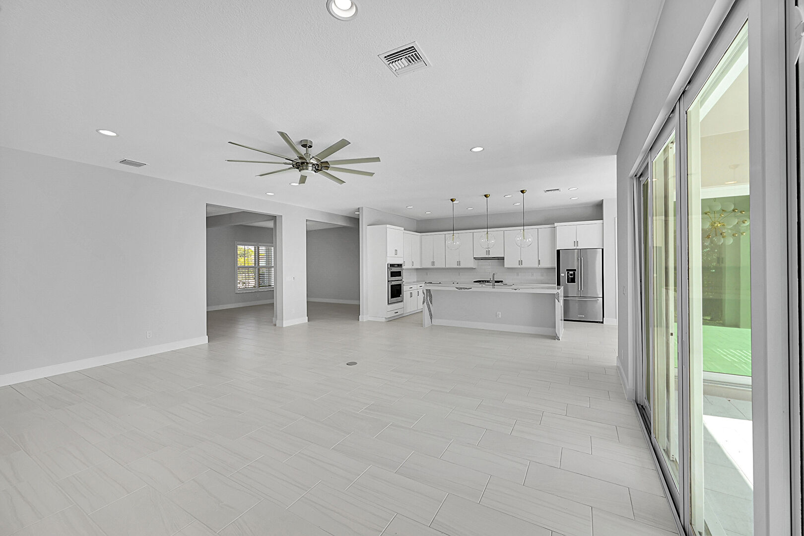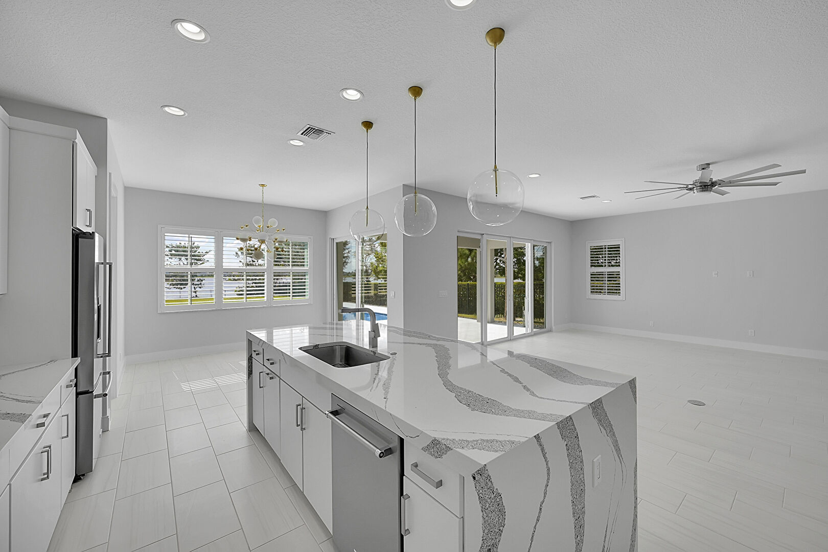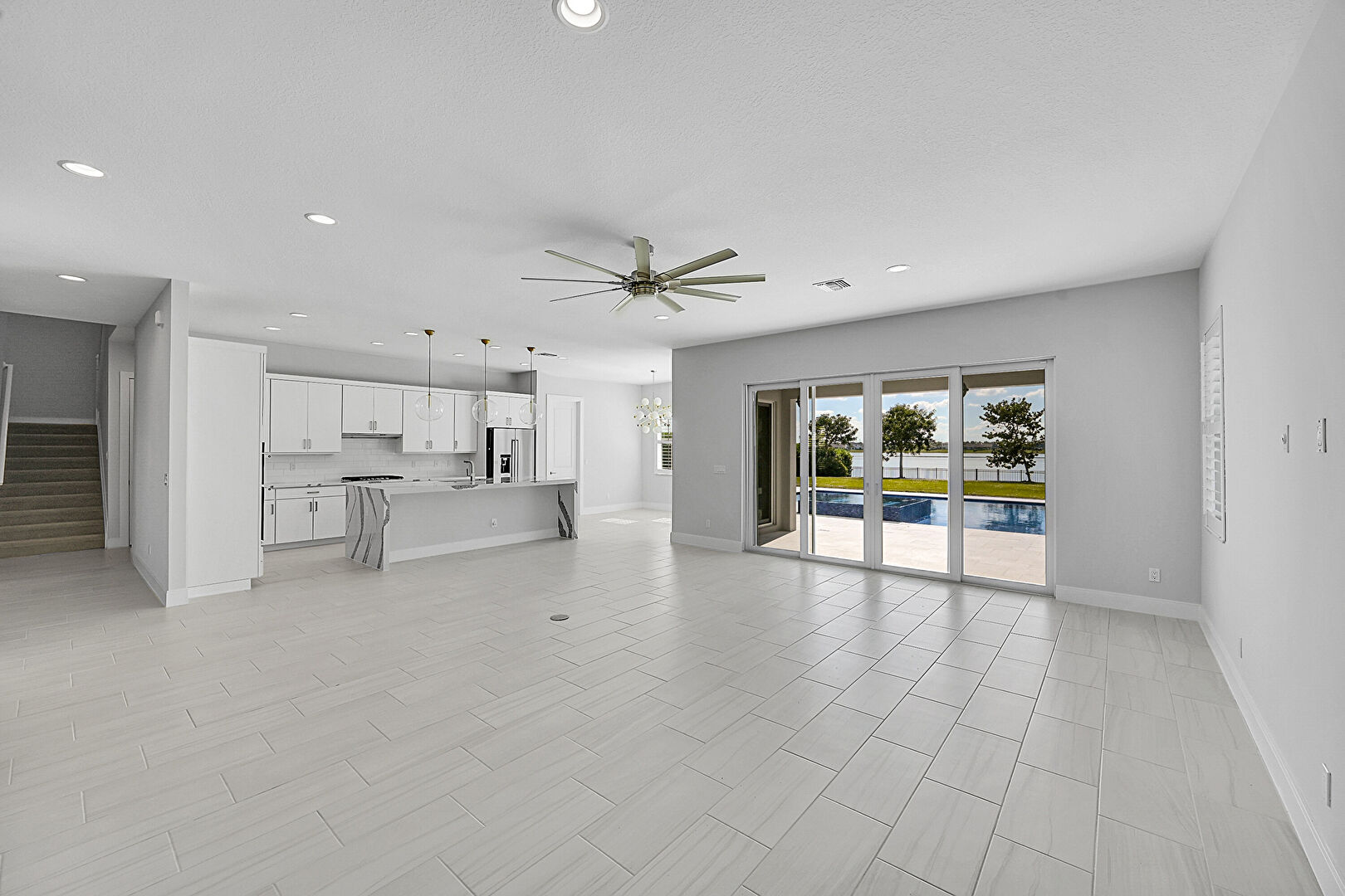 Baseboards Wall, Ceiling Fan, Double Oven, Drywall, L Shaped Kitchen, Natural Light, One Wall Kitchen, Recessed Lighting, Stairs, Vent, Natural Light, Pool View