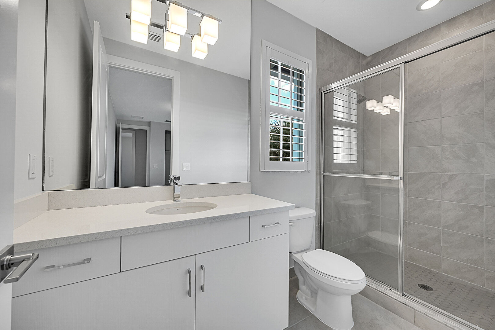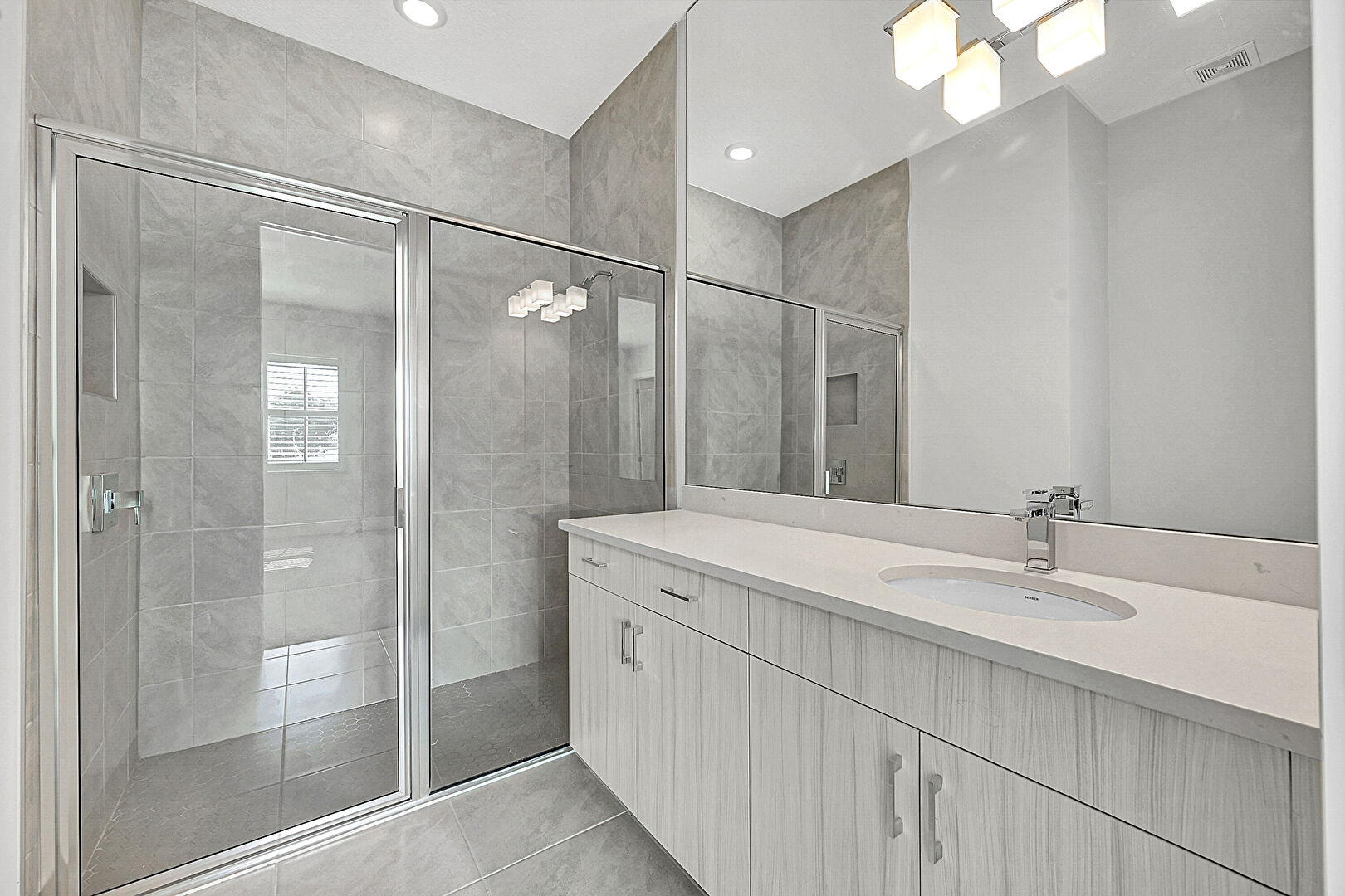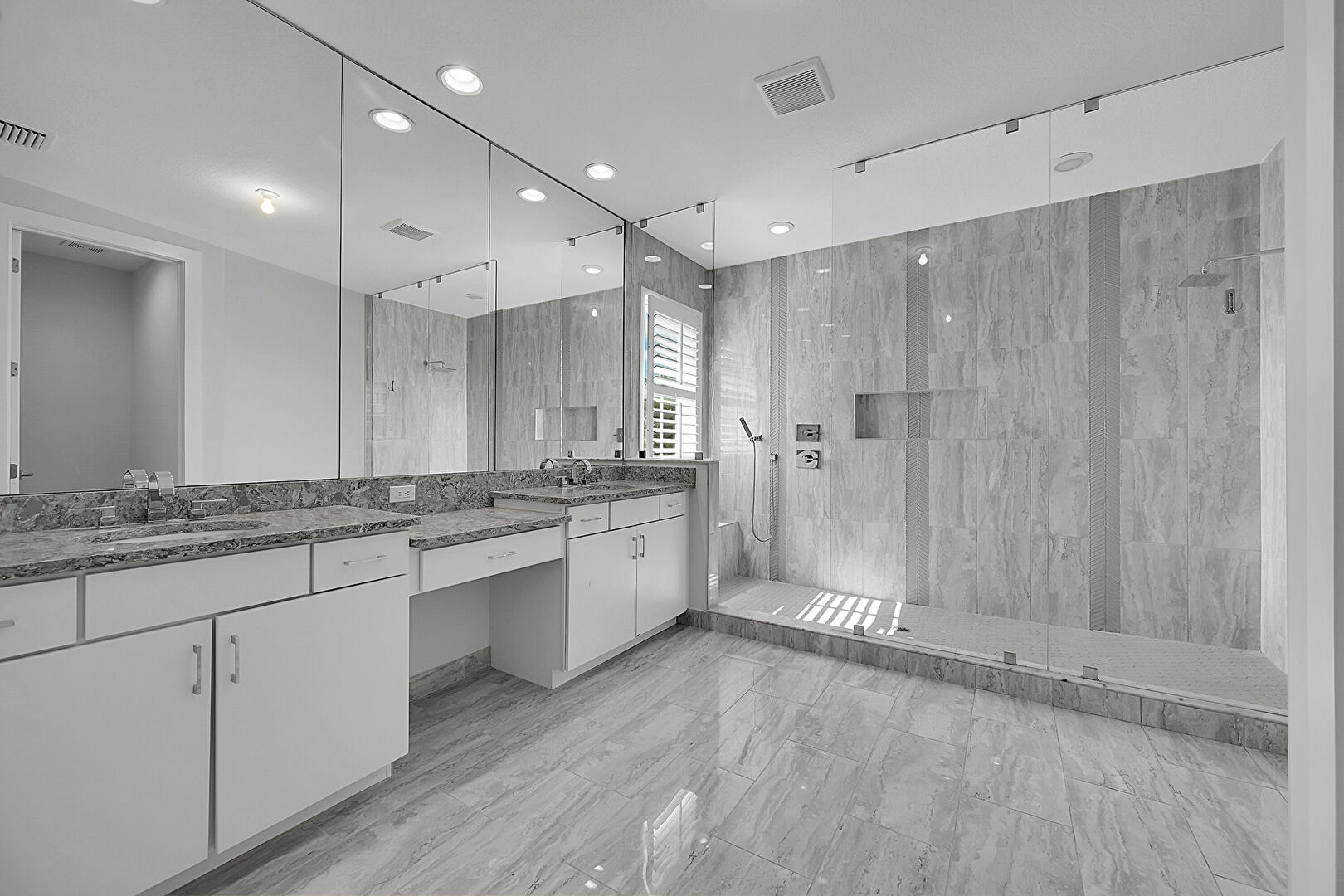 Double Vanity, Drywall, Full Bathroom, Marble Finish Floor, Natural Light, Vent, Recessed Lighting