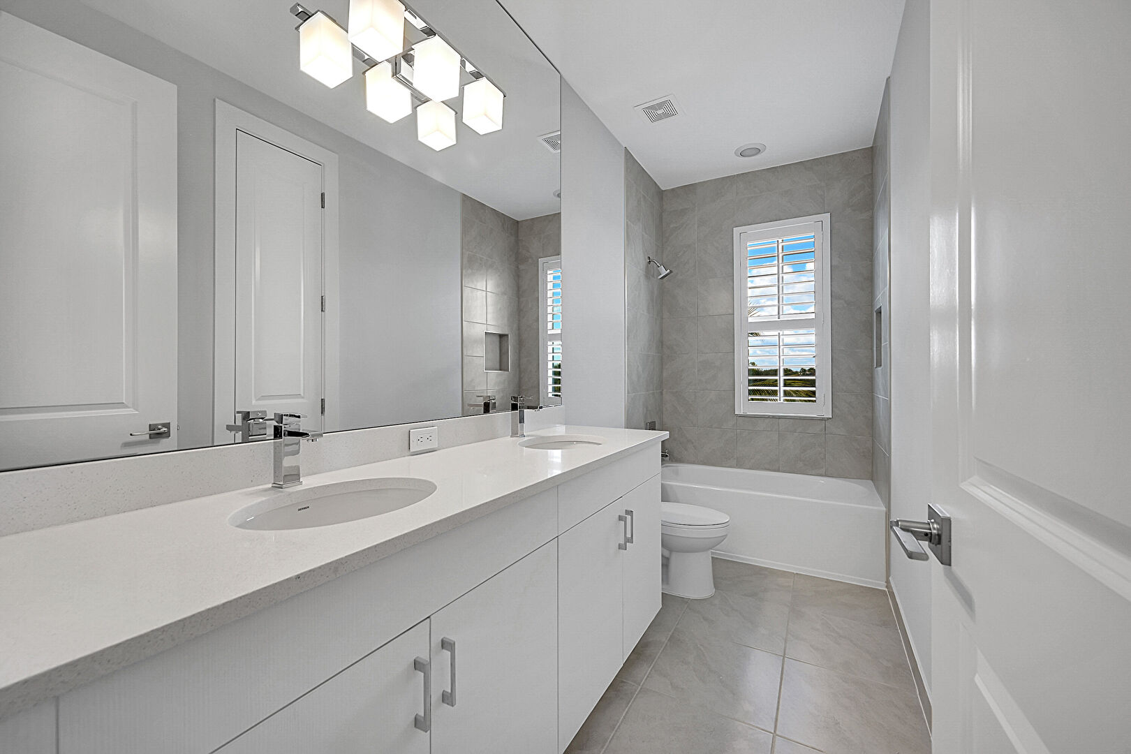Combined Bath Shower, Double Vanity, Drywall, Full Bathroom, Tile Floor, Vent, Natural Light