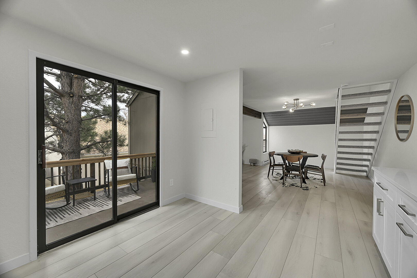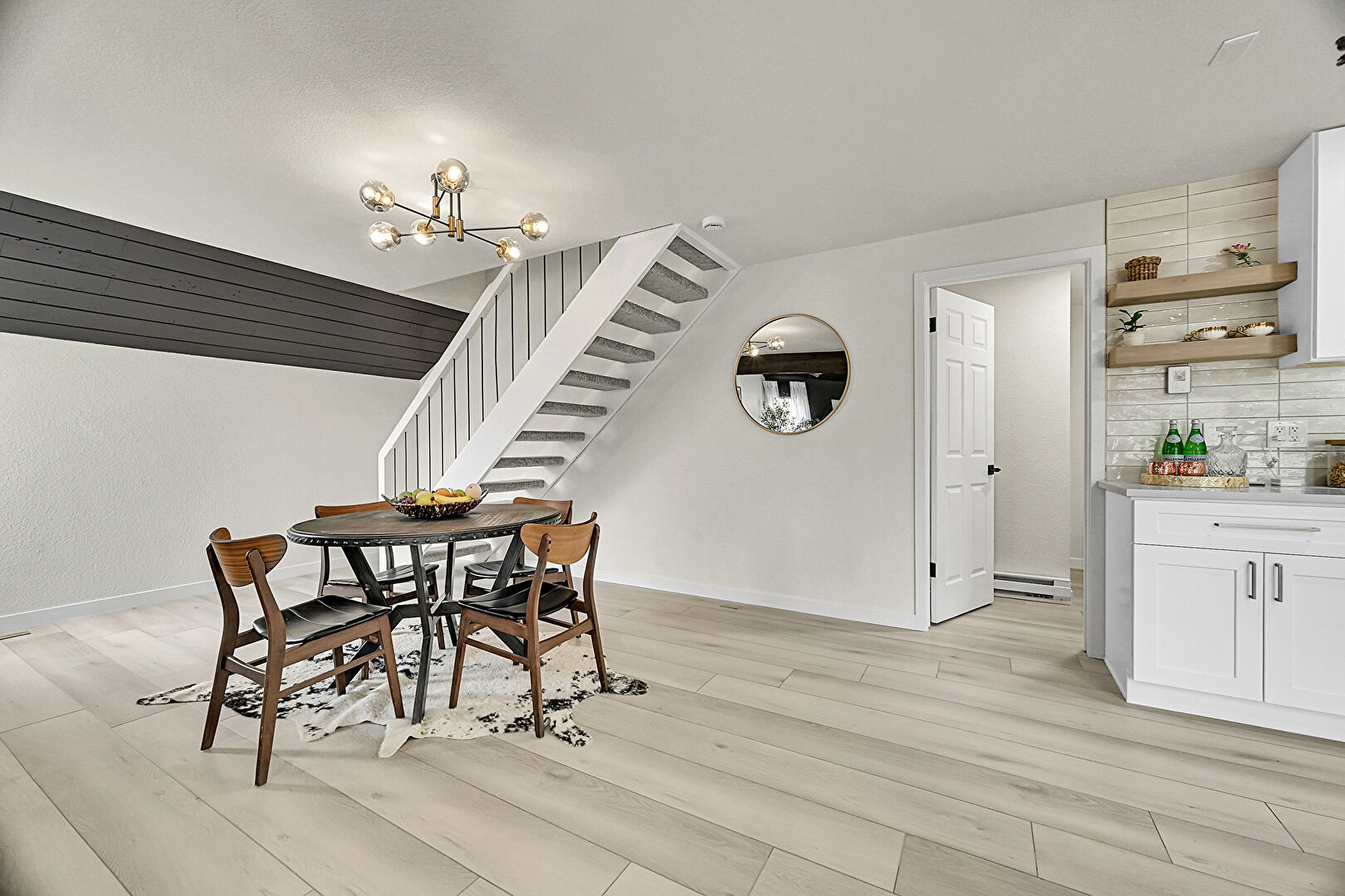 Baseboards Wall, Drywall, Electric Panel, Natural Light, Open Shelves, Recessed Lighting, Shaker Cabinets, Stone Countertops, Wood Finish Floor, Baseboards Wall, Notable Chandelier, Shaker Cabinets, Wood Finish Floor