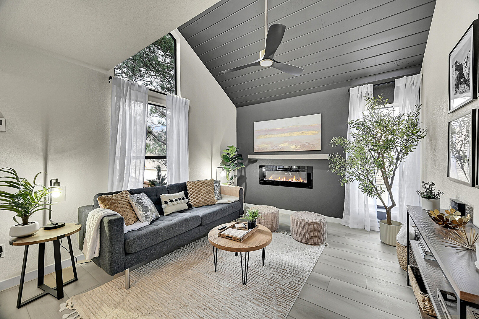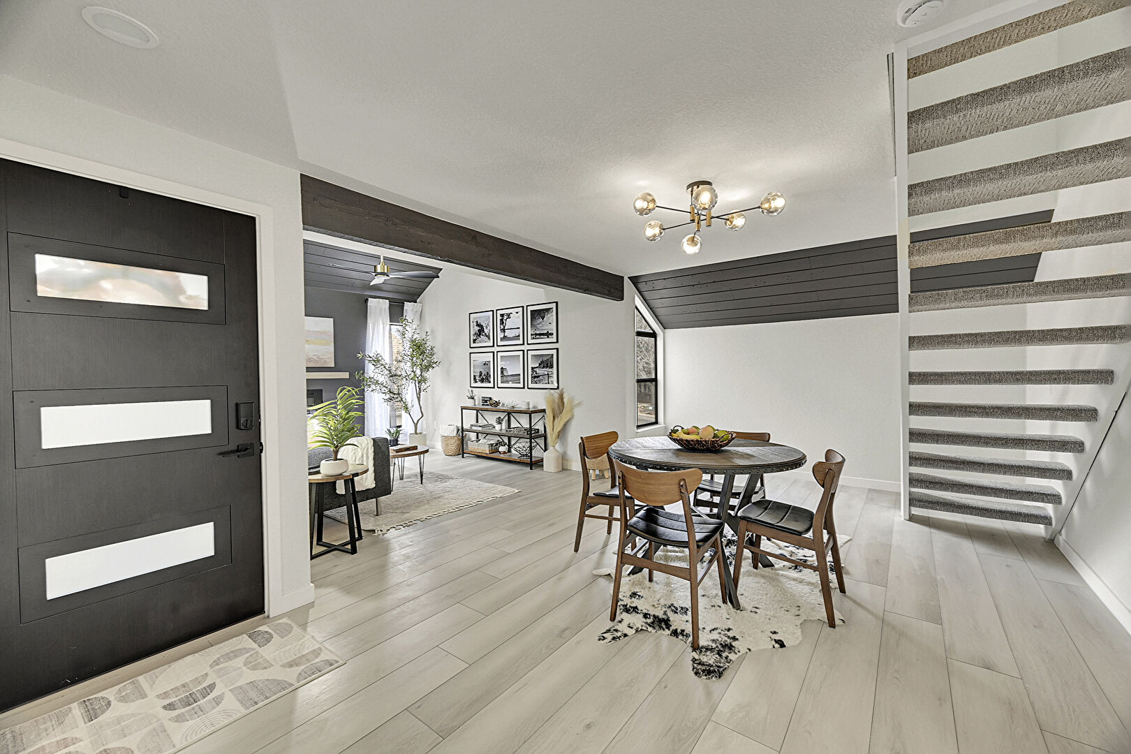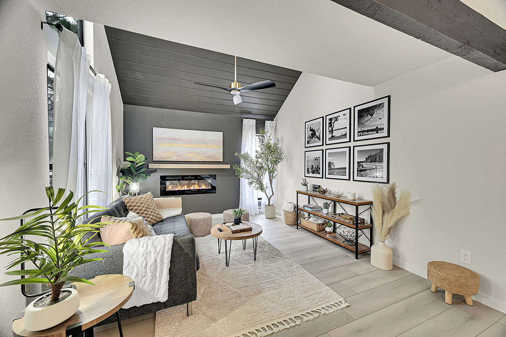 Baseboards Wall, Beamed Ceiling, Ceiling Fan, Drywall, Fireplace, High Ceiling, Natural Light, Notable Chandelier, Stairs, Vaulted Ceiling, Wood Ceiling, Wood Finish Floor, Baseboards Wall, Ceiling Fan, Fireplace