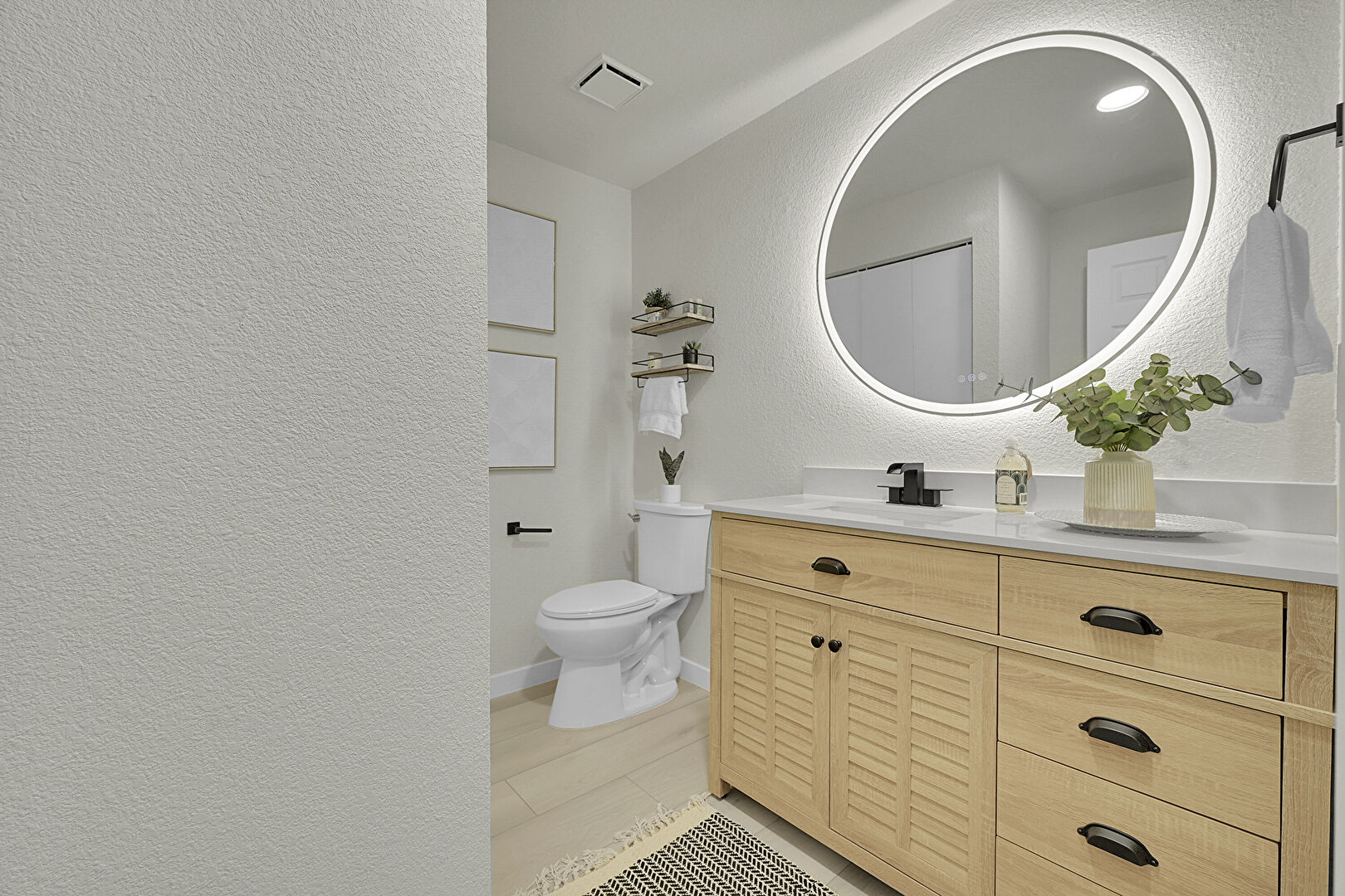 Baseboards Wall, Carpet, Combined Bath Shower, Full Bathroom, Recessed Lighting, Textured Wall, Tile Floor, Vanity, Vent, Full Bathroom, Textured Wall, Vanity