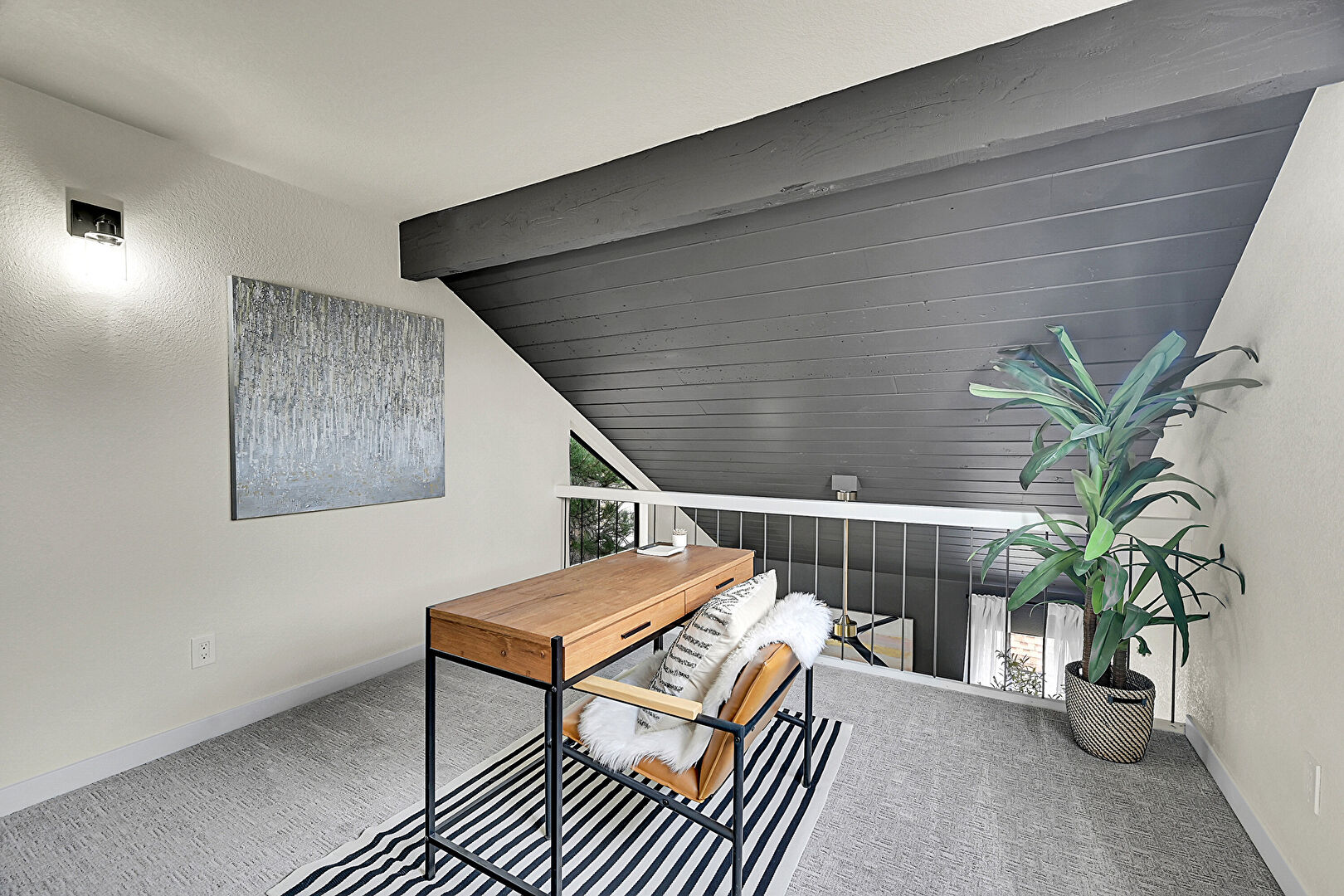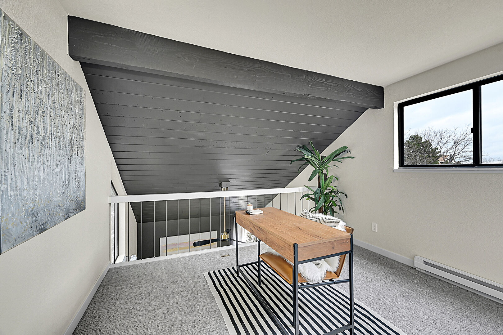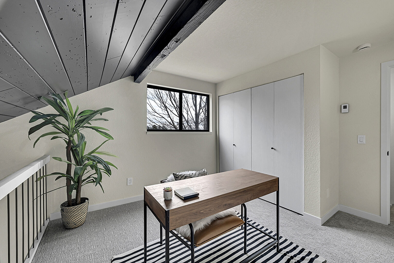 Baseboard Radiator, Baseboards Wall, Beamed Ceiling, Carpet, Drywall, Natural Light, Office Area, Smoke Carbon Monoxide Detector, Vaulted Ceiling, Wood Ceiling, Cathedral Ceiling, Natural Light, Textured Wall