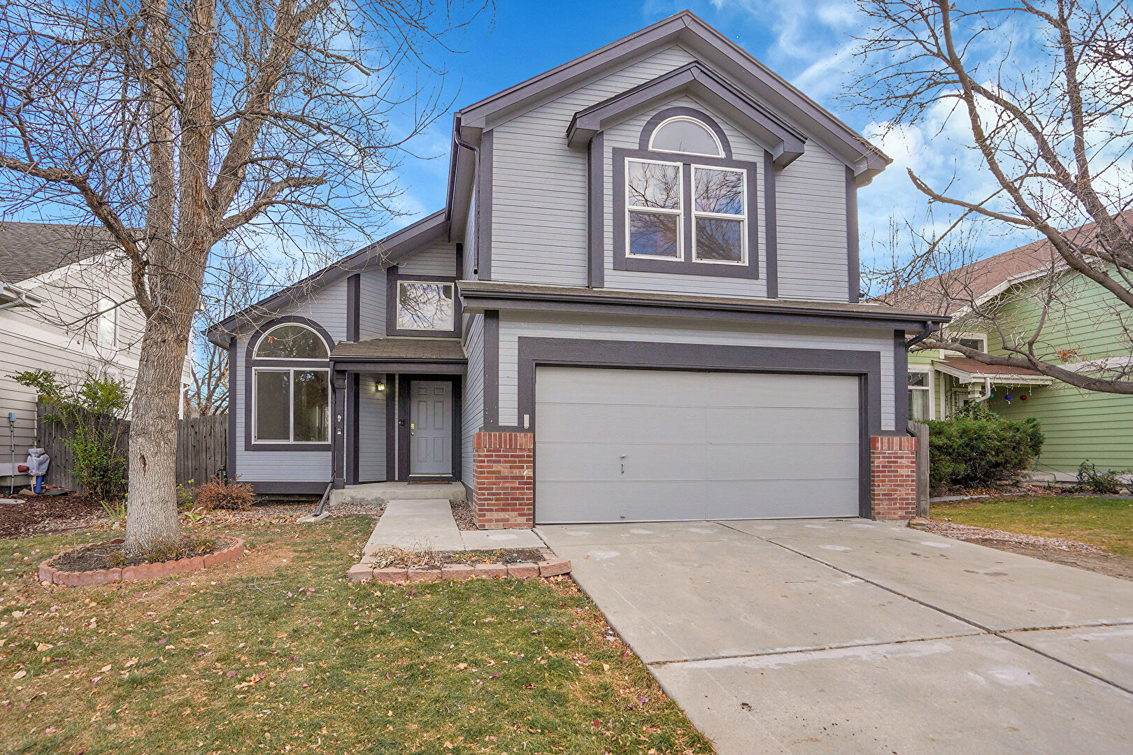 Brick Siding, Built In Garage, Downspout, Driveway, Fence, Gutters, Horizontal Siding, Lawn, Stoop, Downspout, Stoop