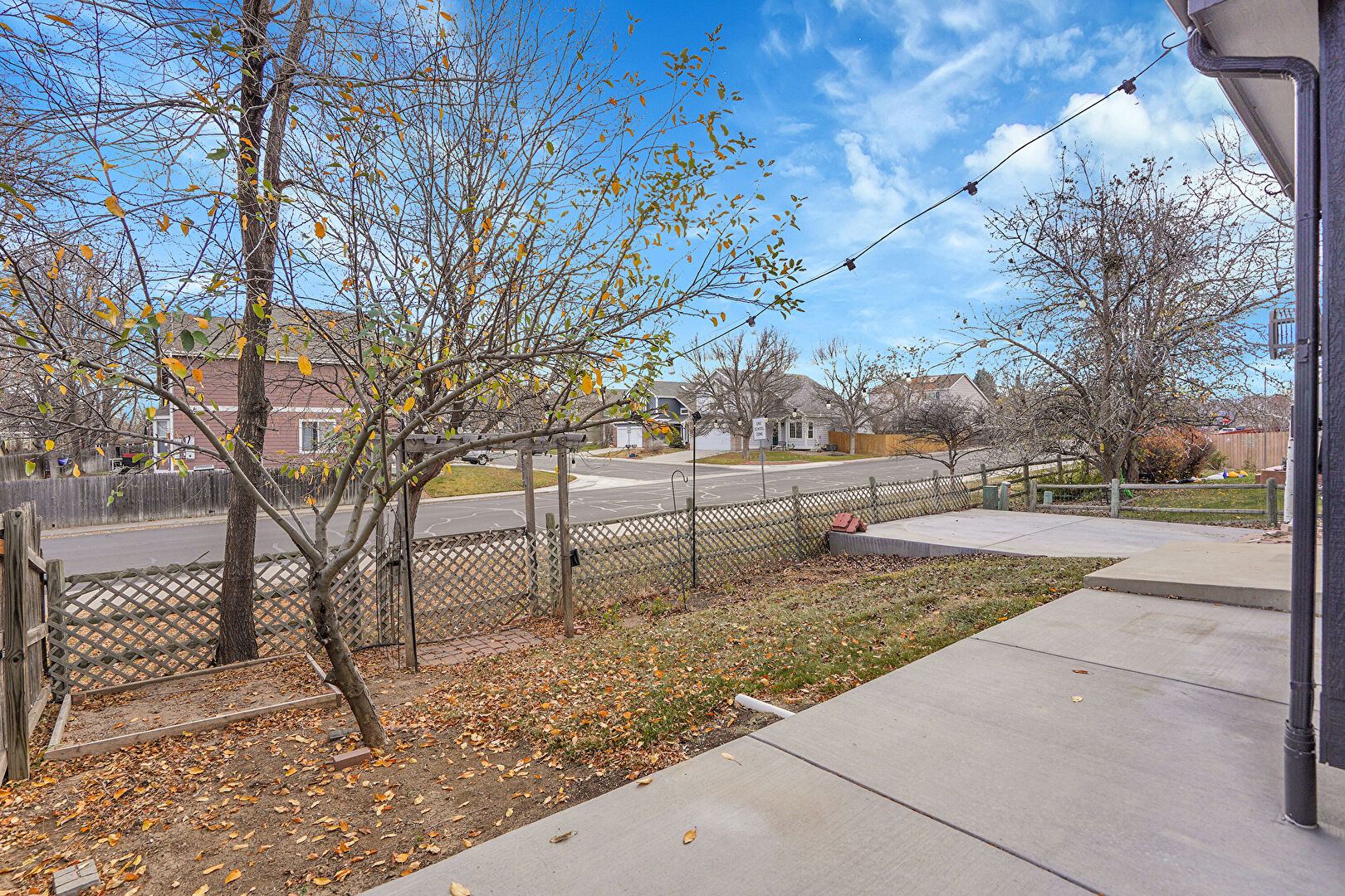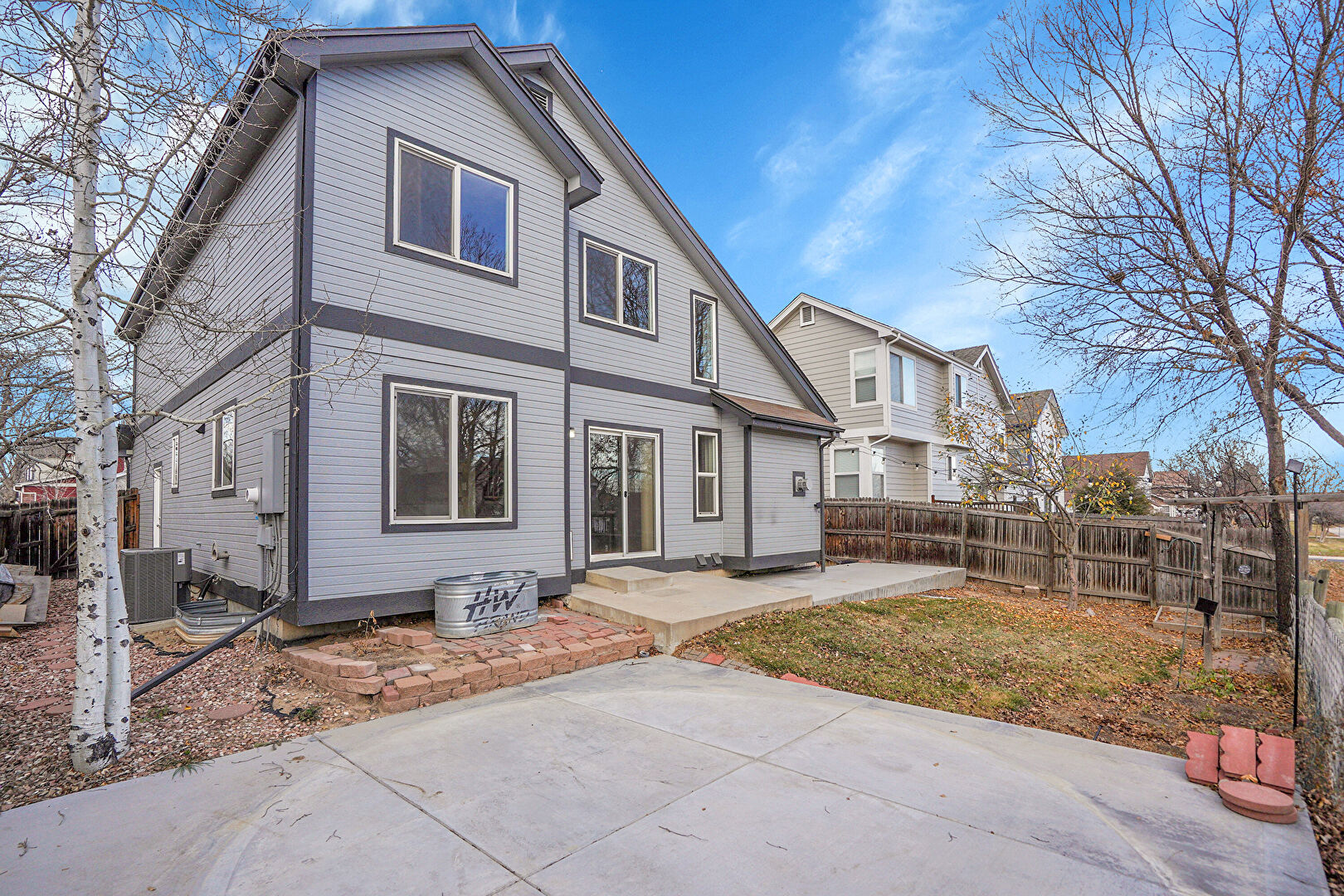 Central Ac, Concrete Foundation, Downspout, Fence, Gutters, Horizontal Siding, Lawn, Patio, Residential View, Fence, Lawn