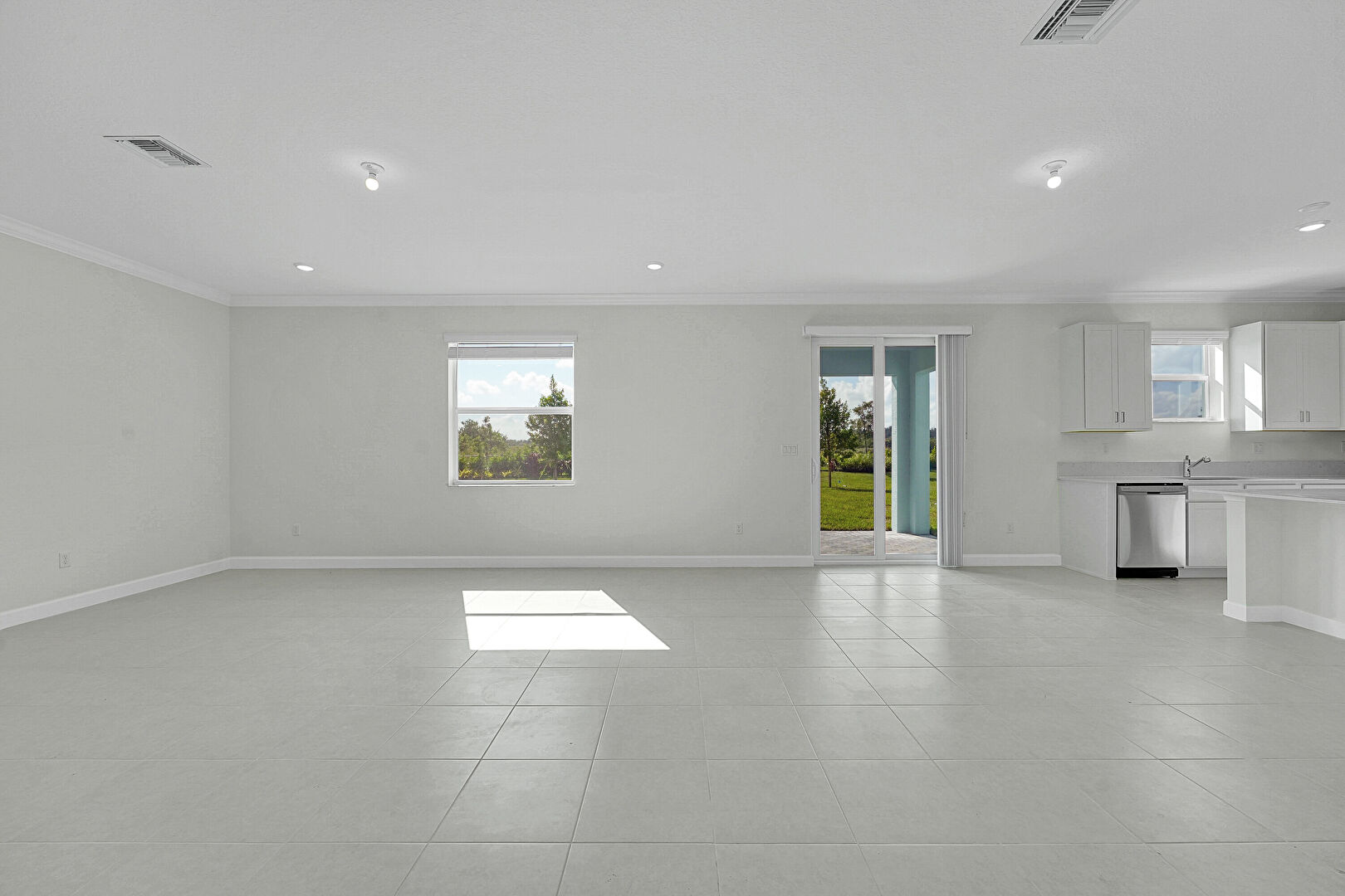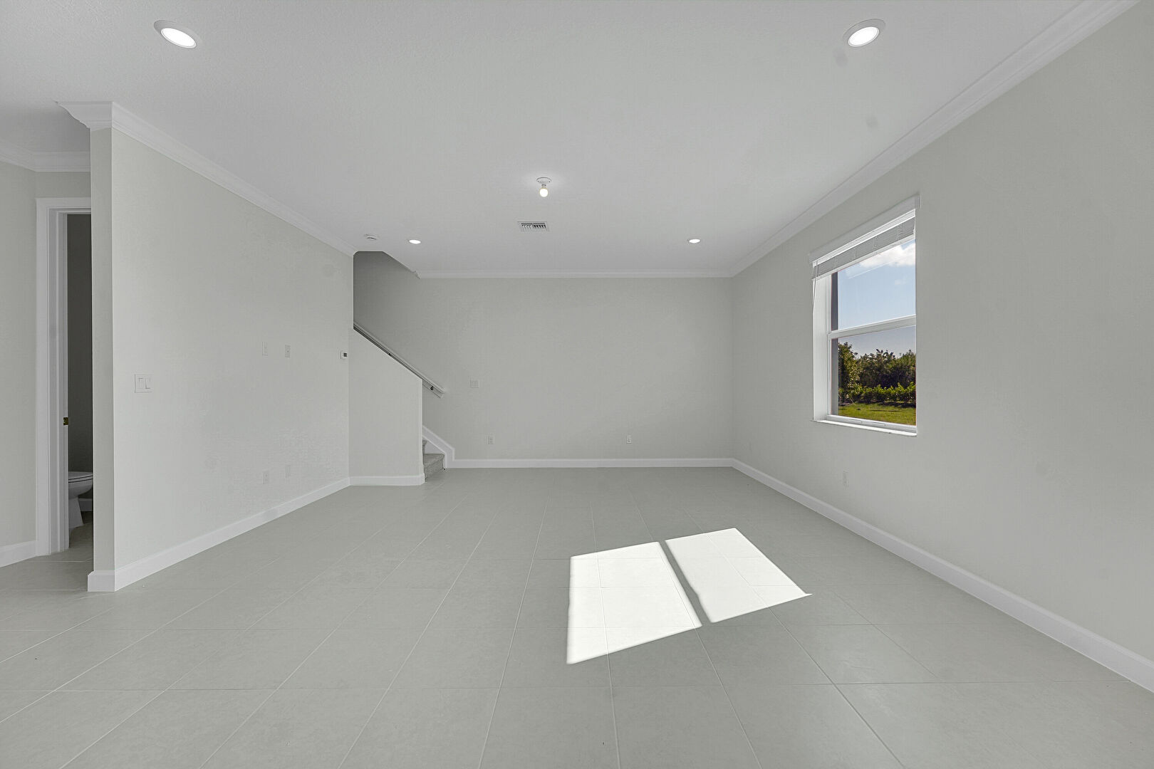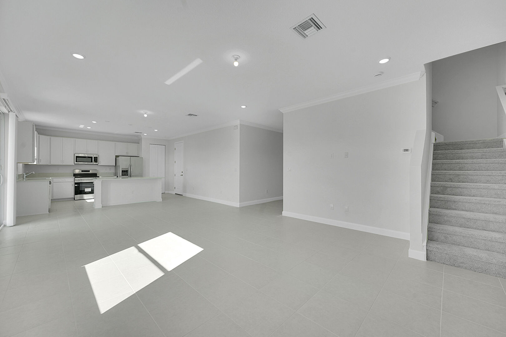 Baseboards Wall, Crown Molding, Drywall, L Shaped Kitchen, Natural Light, Recessed Lighting, Stairs, Tile Floor, Vent, Drywall, Stairs, Vent