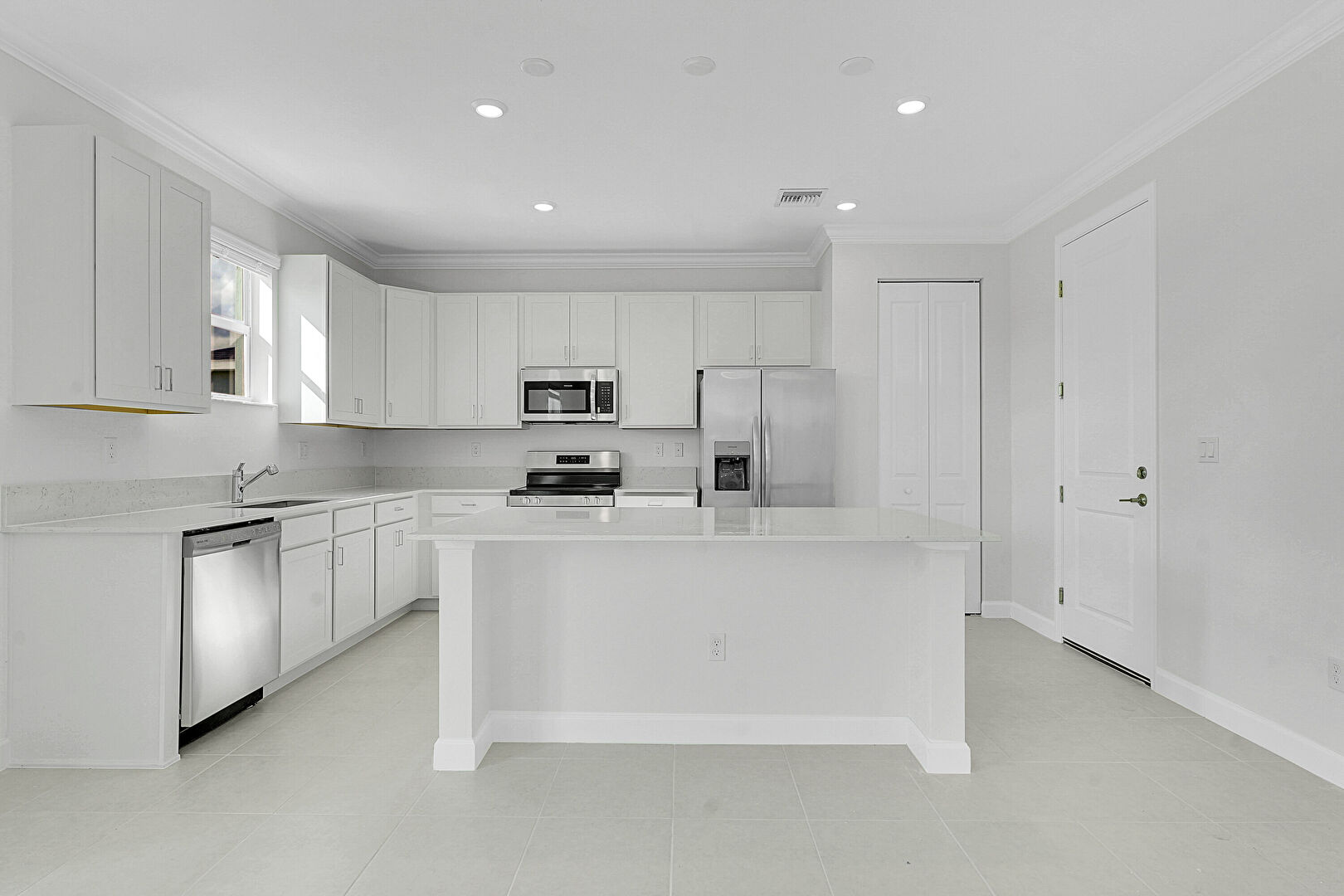 Baseboards Wall, Crown Molding, Crown Molding Cabinets, Drywall, Kitchen Bar, Kitchen Island, L Shaped Kitchen, Natural Light, Shaker Cabinets, Stone Countertops, Tile Floor, Vent, Natural Light, Recessed Lighting