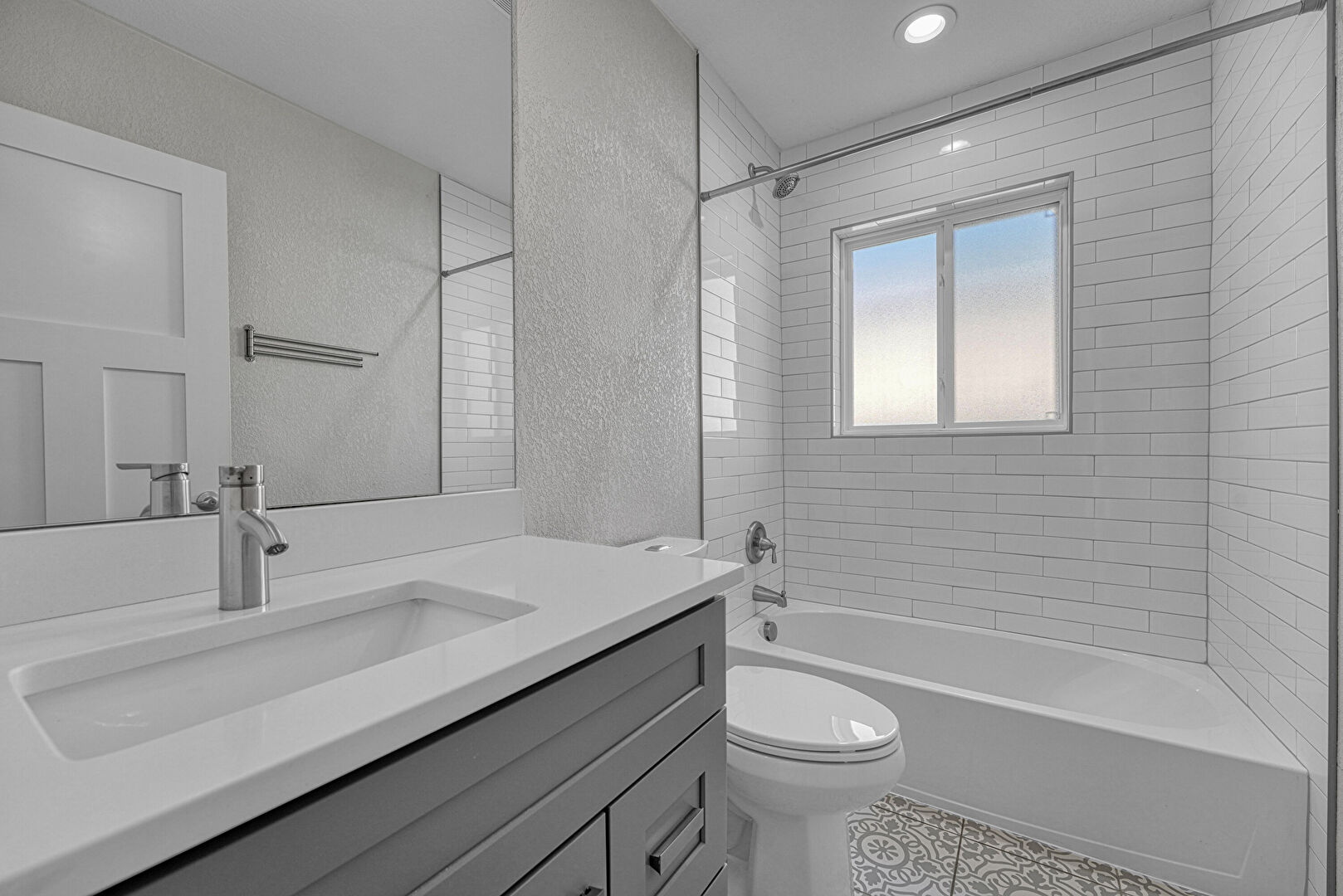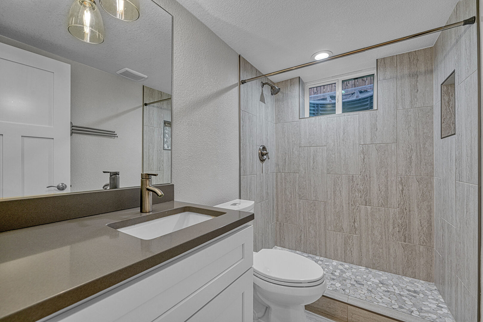 Combined Bath Shower, Full Bathroom, Recessed Lighting, Textured Ceiling, Textured Wall, Tile Floor, Vanity, Natural Light, Vent