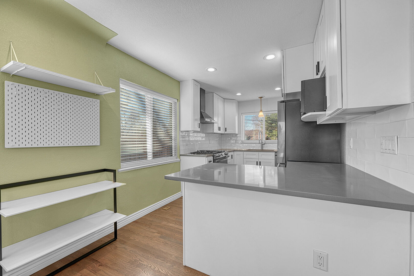Baseboards Wall, Drywall, G Shaped Kitchen, Kitchen Bar, Kitchen Peninsula, Natural Light, Pendant Lighting, Recessed Lighting, Shaker Cabinets, Stone Countertops, Wood Finish Floor, Natural Light, Shaker Cabinets, Stone Countertops
