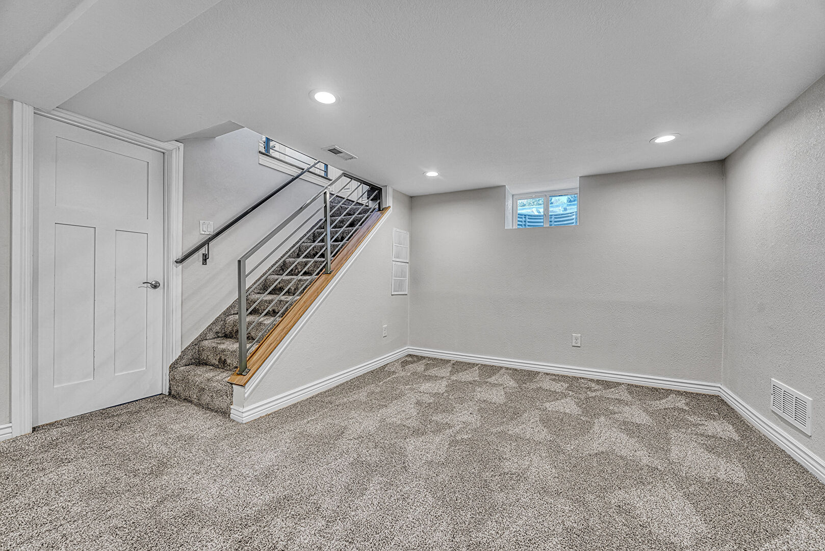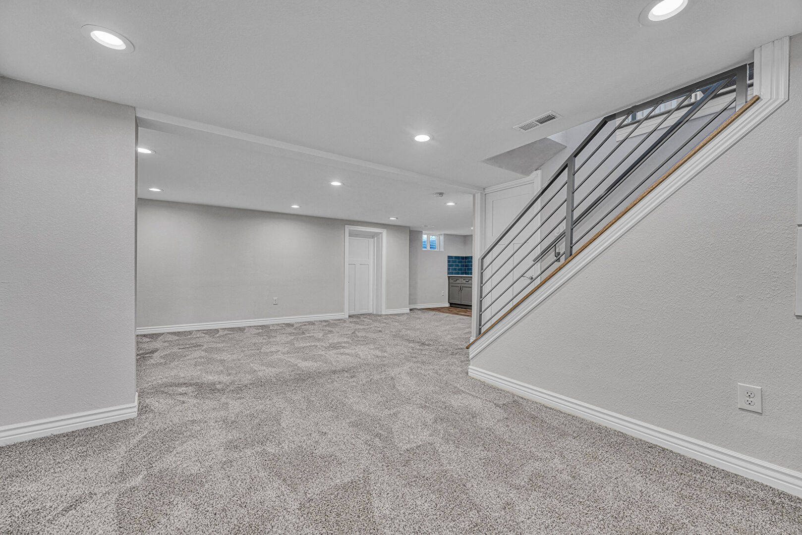 Baseboards Wall, Basement, Carpet, Drywall, Indoor Bar, Natural Light, Recessed Lighting, Smoke Carbon Monoxide Detector, Stairs, Textured Wall, Vent, Wine Cooler, Baseboards Wall, Basement, Carpet, Natural Light