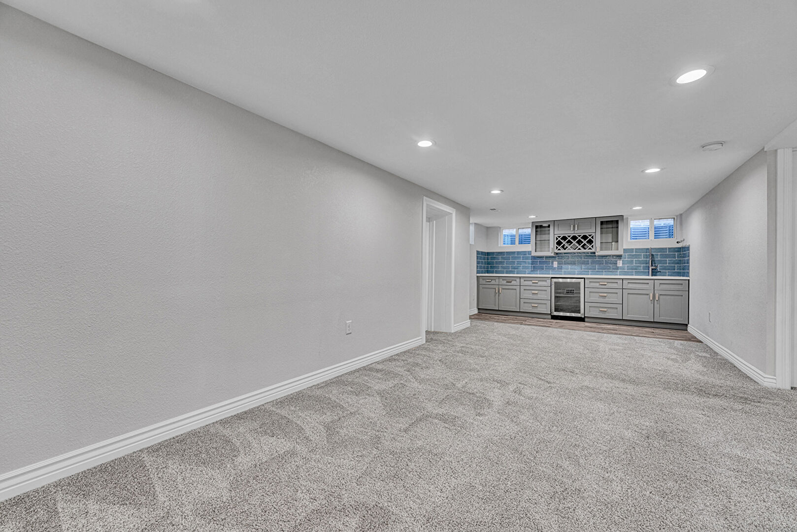 Baseboards Wall, Basement, Carpet, Drywall, Glass Insert Cabinets, Gray Cabinets, Indoor Bar, Natural Light, Recessed Lighting, Shaker Cabinets, Stone Countertops, Wine Cooler, Wood Finish Floor, Vent