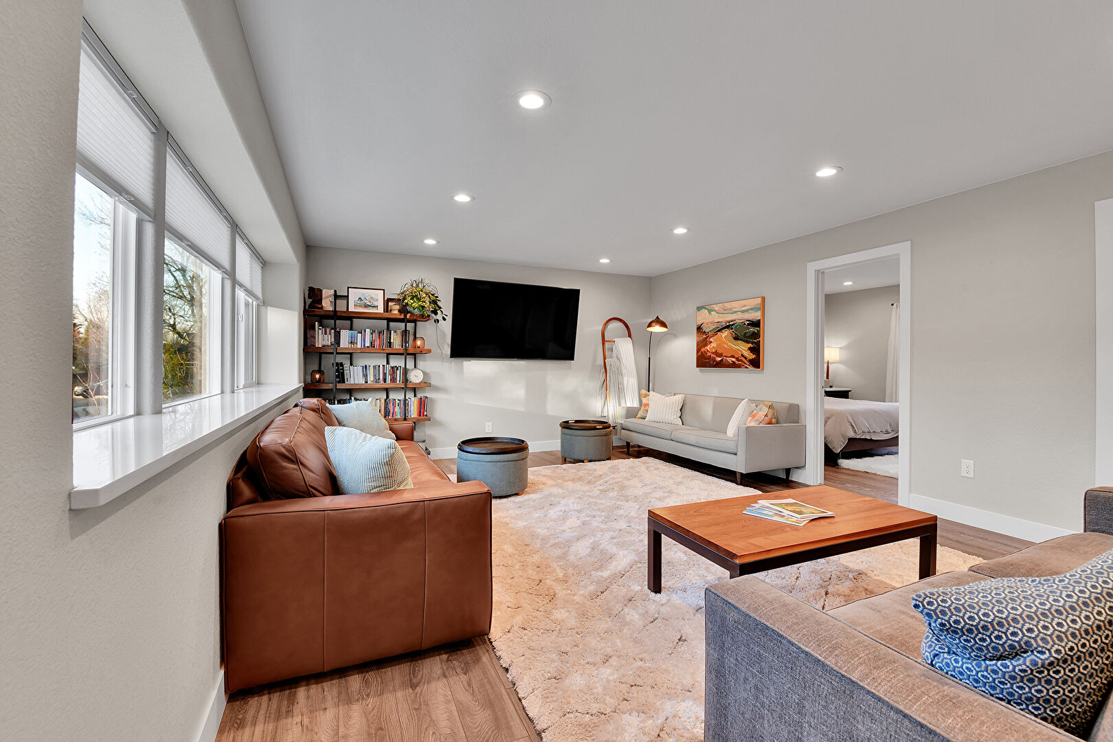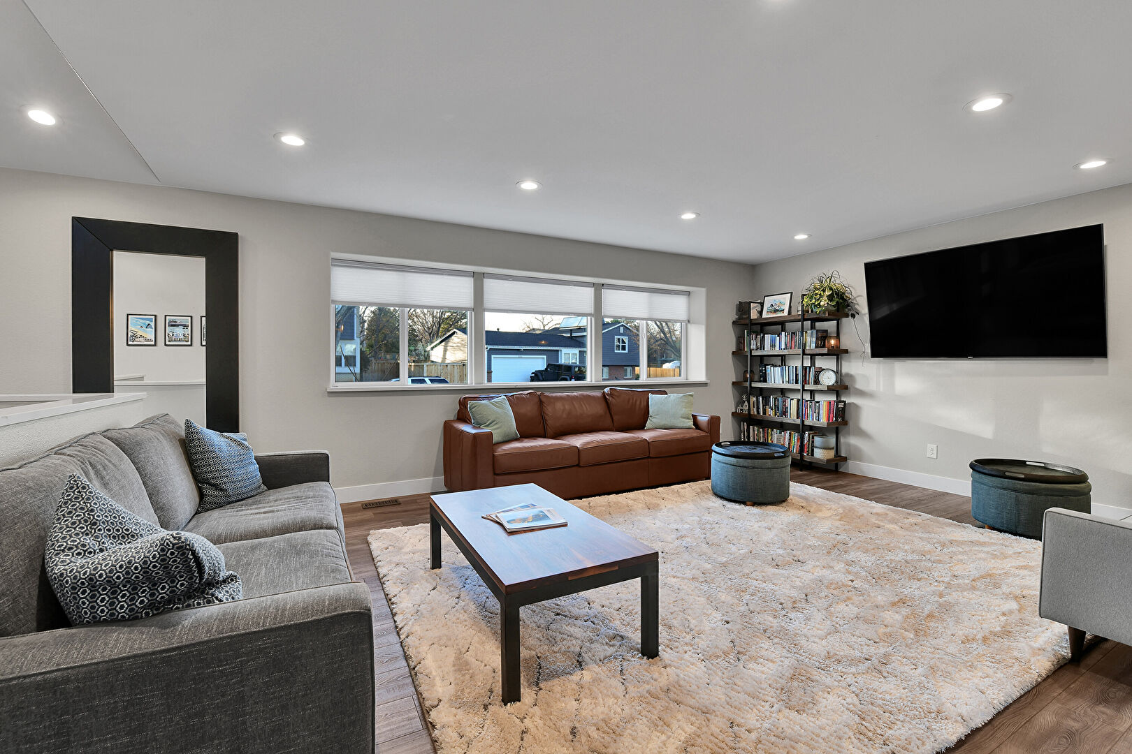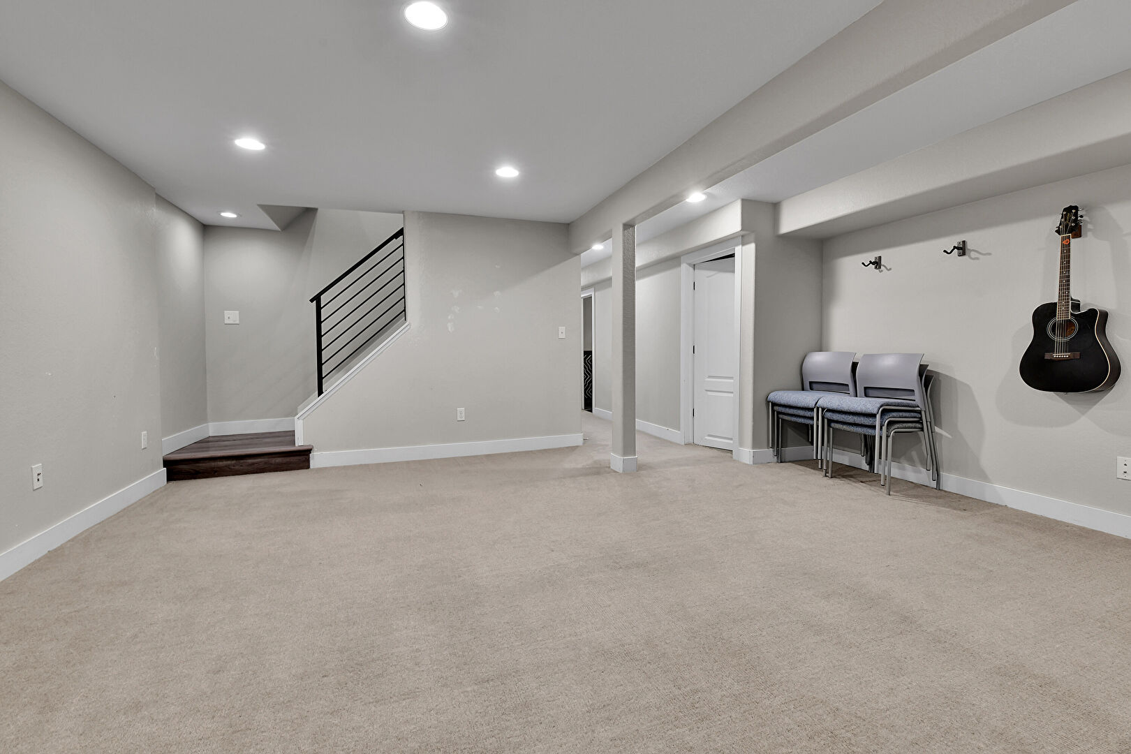 Baseboards Wall, Basement, Carpet, Drywall, Stairs, Recessed Lighting