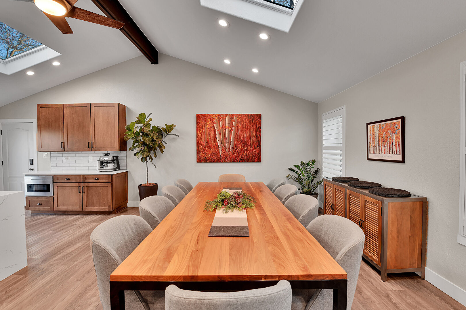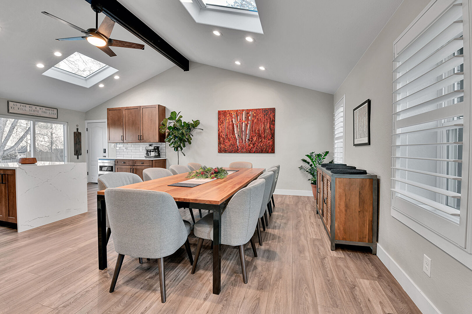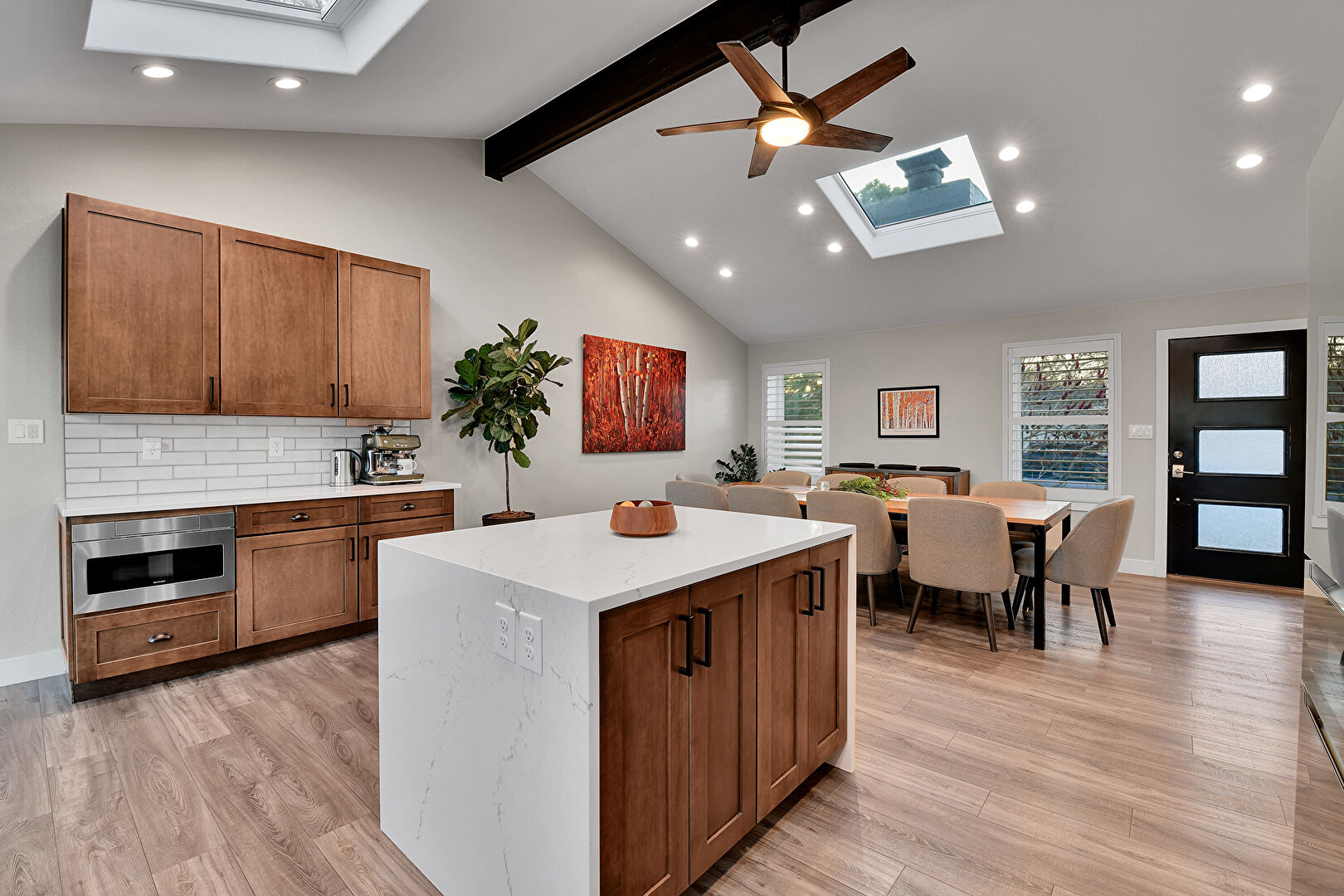 Baseboards Wall, Beamed Ceiling, Cathedral Ceiling, Ceiling Fan, Drywall, High Ceiling, L Shaped Kitchen, Natural Light, Recessed Lighting, Skylight, Vaulted Ceiling, Wood Finish Floor, Beamed Ceiling, High Ceiling, Skylight, Vaulted Ceiling