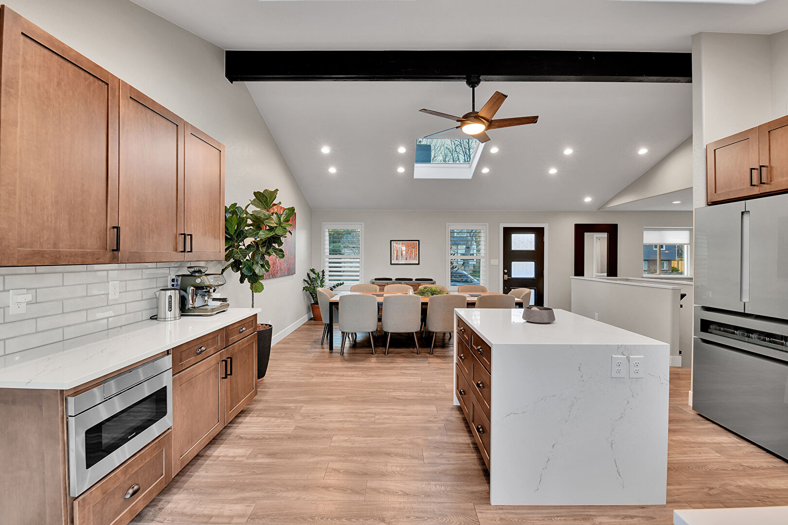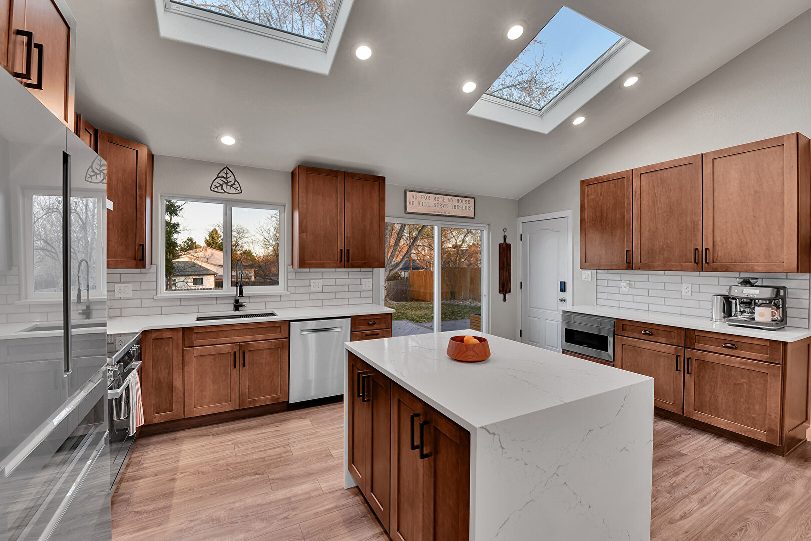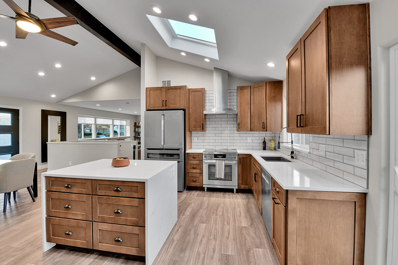 Baseboards Wall, Beamed Ceiling, Cathedral Ceiling, Ceiling Fan, Drywall, High Ceiling, Kitchen Island, L Shaped Kitchen, Medium Brown Cabinets, Natural Light, Opens To Living Area, Recessed Lighting, Shaker Cabinets, Skylight, Stone Countertops, Vaulted Ceiling, Vent, Wood Finish Floor, Medium Brown Cabinets, Natural Light, Recessed Lighting, Skylight, Stone Countertops, Vaulted Ceiling