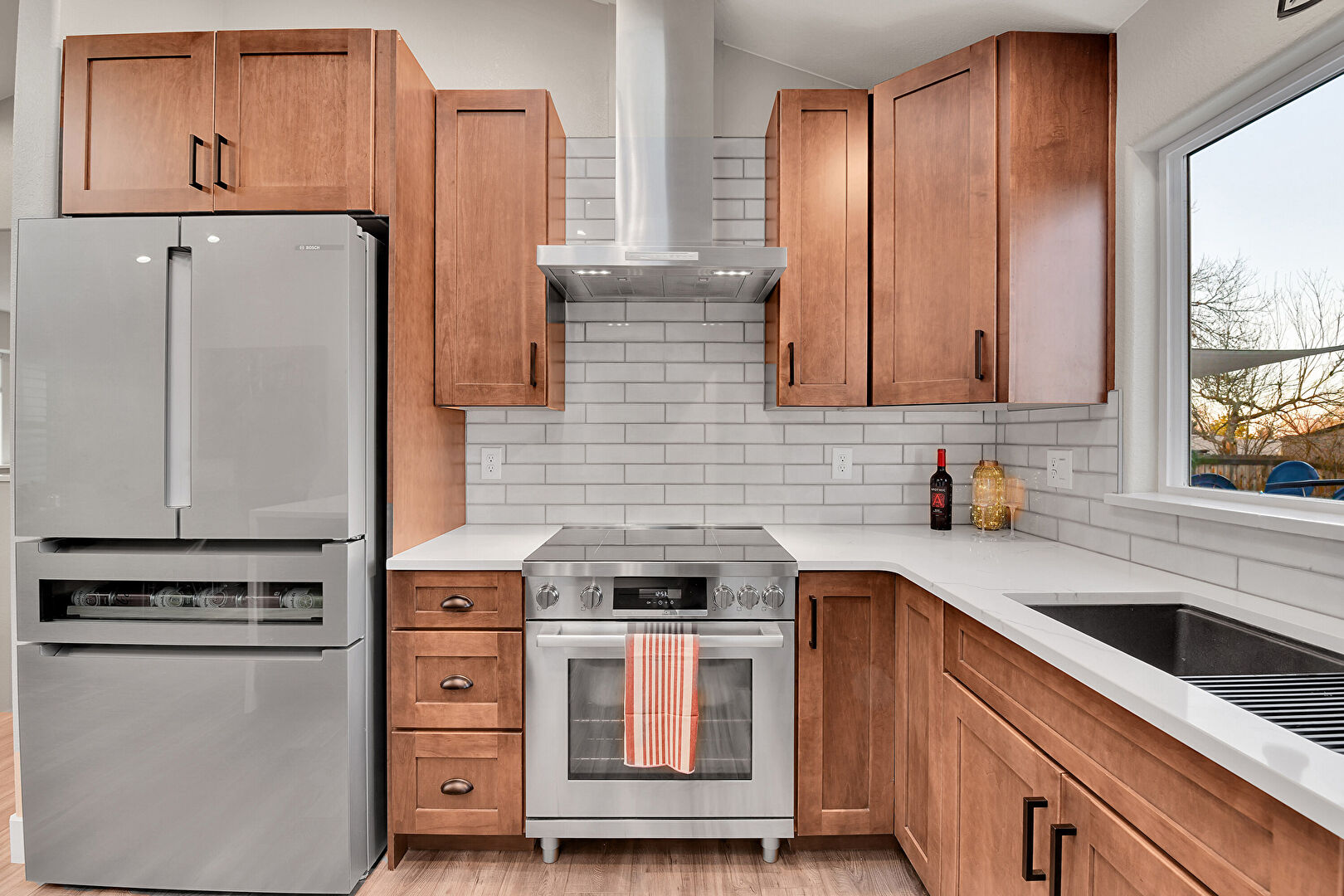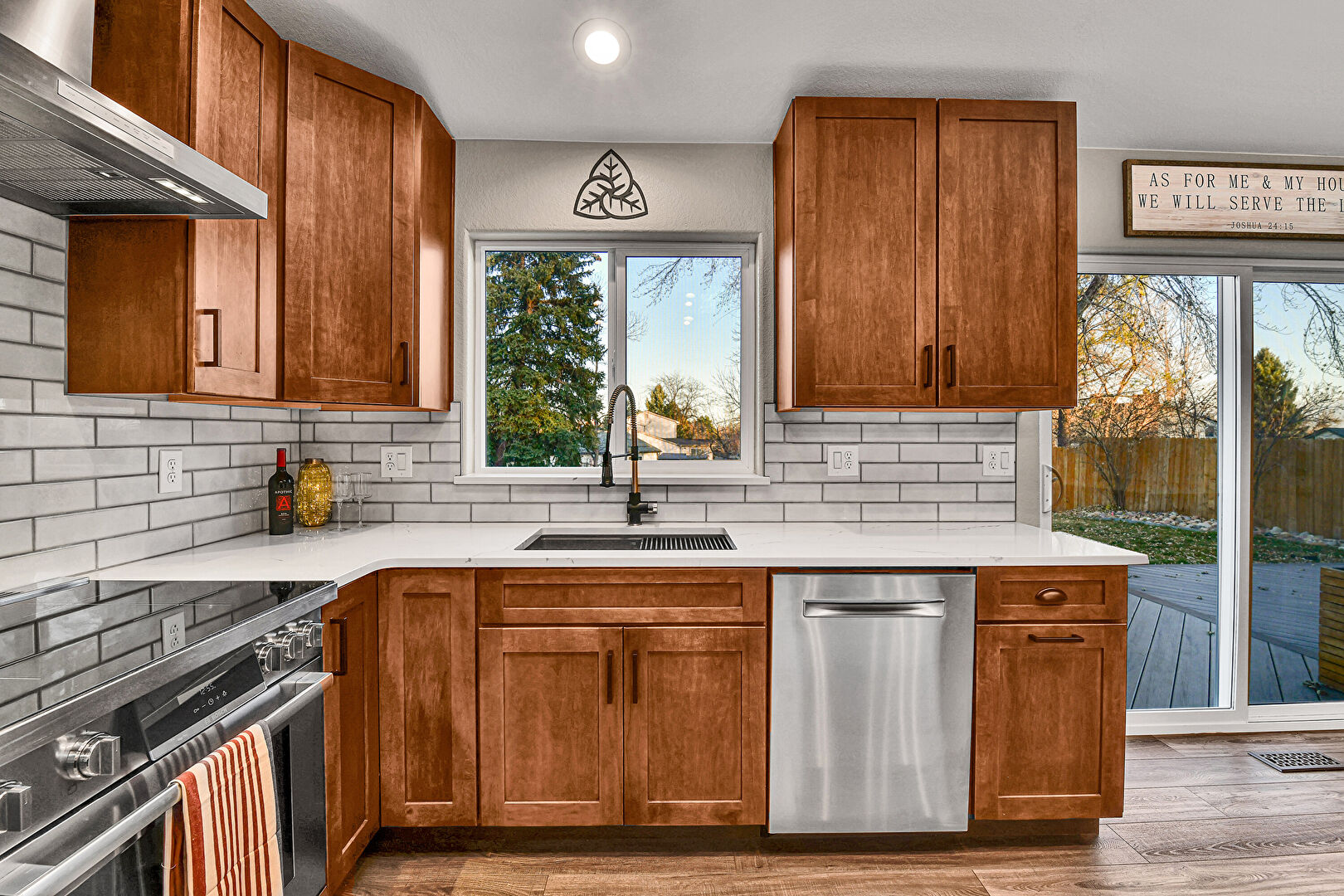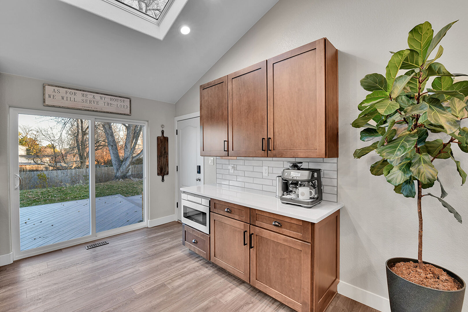 Baseboards Wall, Beamed Ceiling, Cathedral Ceiling, Ceiling Fan, Drywall, High Ceiling, Kitchen Island, L Shaped Kitchen, Medium Brown Cabinets, Natural Light, Opens To Living Area, Recessed Lighting, Shaker Cabinets, Skylight, Stone Countertops, Vaulted Ceiling, Vent, Wood Finish Floor, Medium Brown Cabinets, Natural Light, Recessed Lighting, Skylight, Stone Countertops, Vaulted Ceiling
