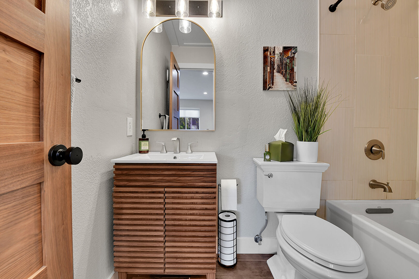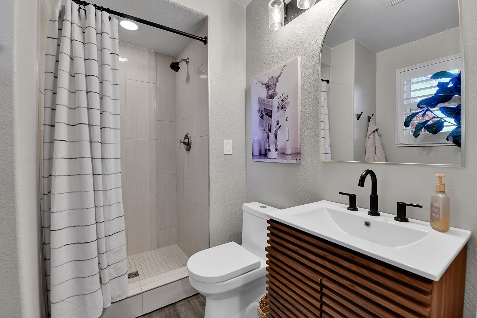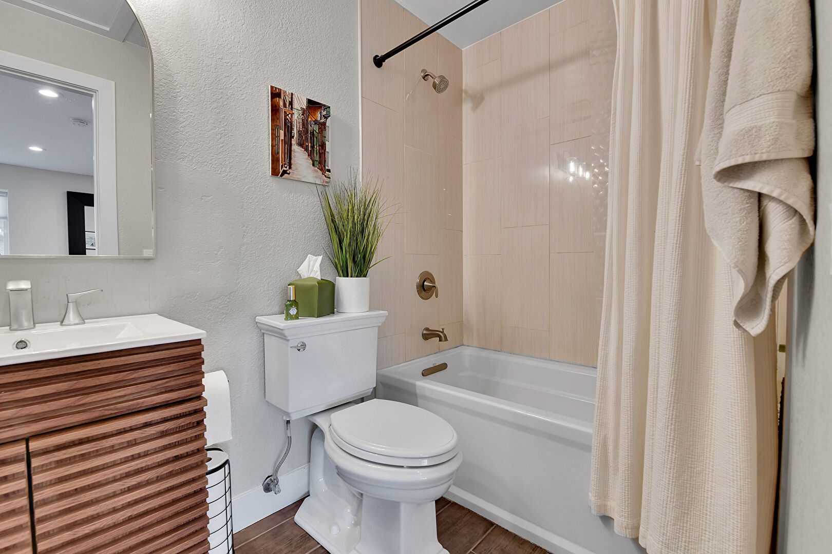 Baseboards Wall, Combined Bath Shower, Drywall, Full Bathroom, Recessed Lighting, Textured Ceiling, Textured Wall, Tile Floor, Vanity, Vent, Wood Finish Floor, Baseboards Wall, Full Bathroom, Vanity