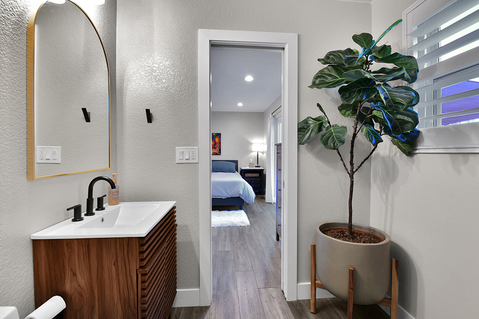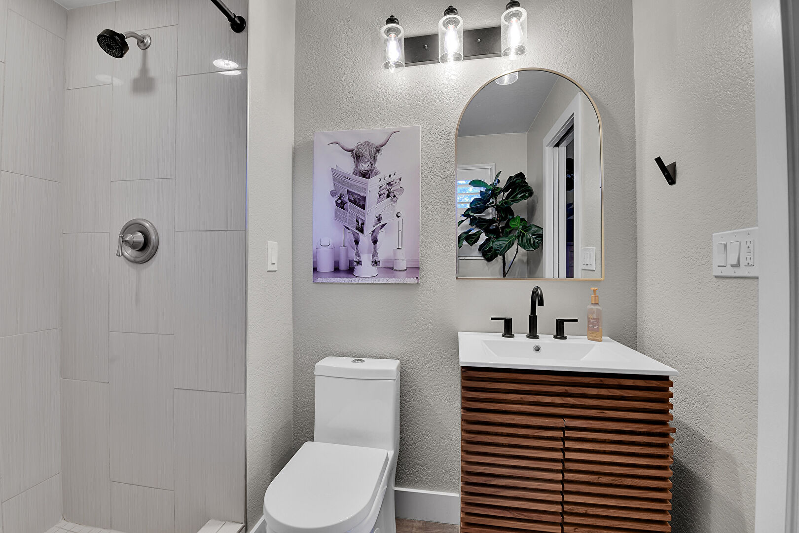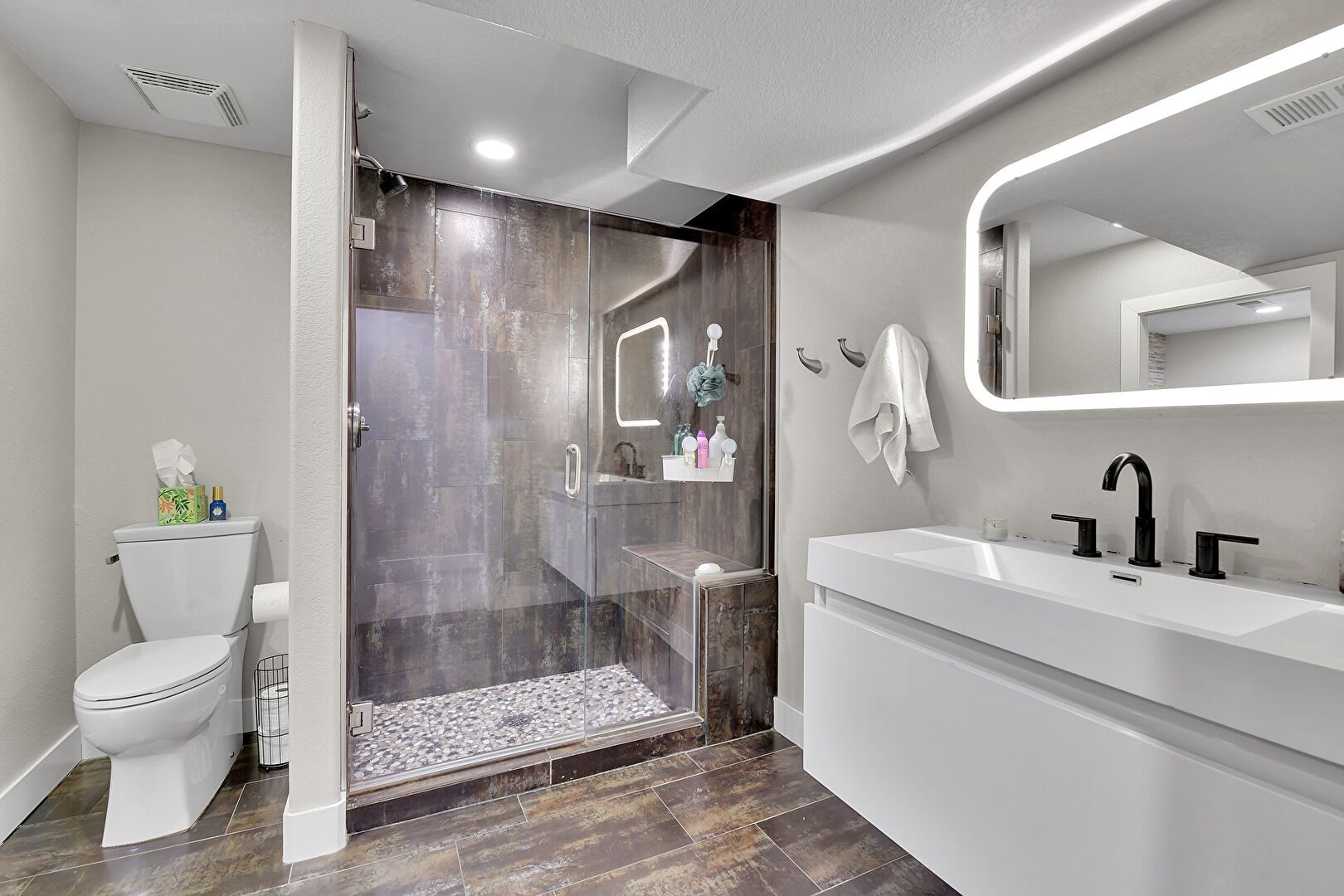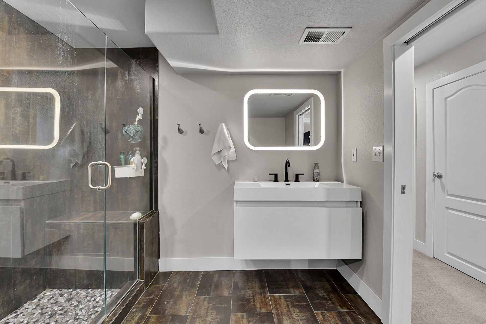 Baseboards Wall, Full Bathroom, Natural Light, Recessed Lighting, Textured Wall, Vanity, Wood Finish Floor, Ensuite Bathroom, Vanity
