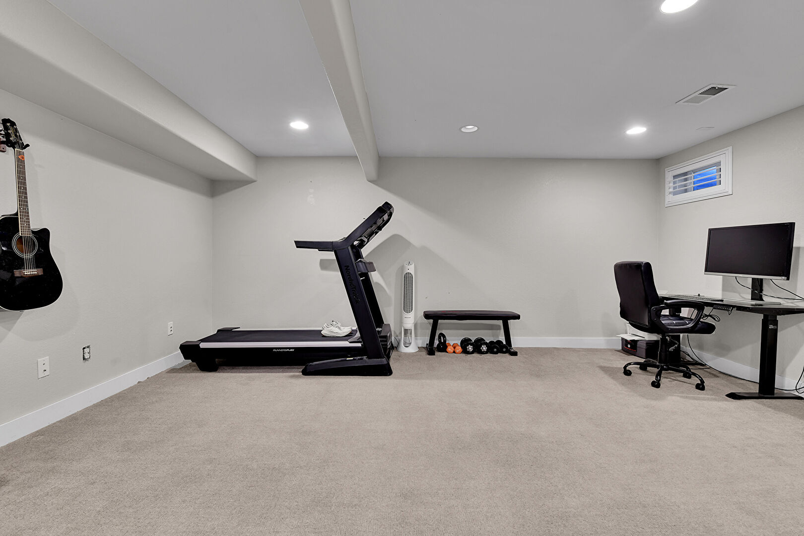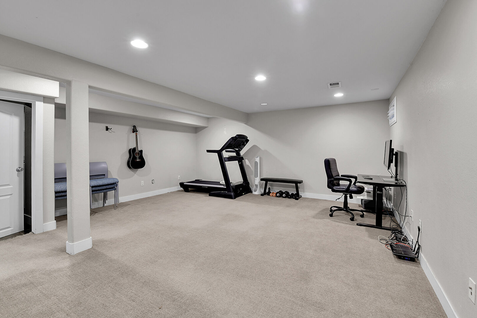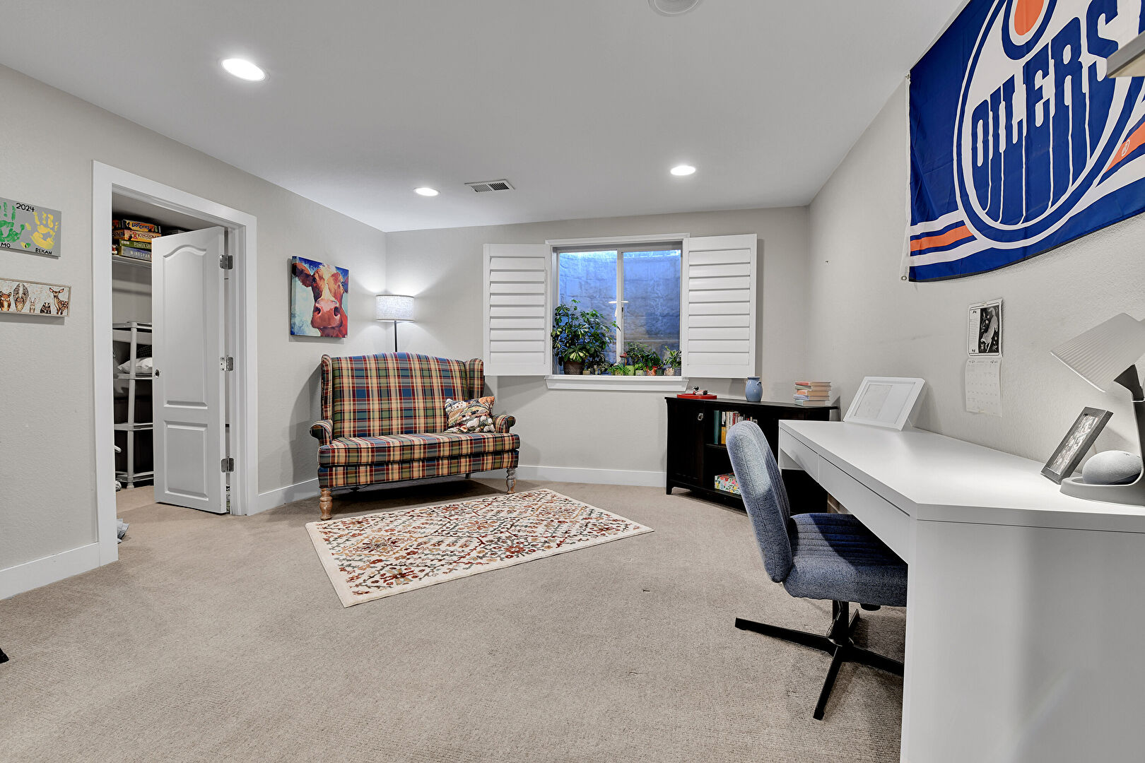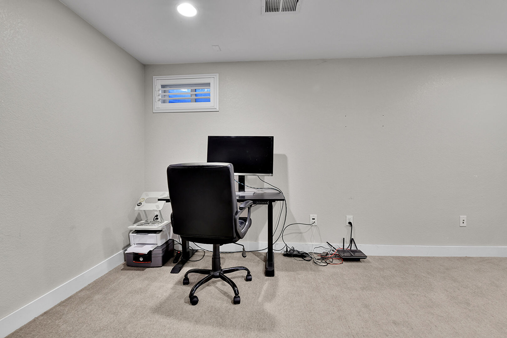 Baseboards Wall, Basement, Carpet, Drywall, Natural Light, Recessed Lighting, Vent, Office Area