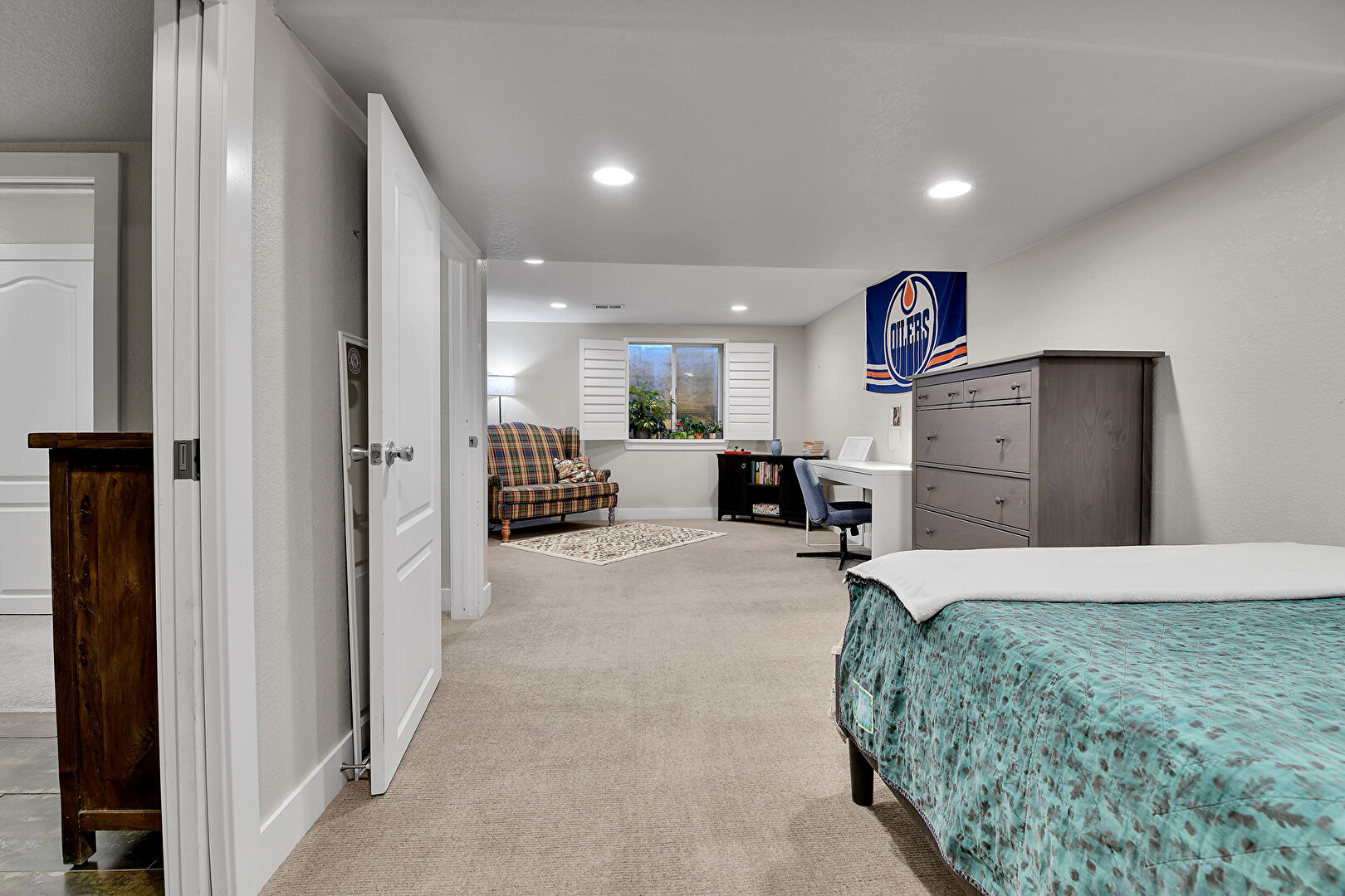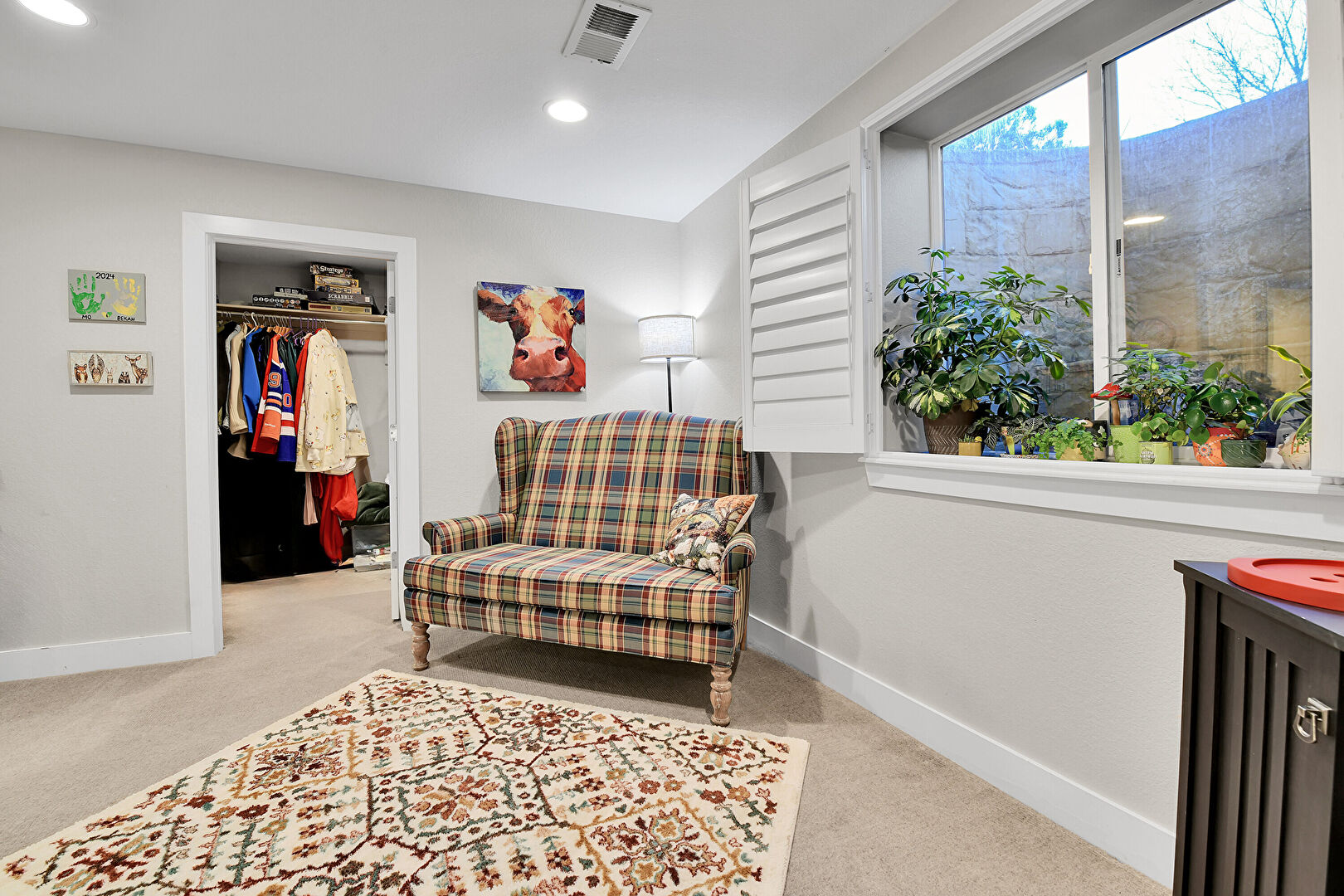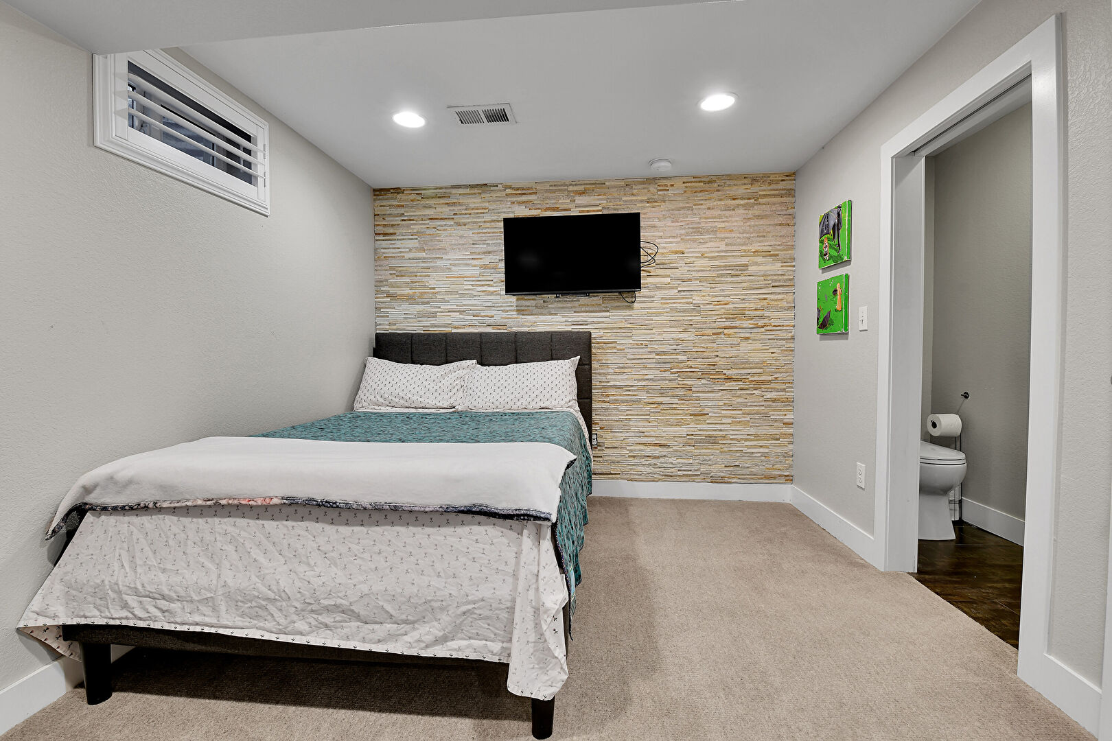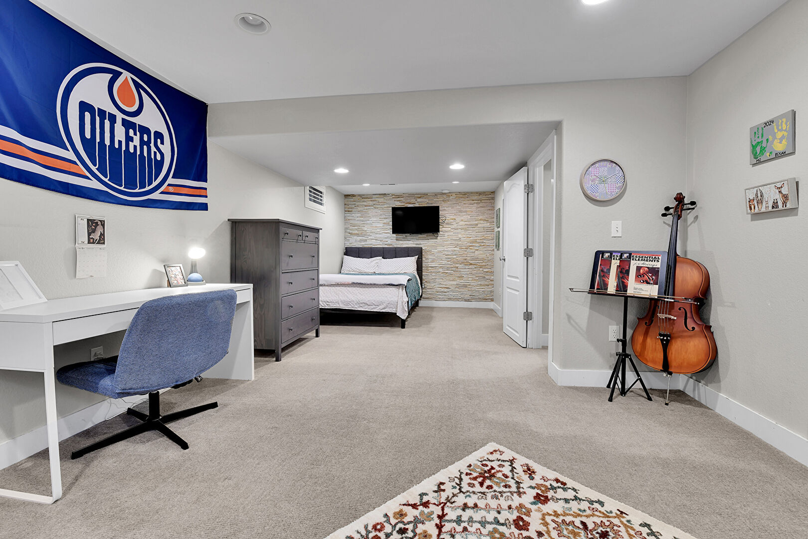 Accent Wall, Baseboards Wall, Carpet, Drywall, Ensuite Bathroom, Natural Light, Office Area, Recessed Lighting, Stone Wall, Vent, Basement, Drywall, Office Area, Vent