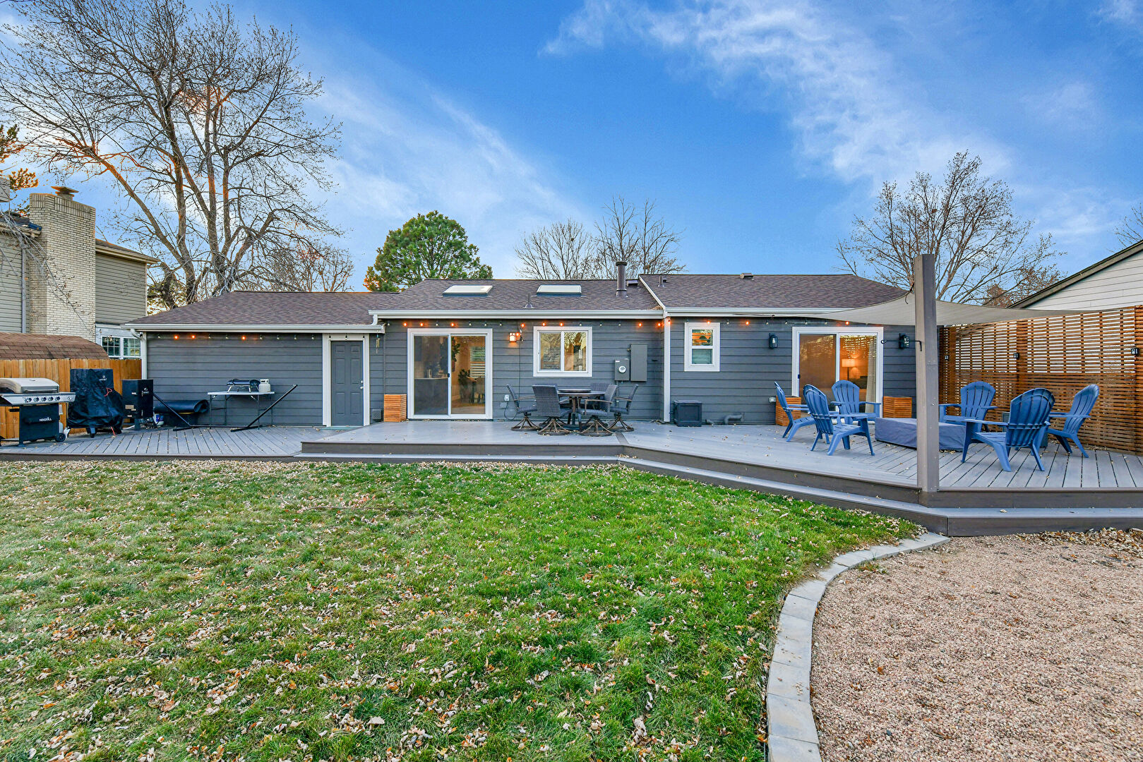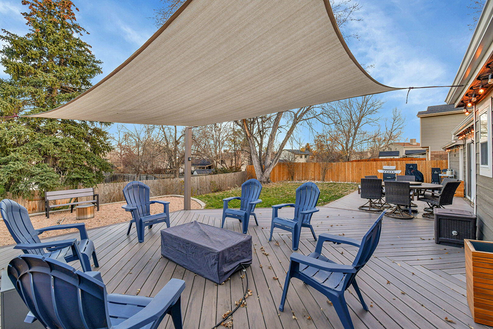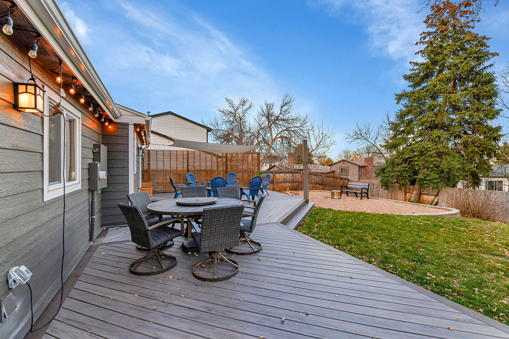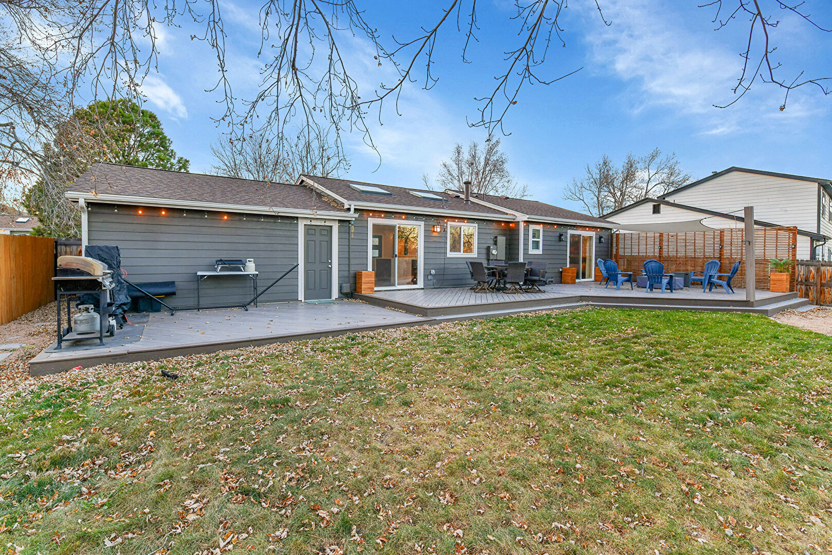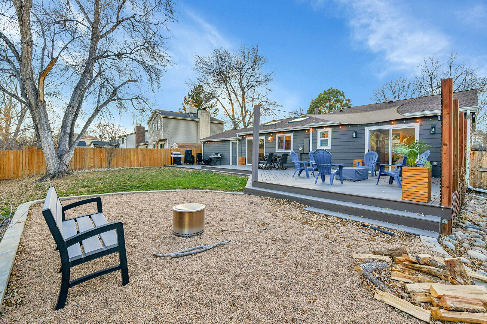 Deck, Downspout, Fence, Fire Pit, Grill, Horizontal Siding, Lawn, Outdoor Dining Area, Patio, Shingle Roof, Gutters, Lawn