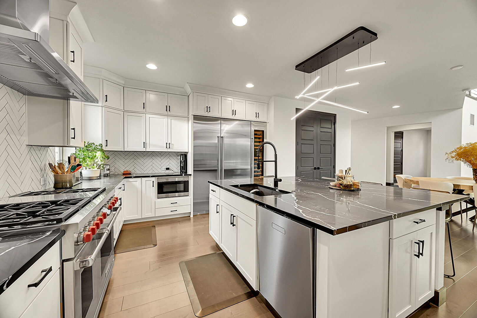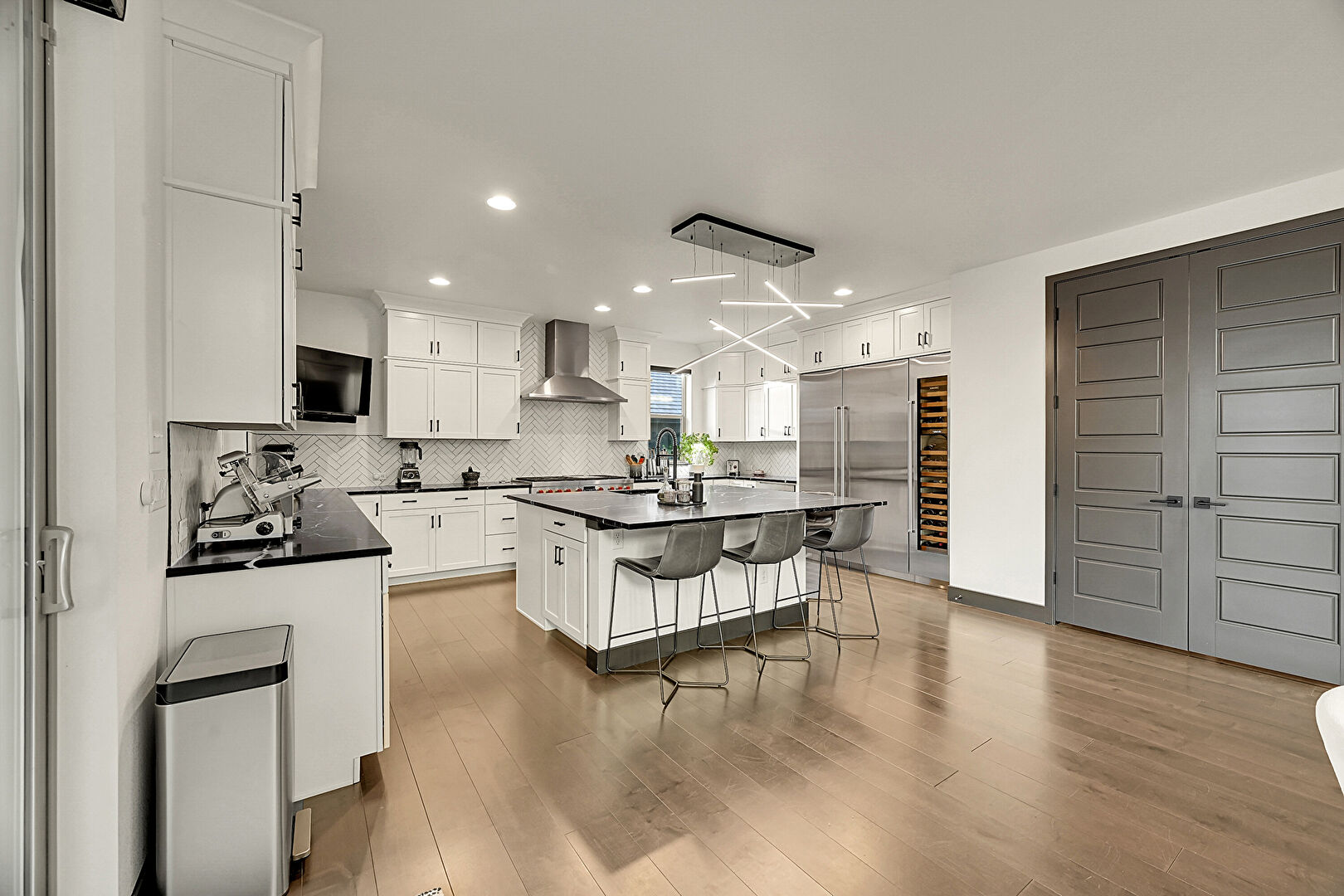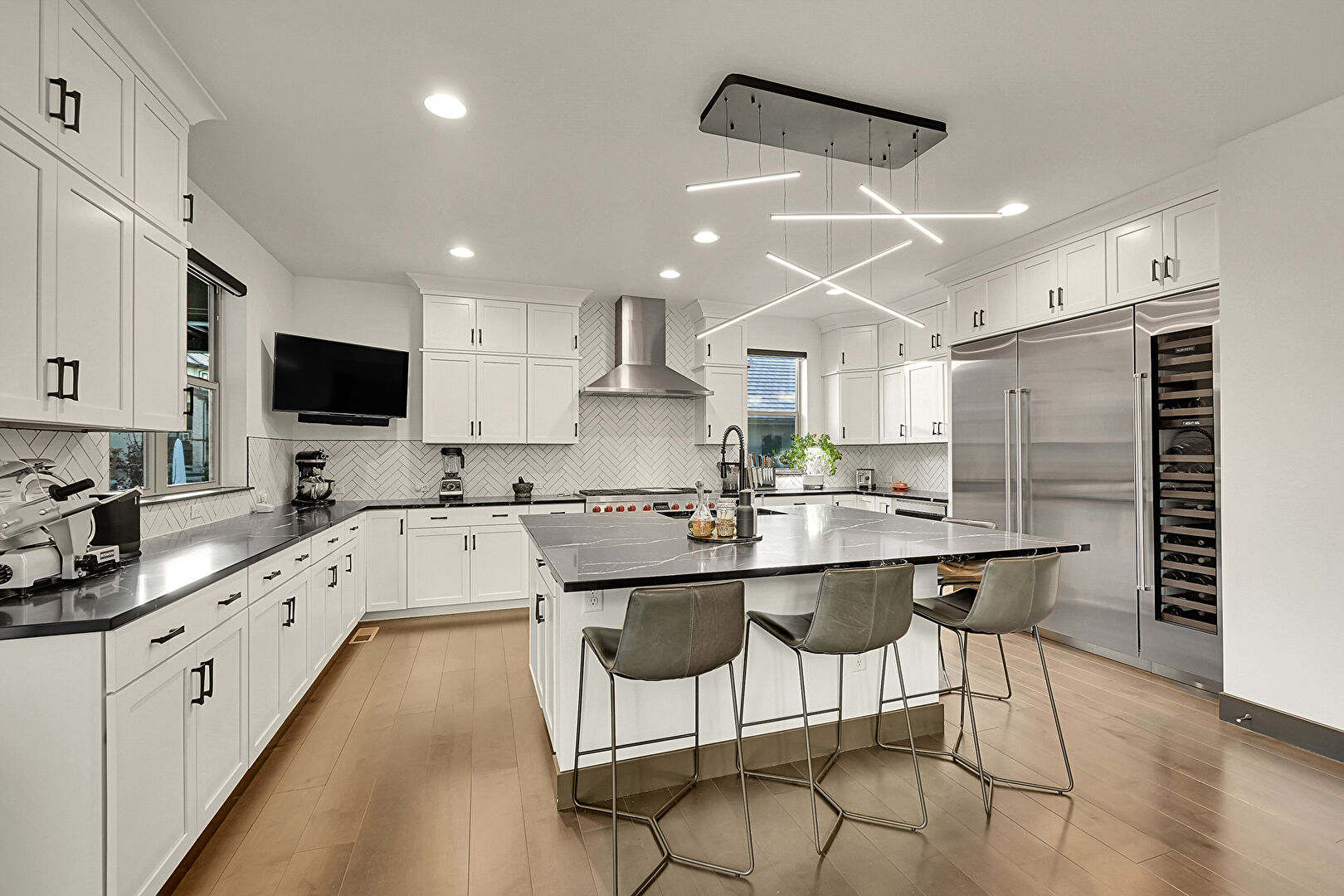 Baseboards Wall, Crown Molding Cabinets, Drywall, Fireplace, Kitchen Bar, Kitchen Island, Natural Light, Notable Chandelier, Opens To Living Area, Pendant Lighting, Recessed Lighting, Shaker Cabinets, Stone Countertops, U Shaped Kitchen, Vent, Wine Cooler, Wood Finish Floor, Crown Molding Cabinets, Kitchen Bar, Kitchen Island, Pendant Lighting, U Shaped Kitchen