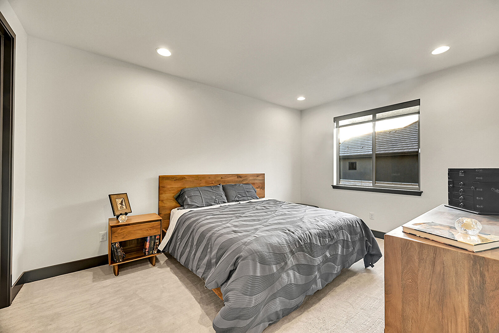 Baseboards Wall, Carpet, Drywall, Recessed Lighting, Wood Finish Floor, Beamed Ceiling, Drywall