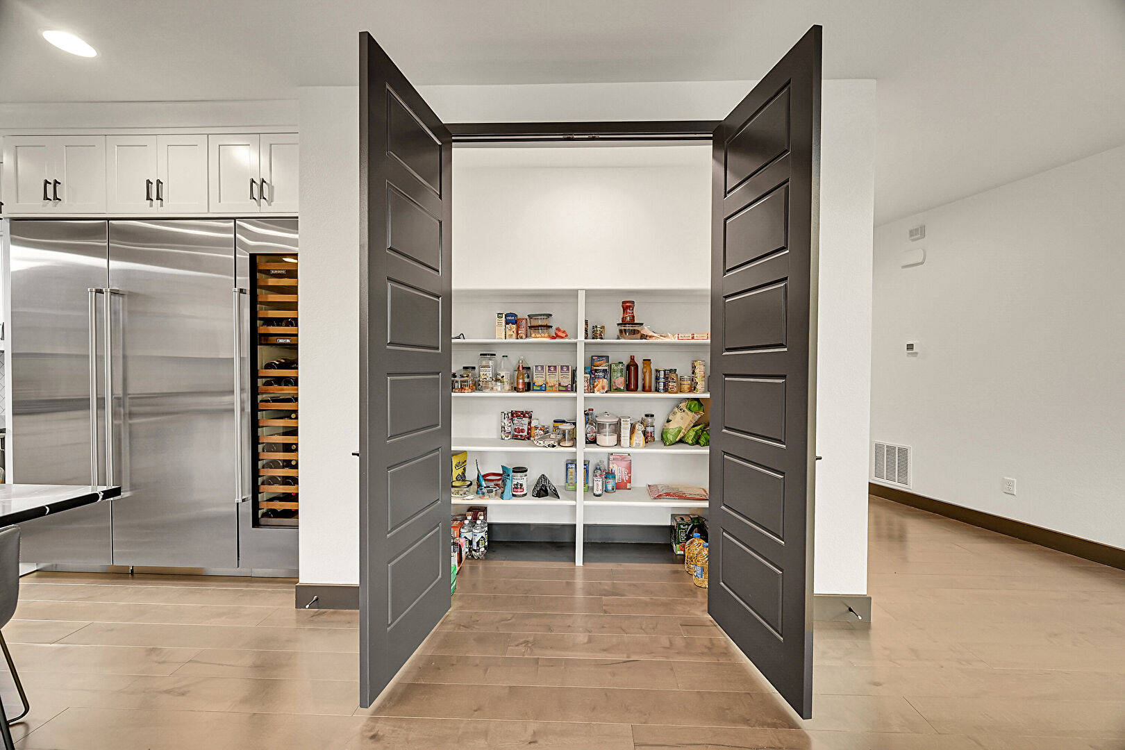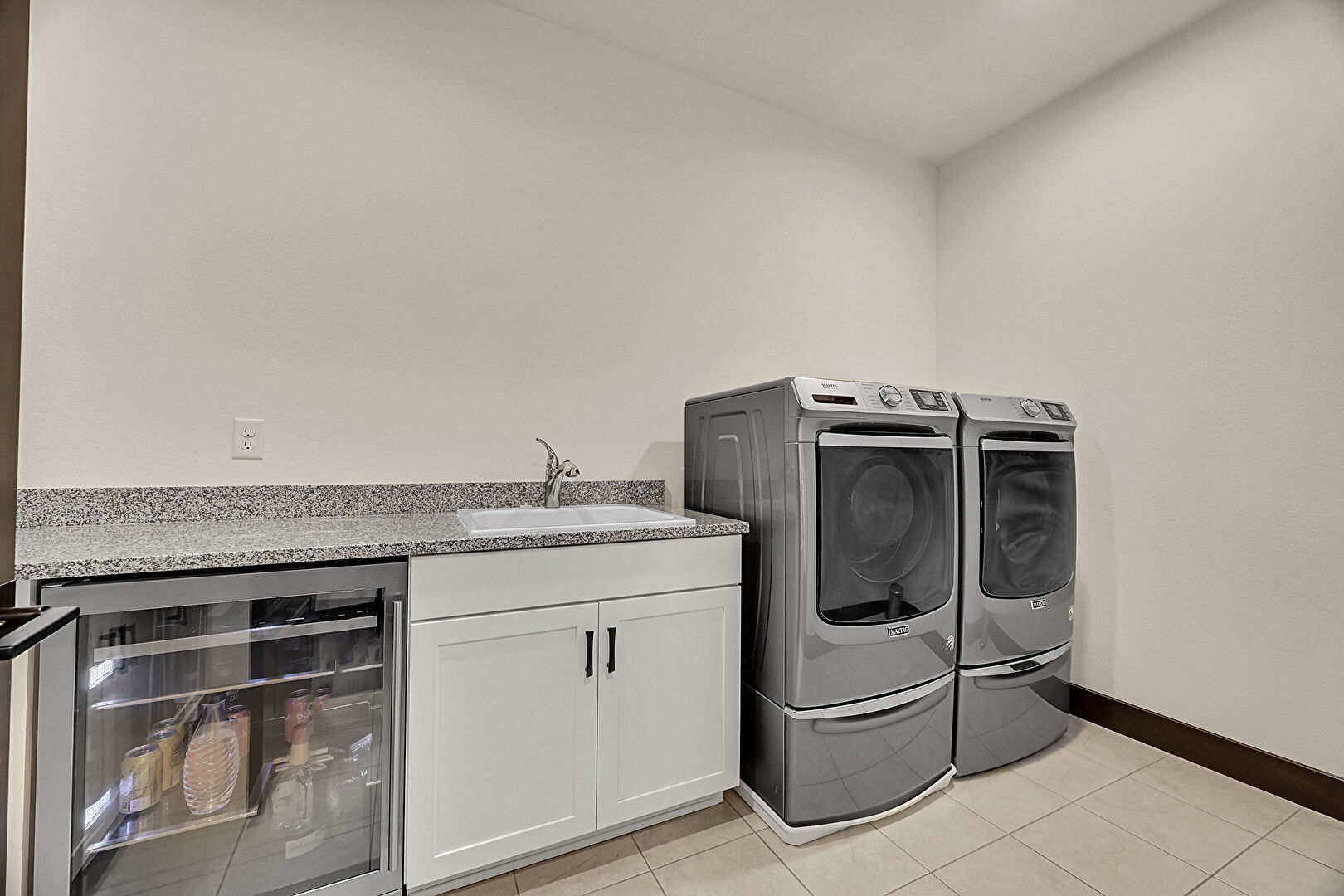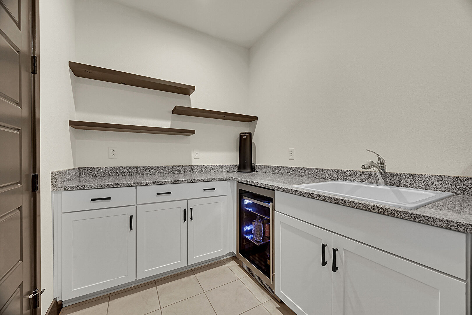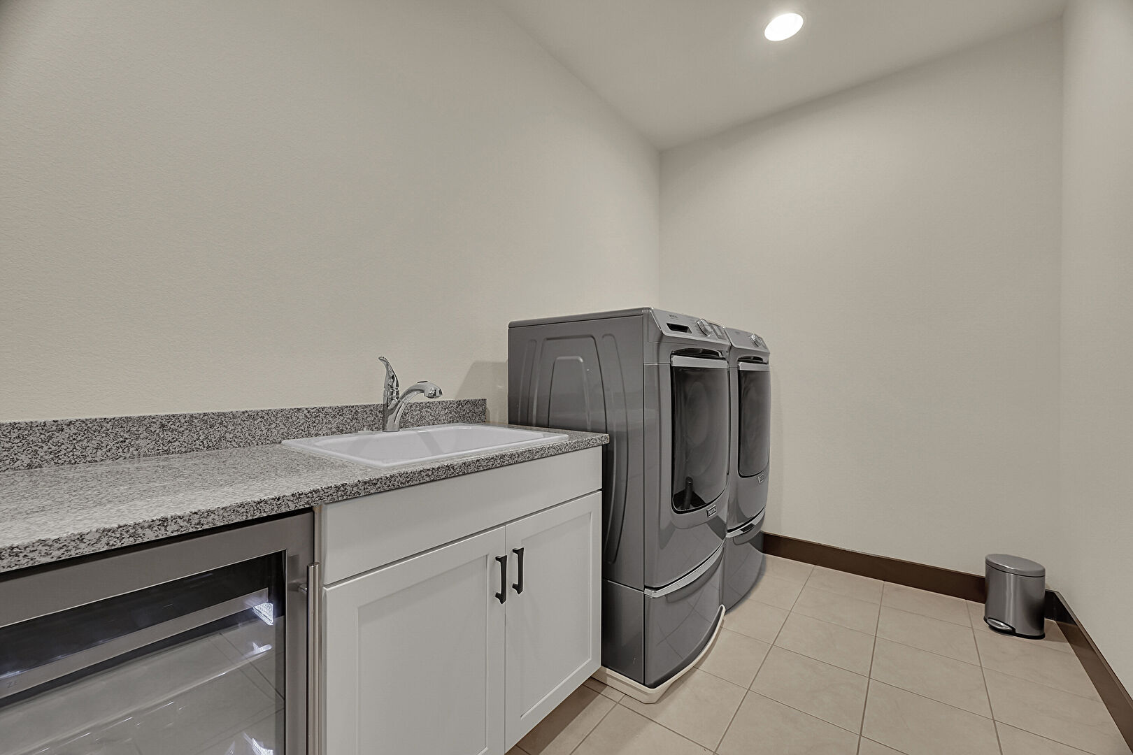 Baseboards Wall, Drywall, Laundry, Open Shelves, Recessed Lighting, Shaker Cabinets, Tile Floor, Wine Cooler, Stone Countertops, Tile Floor, Wine Cooler