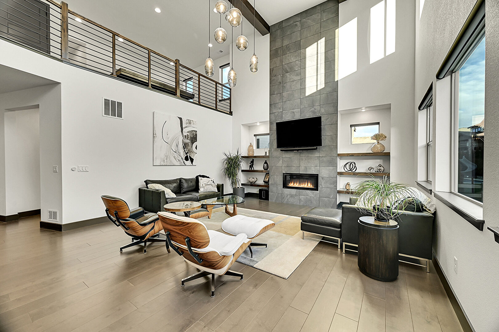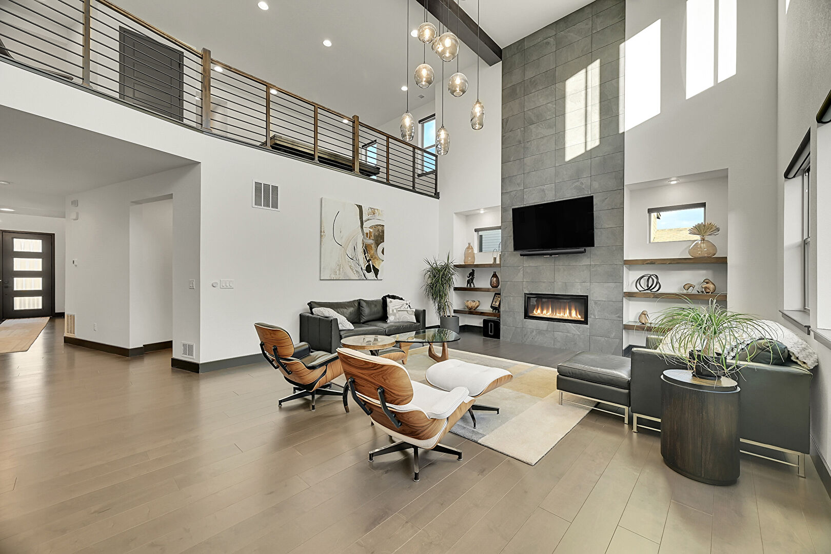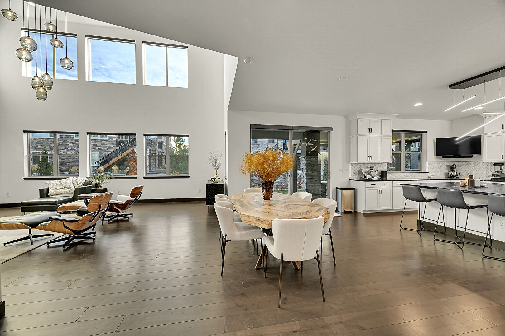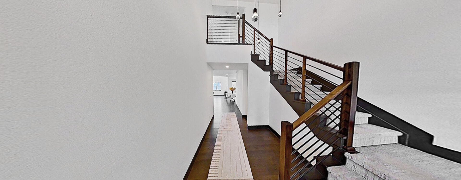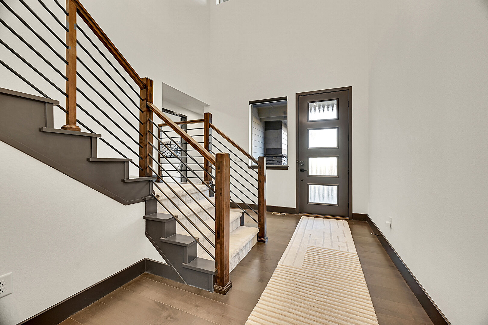 Baseboards Wall, Drywall, High Ceiling, Stairs, Wood Finish Floor, Natural Light