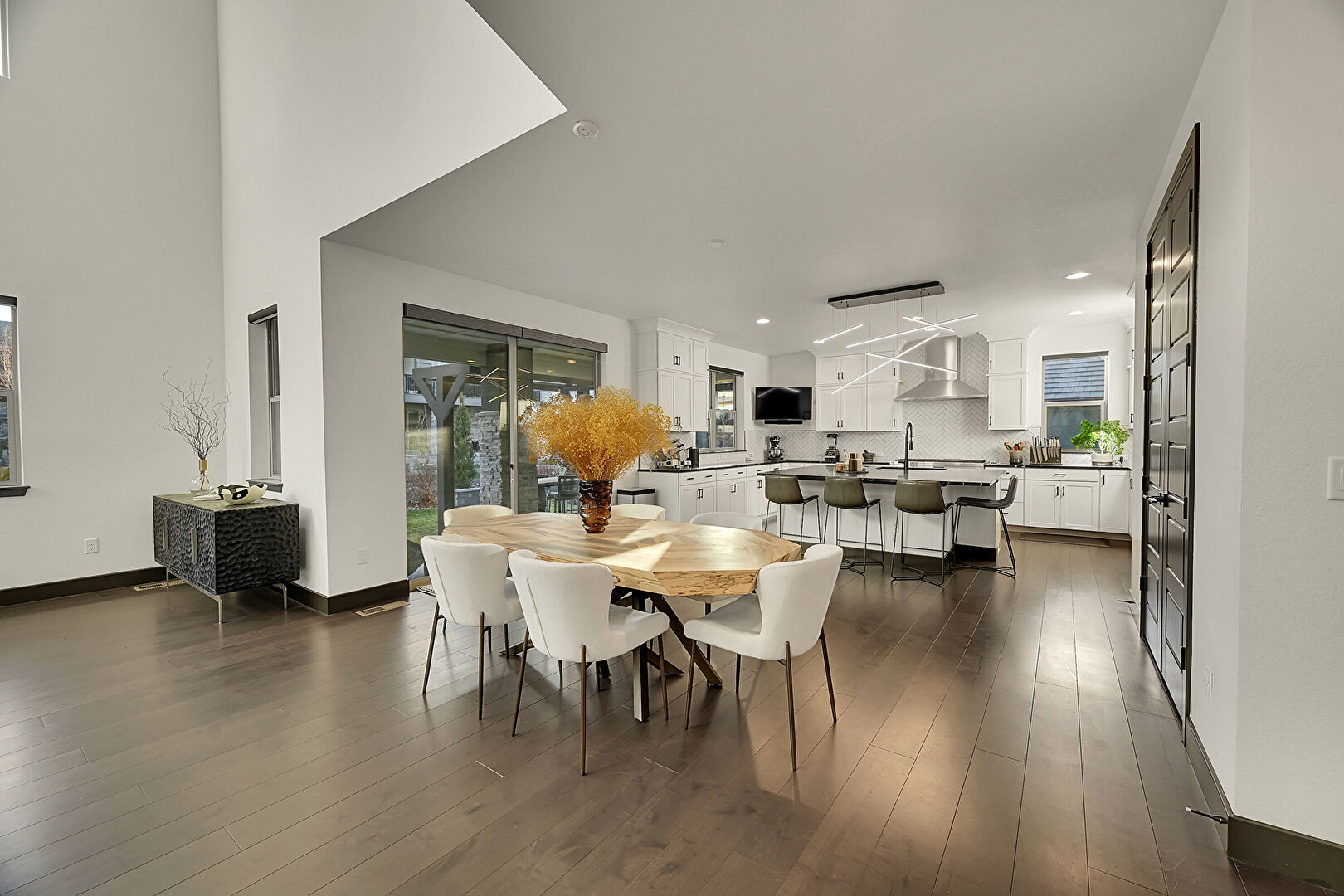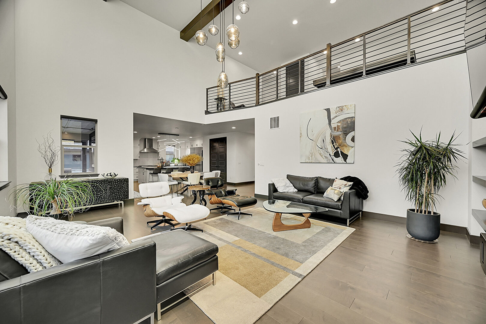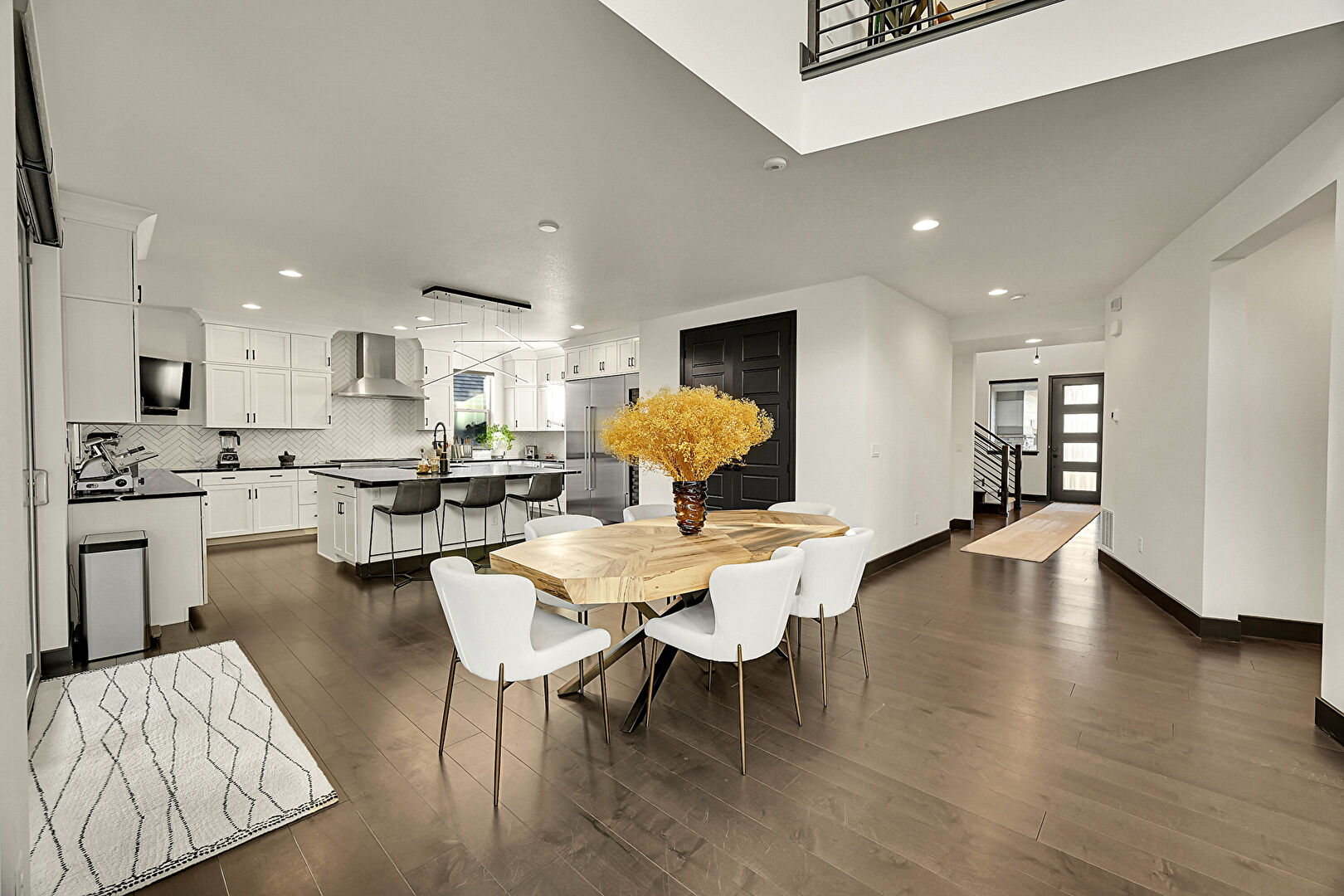 Baseboards Wall, Drywall, High Ceiling, Natural Light, Recessed Lighting, Stairs, U Shaped Kitchen, Wood Finish Floor, Recessed Lighting, Wood Finish Floor