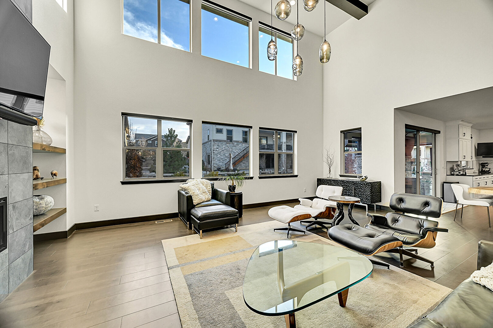 Baseboards Wall, Built In Shelves, Drywall, Fireplace, High Ceiling, Natural Light, Notable Chandelier, Recessed Lighting, Vent, Wood Finish Floor, Beamed Ceiling, Notable Chandelier, Vent, Wood Finish Floor