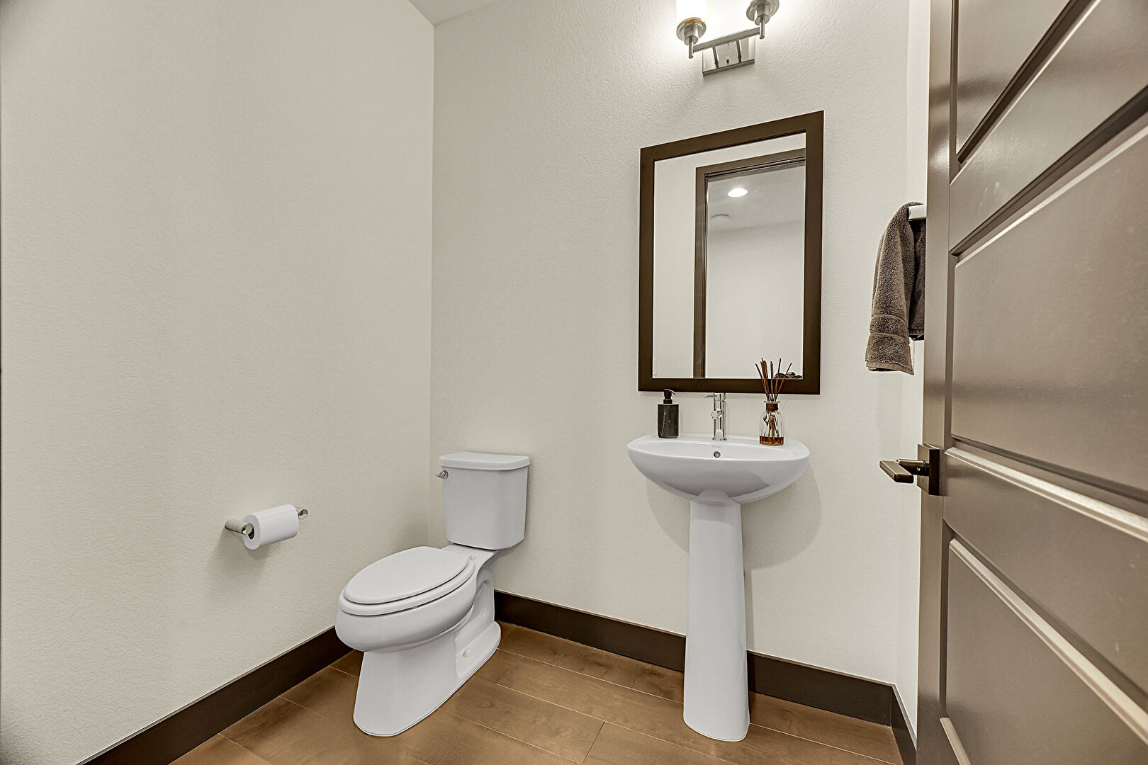 Baseboards Wall, Drywall, Recessed Lighting, Wood Finish Floor, Half Bathroom