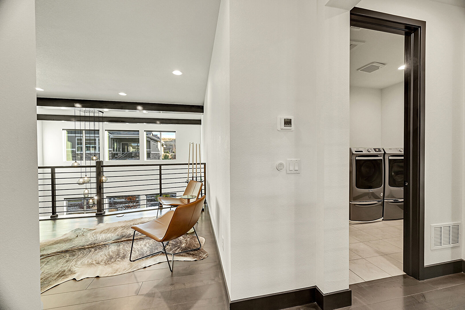Baseboards Wall, Drywall, Laundry, Natural Light, Recessed Lighting, Textured Wall, Tile Floor, Vent, Wood Finish Floor, Drywall, Recessed Lighting, Tile Floor