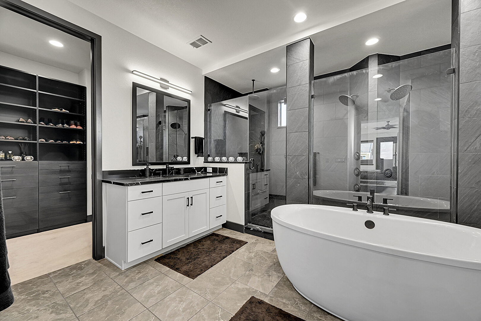 Baseboards Wall, Drywall, Full Bathroom, Marble Finish Floor, Natural Light, Recessed Lighting, Tile Floor, Two Single Vanities, Vanity, Vent, Walk In Closet, Full Bathroom, Recessed Lighting, Vent