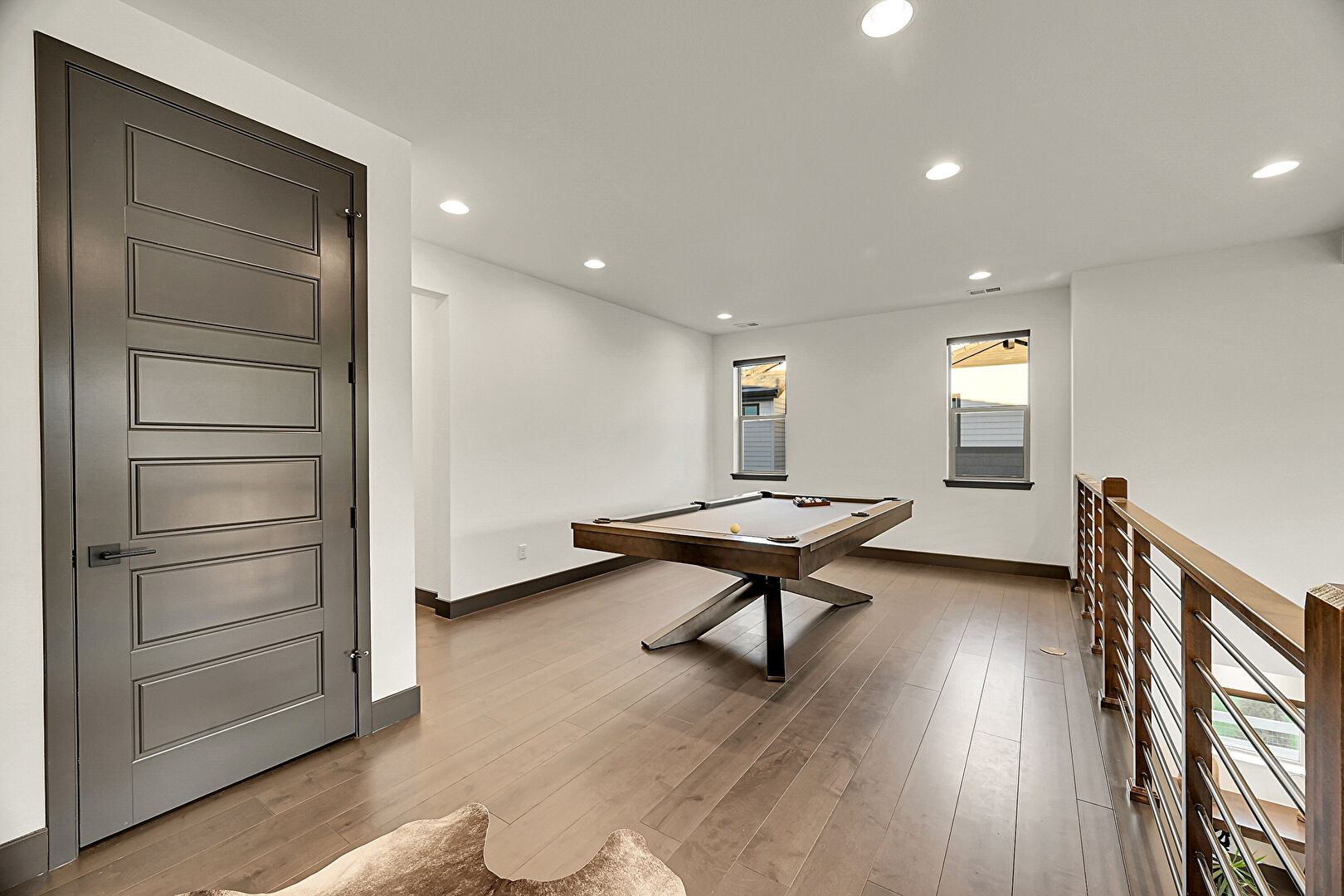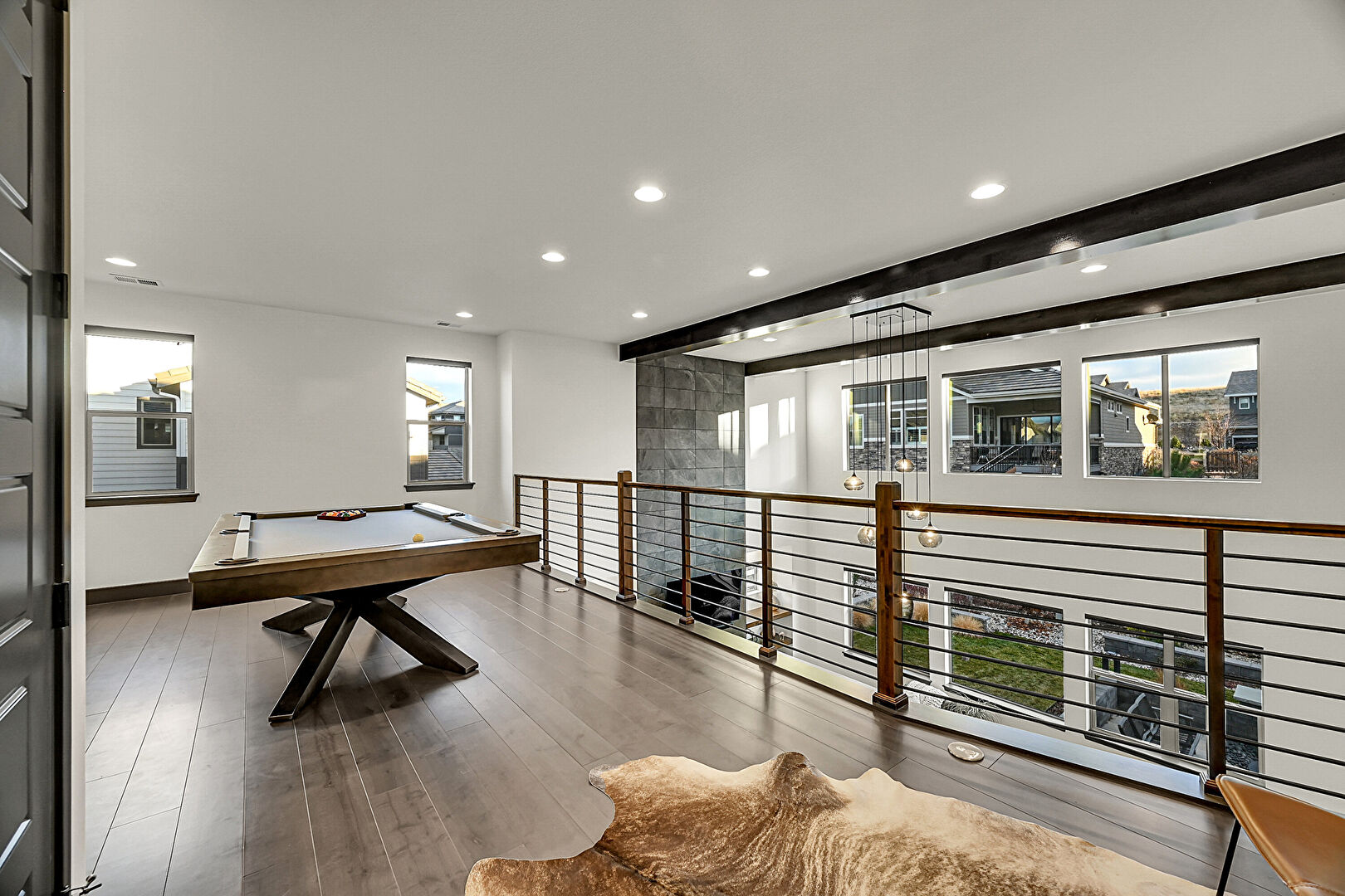 Baseboards Wall, Beamed Ceiling, Billiards, Drywall, Natural Light, Recessed Lighting, Vent, Wood Finish Floor, Baseboards Wall, Beamed Ceiling, Recessed Lighting