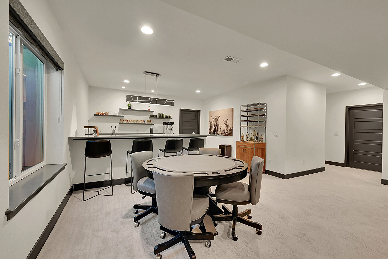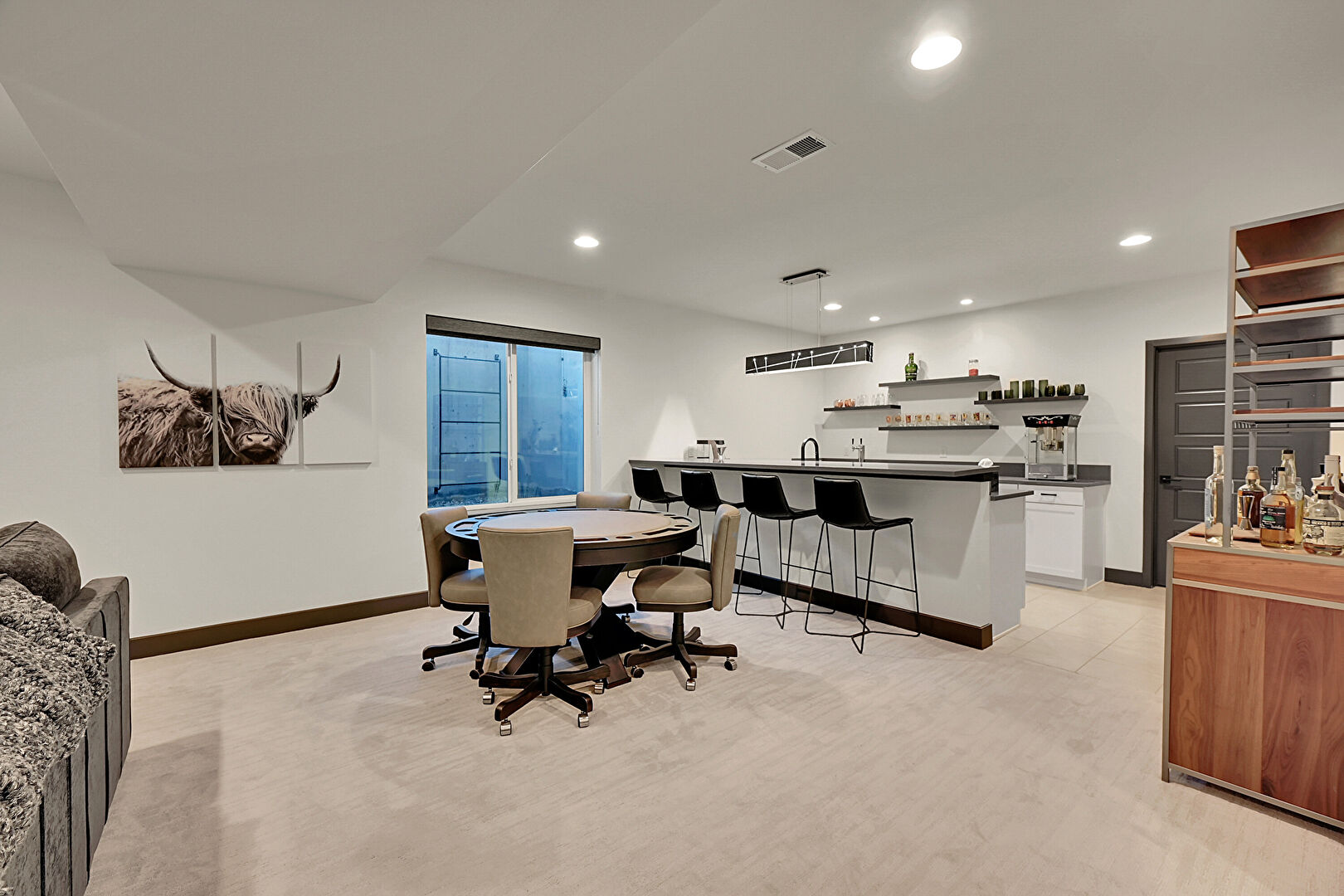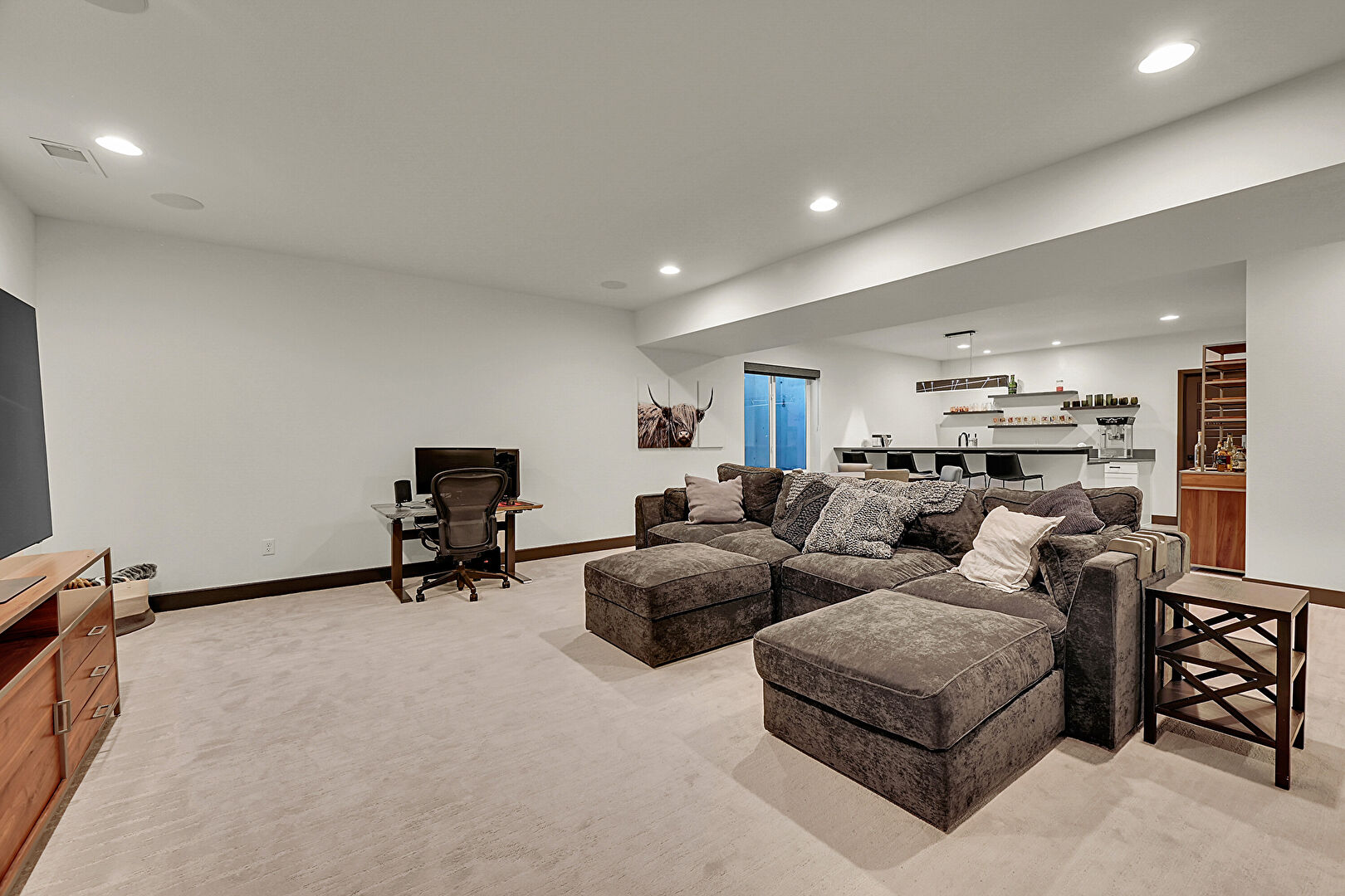 Baseboards Wall, Basement, Carpet, Drywall, Indoor Bar, Natural Light, Office Area, Recessed Lighting, Vent, Baseboards Wall, Carpet, Drywall, Office Area, Vent