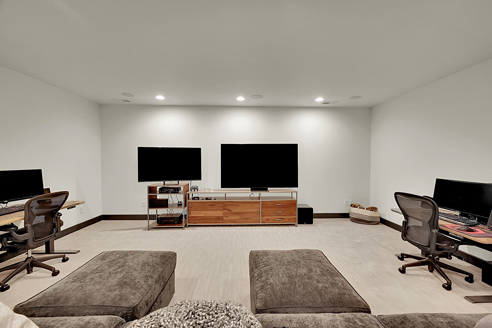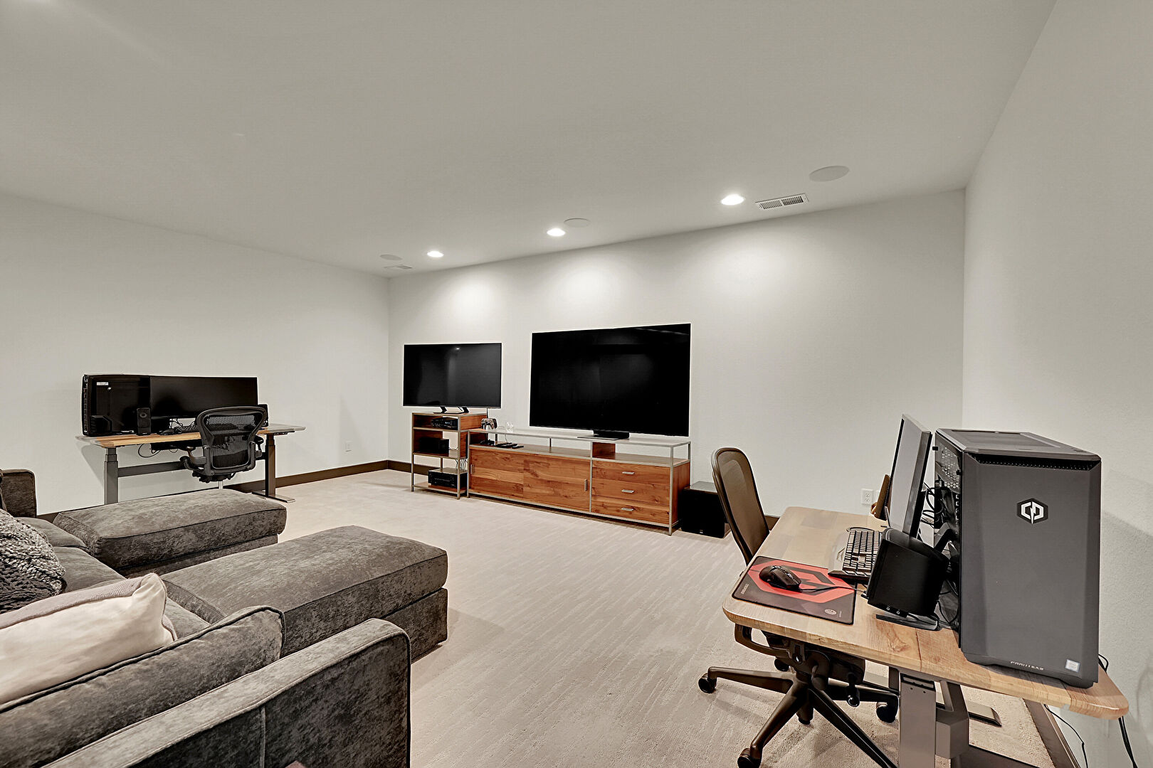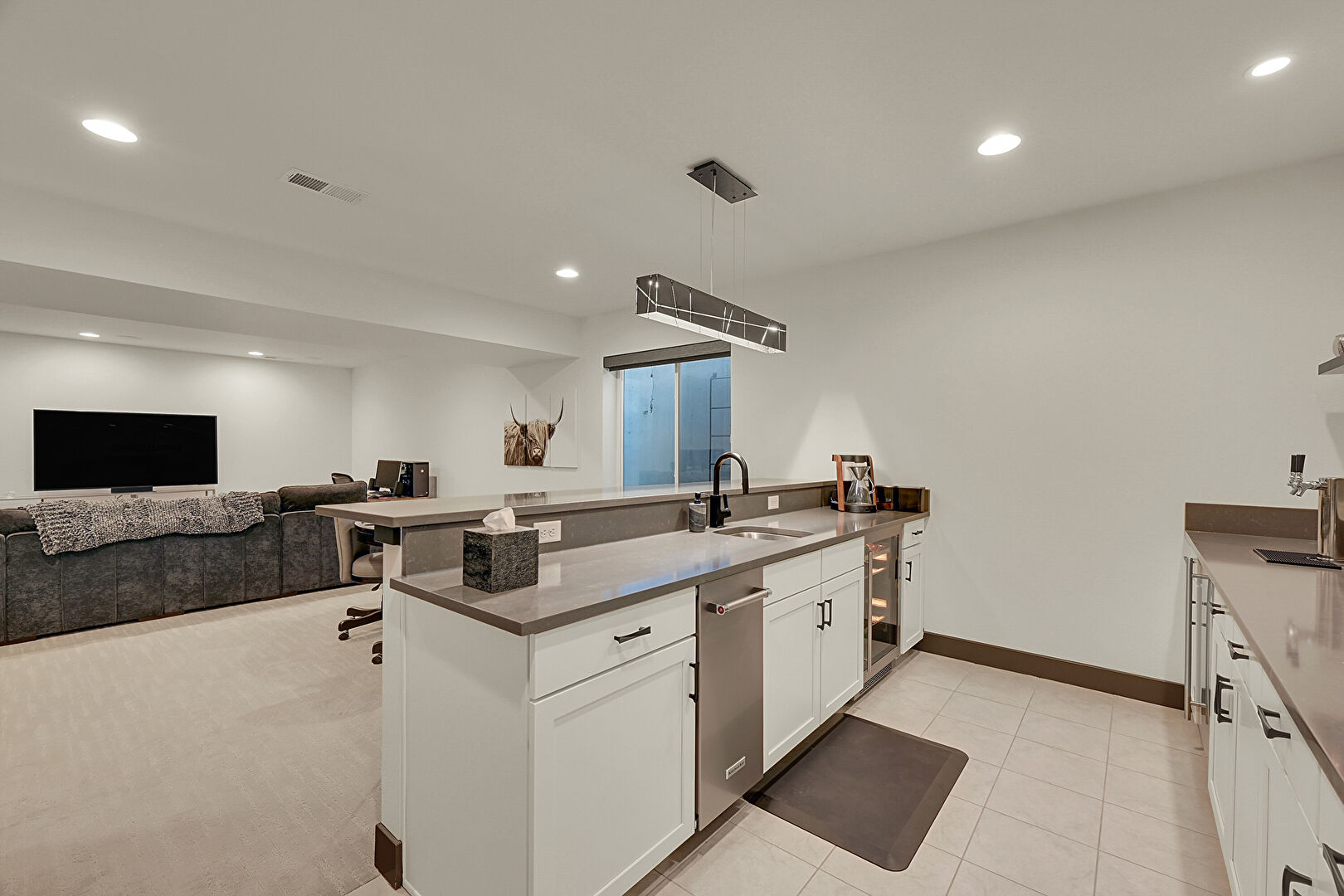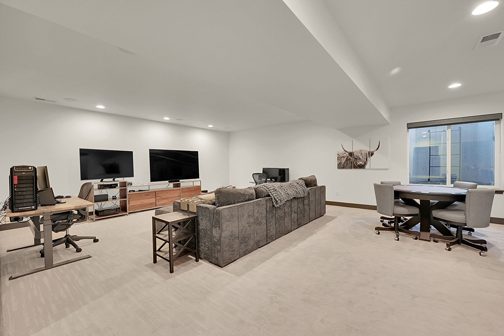 Baseboards Wall, Basement, Carpet, Drywall, Indoor Bar, Natural Light, Office Area, Recessed Lighting, Vent, Baseboards Wall, Carpet, Drywall, Office Area, Vent