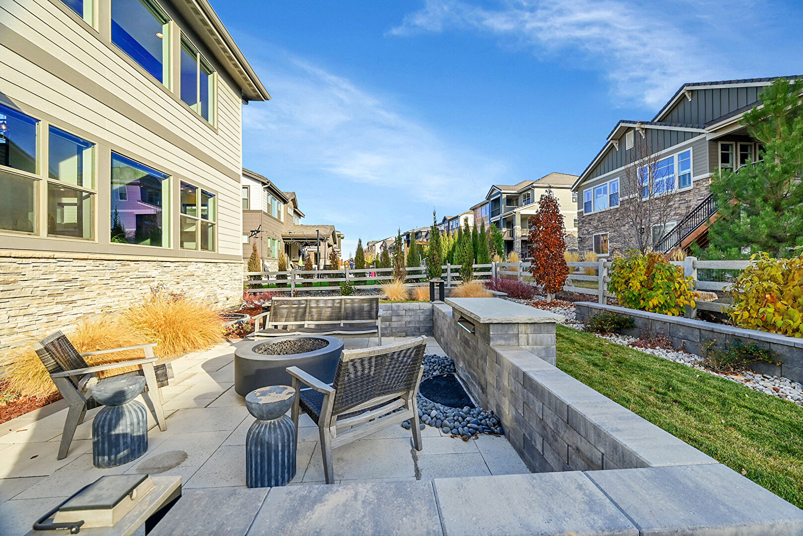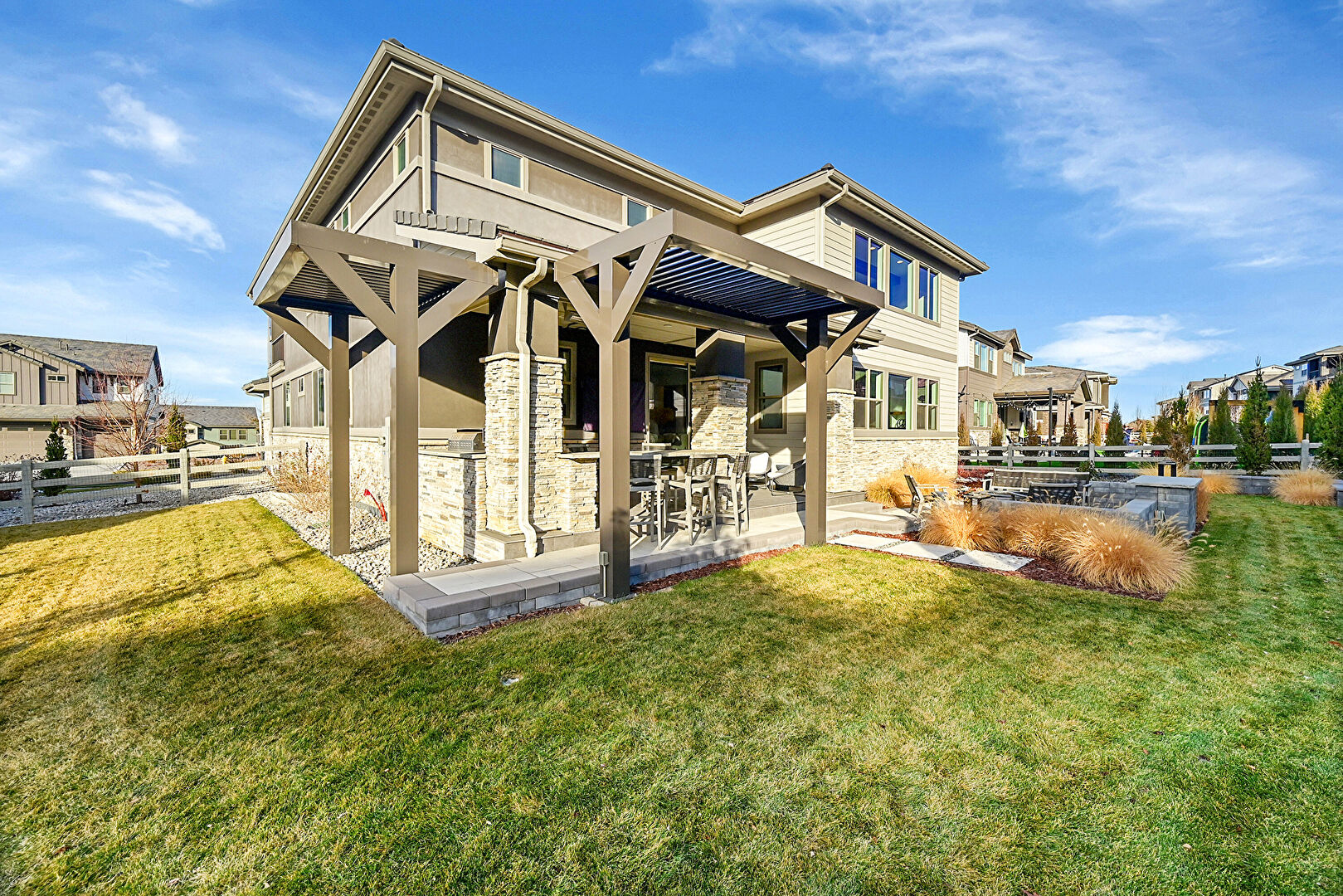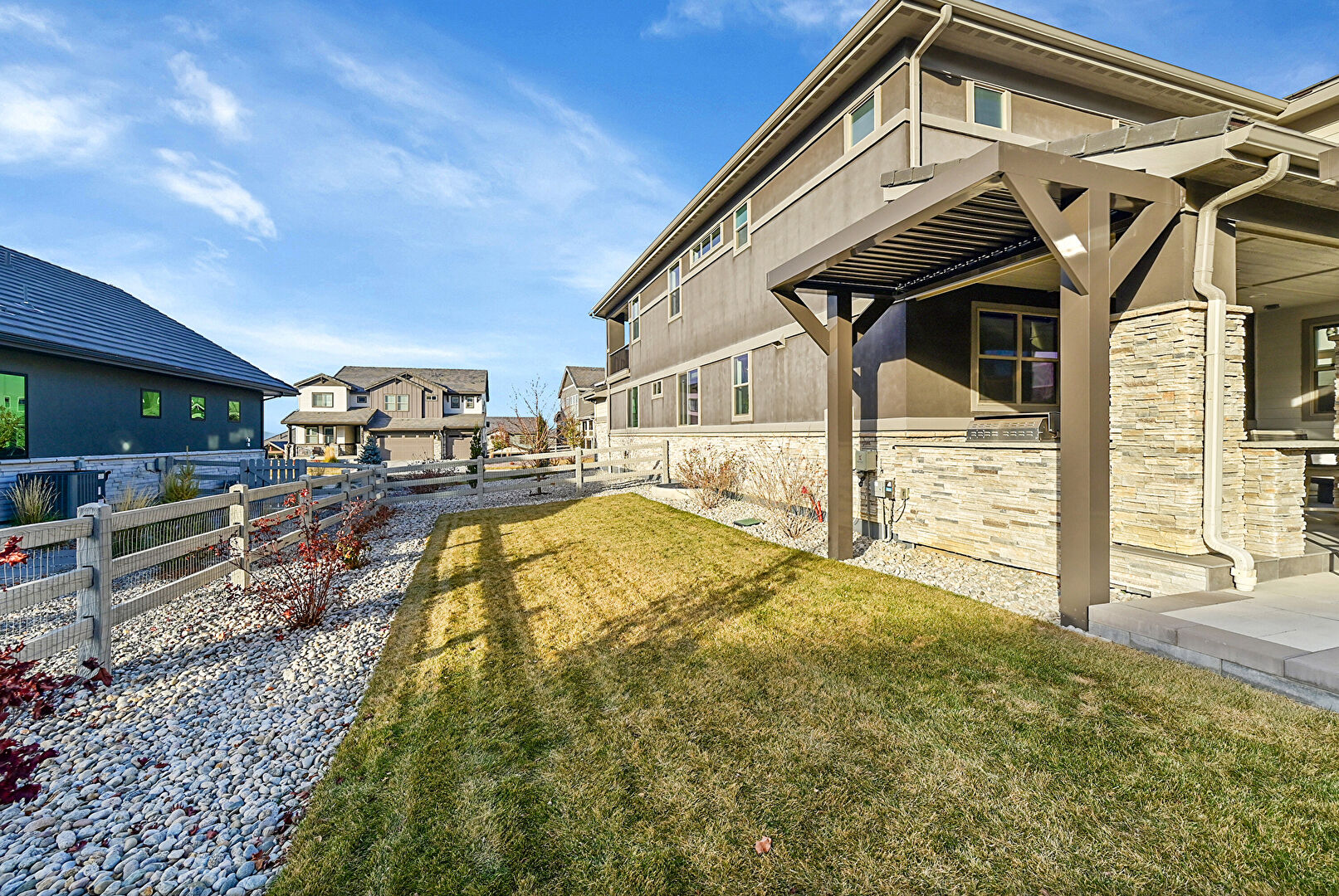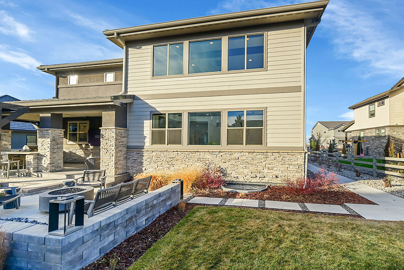 Central Ac, Downspout, Fence, Gutters, Horizontal Siding, Lawn, Outdoor Kitchen, Patio, Residential View, Stone Siding, Stucco Siding, Fire Pit, Gutters