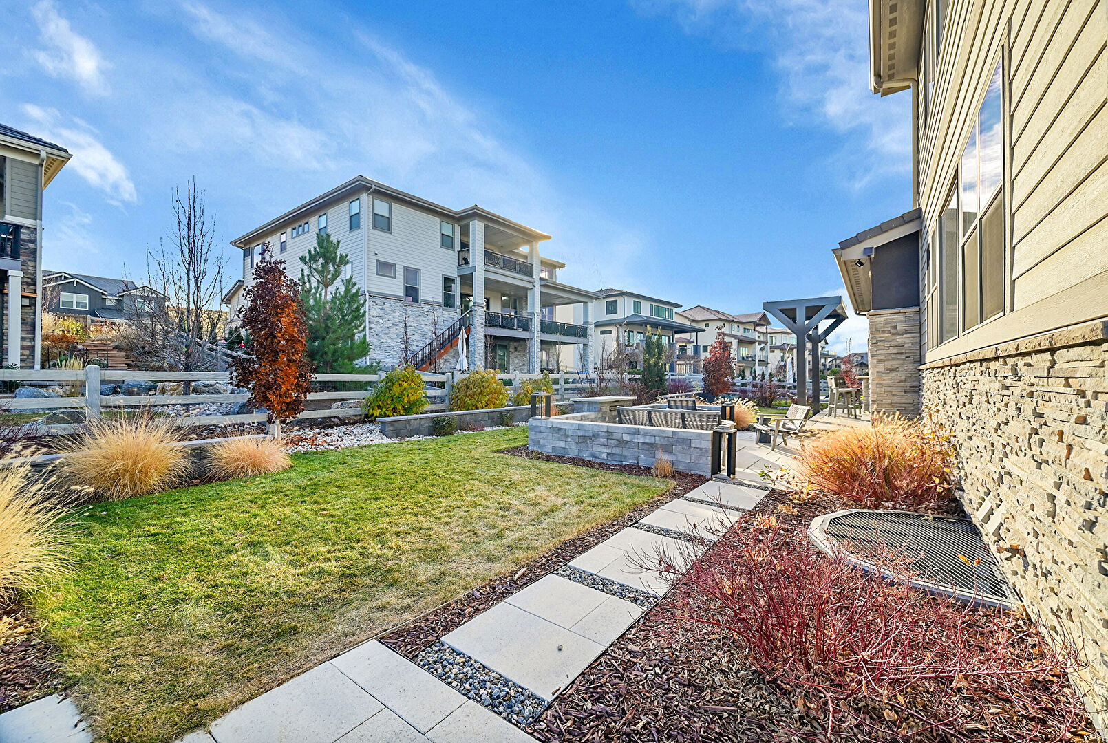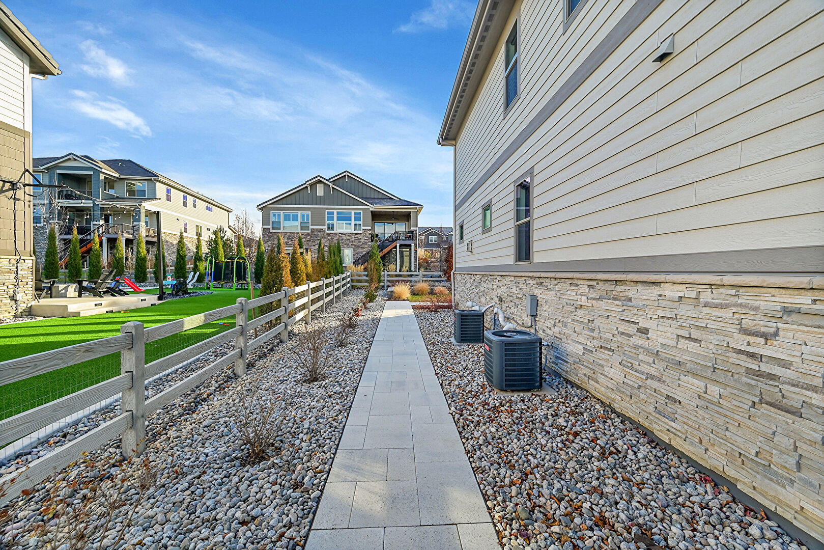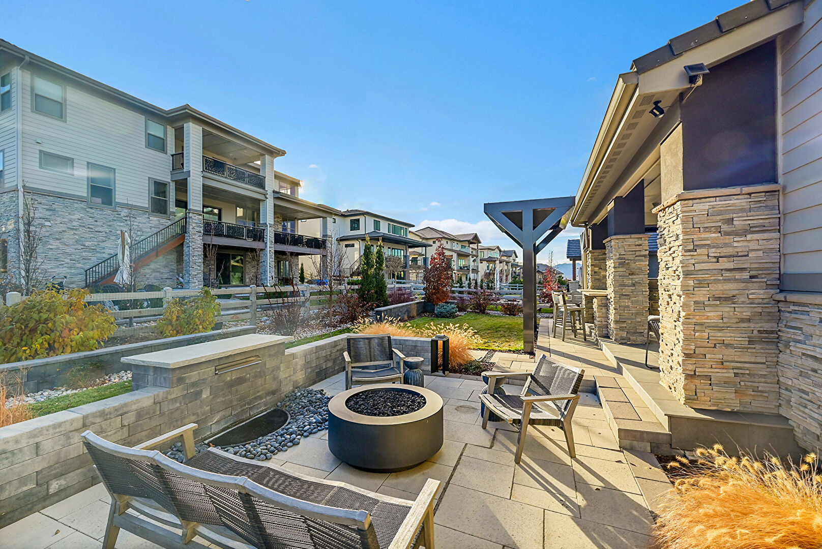 Central Ac, Downspout, Fence, Gutters, Horizontal Siding, Lawn, Outdoor Kitchen, Patio, Residential View, Stone Siding, Stucco Siding, Fire Pit, Gutters