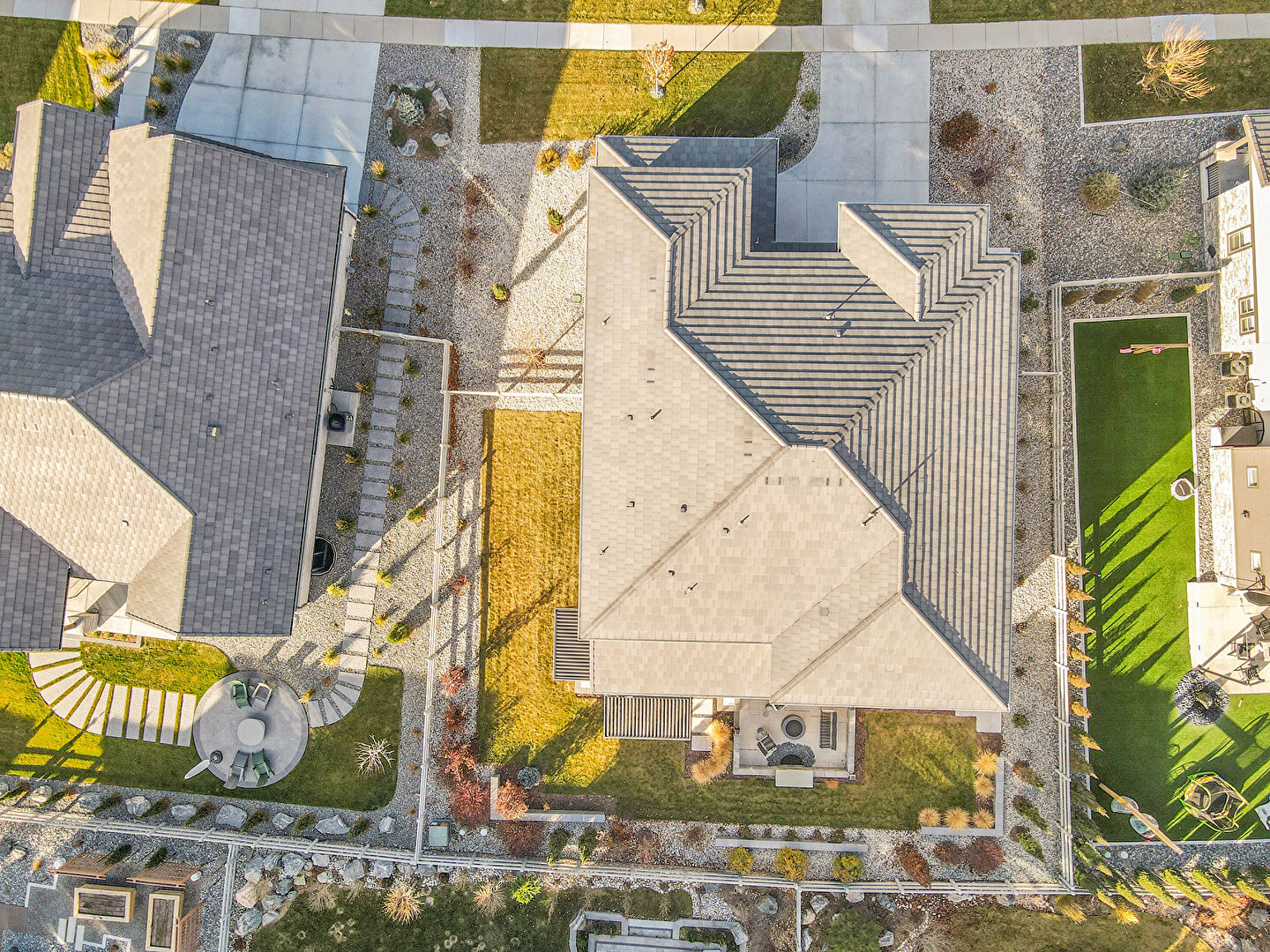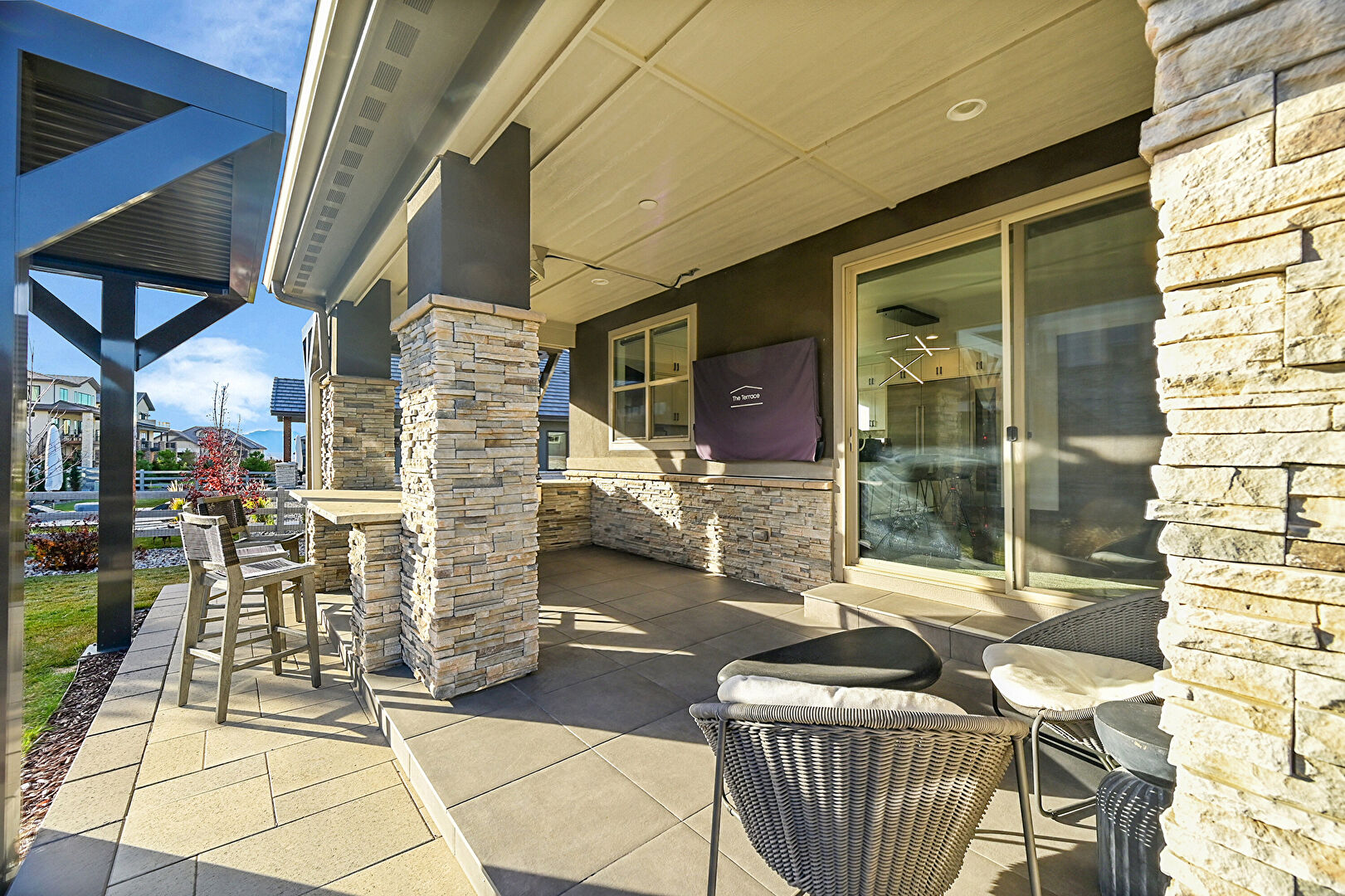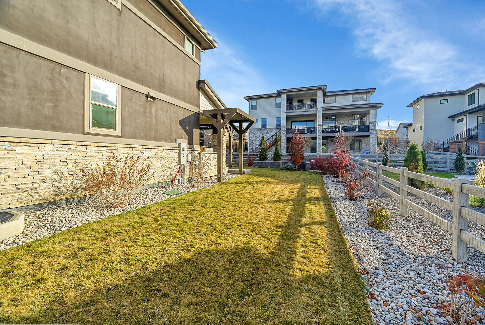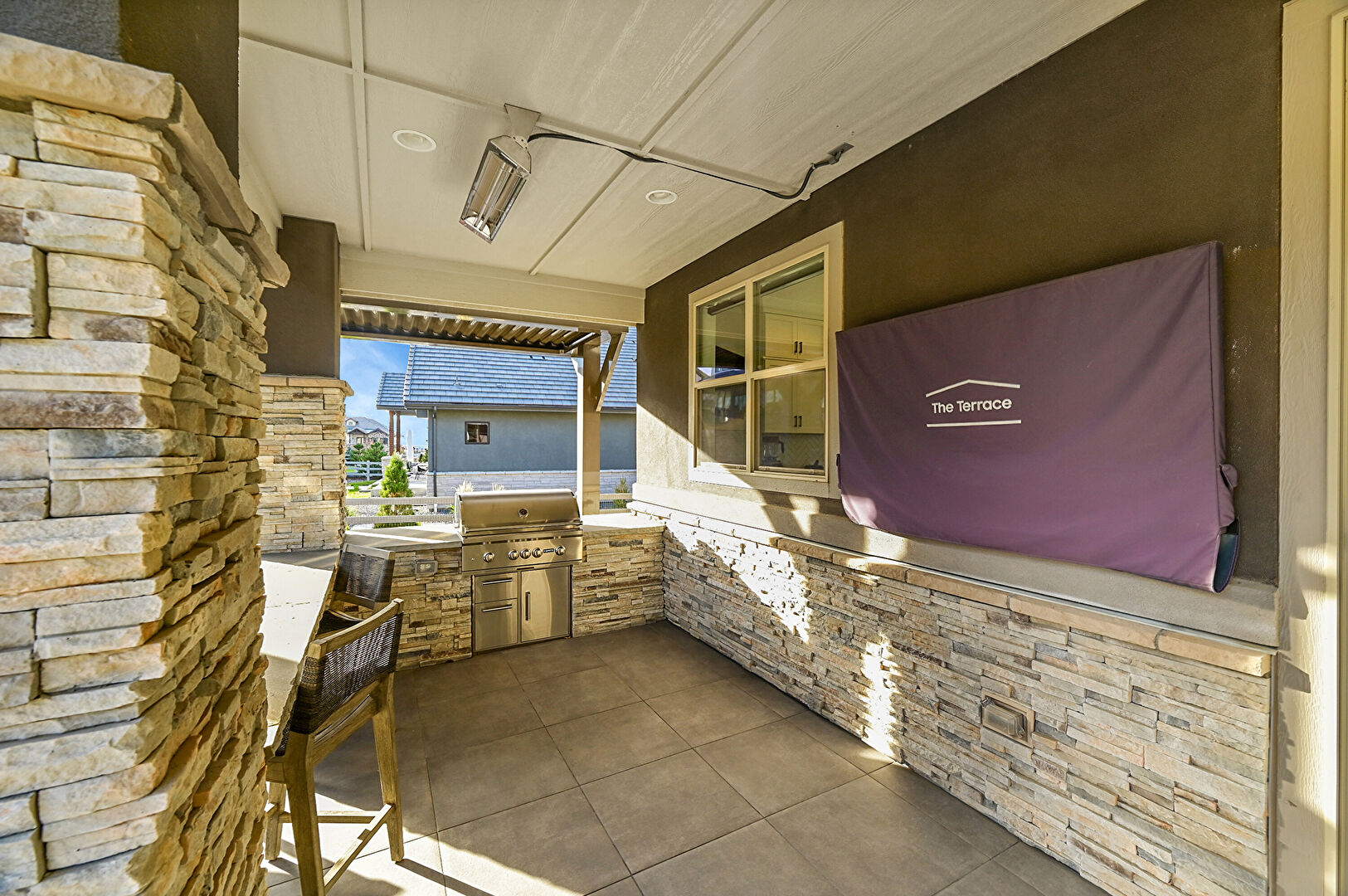 Central Ac, Downspout, Fence, Gutters, Horizontal Siding, Lawn, Outdoor Kitchen, Patio, Residential View, Stone Siding, Stucco Siding, Fire Pit, Gutters