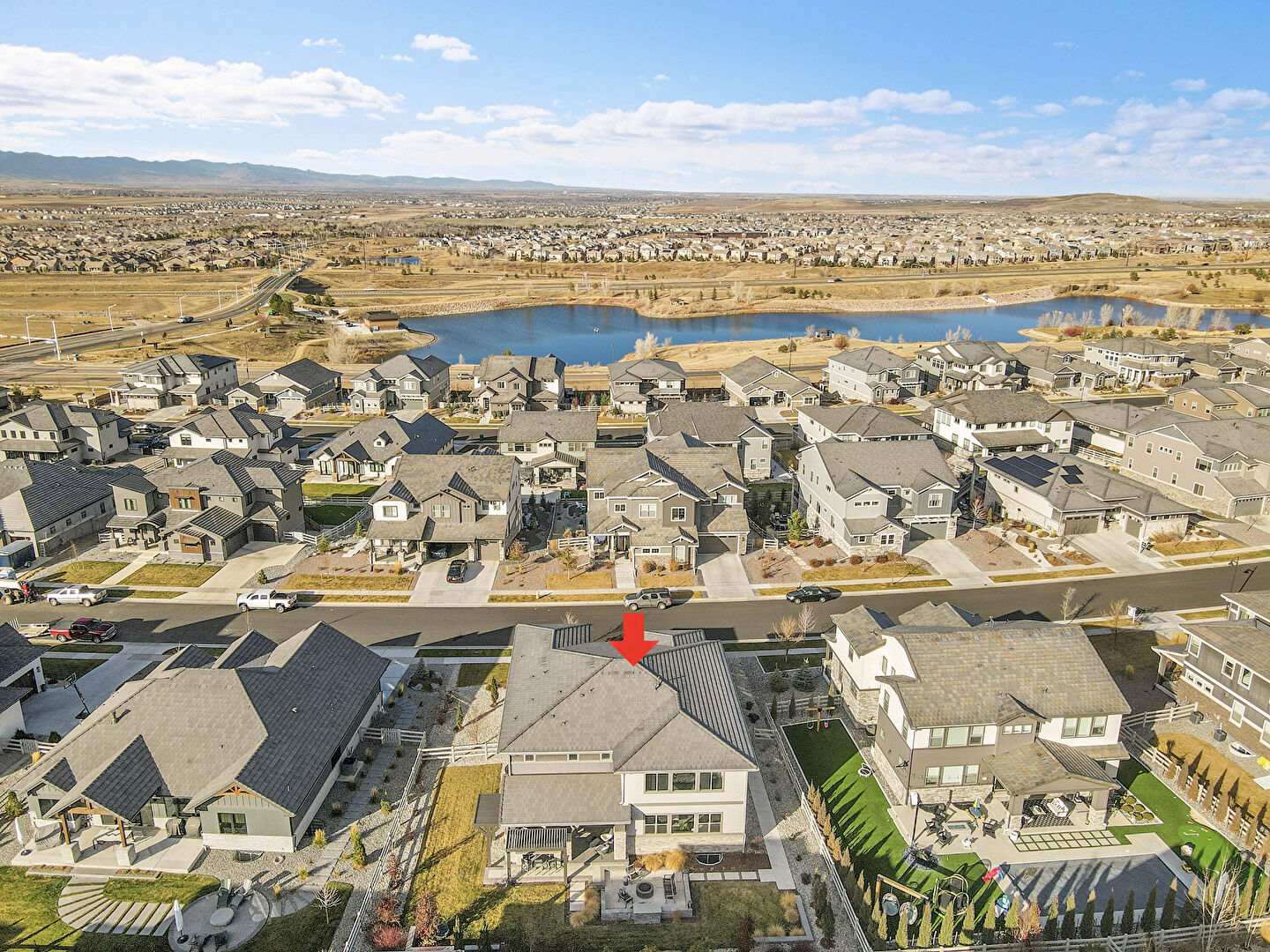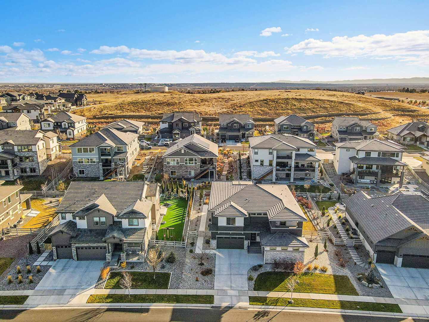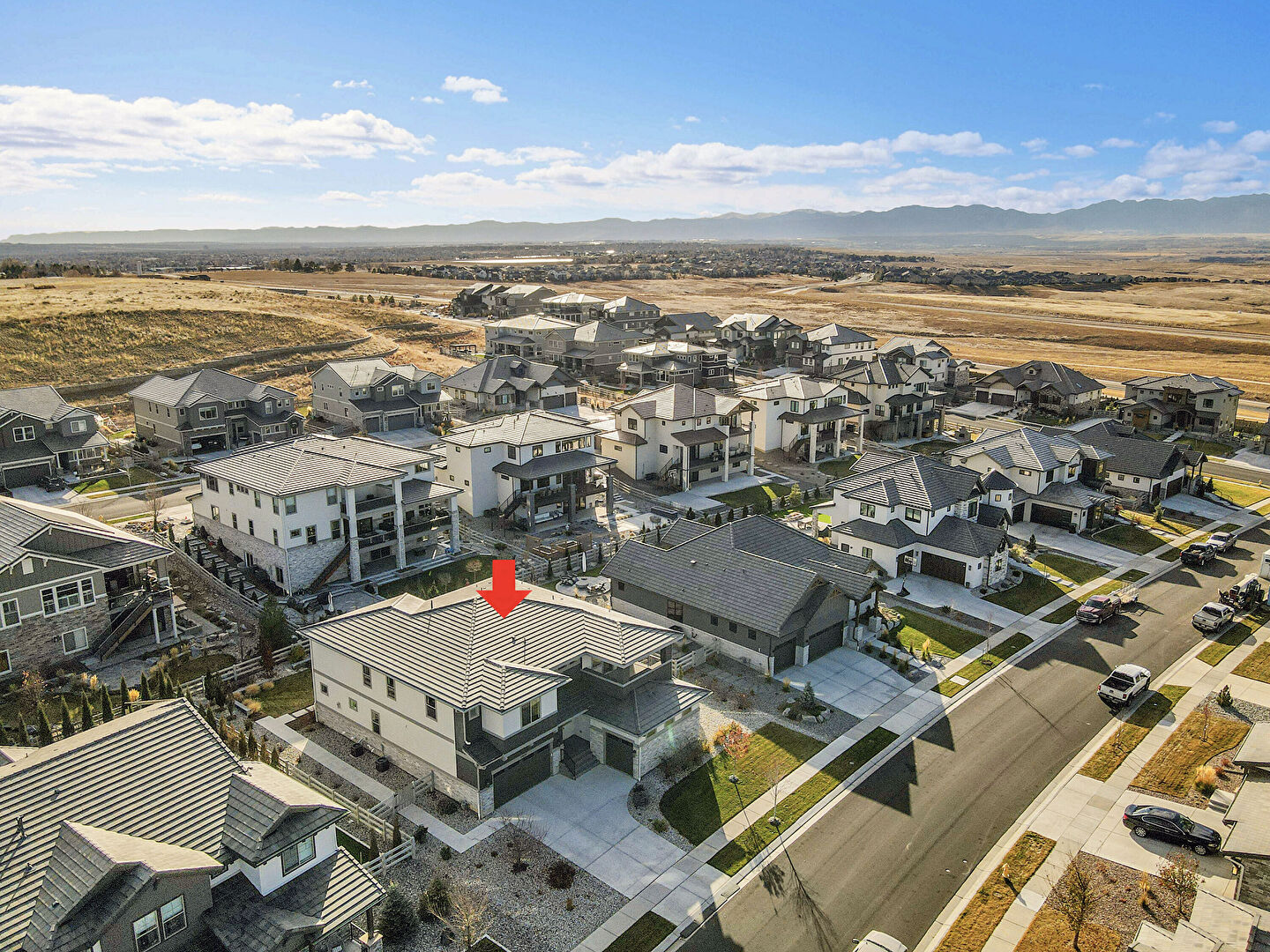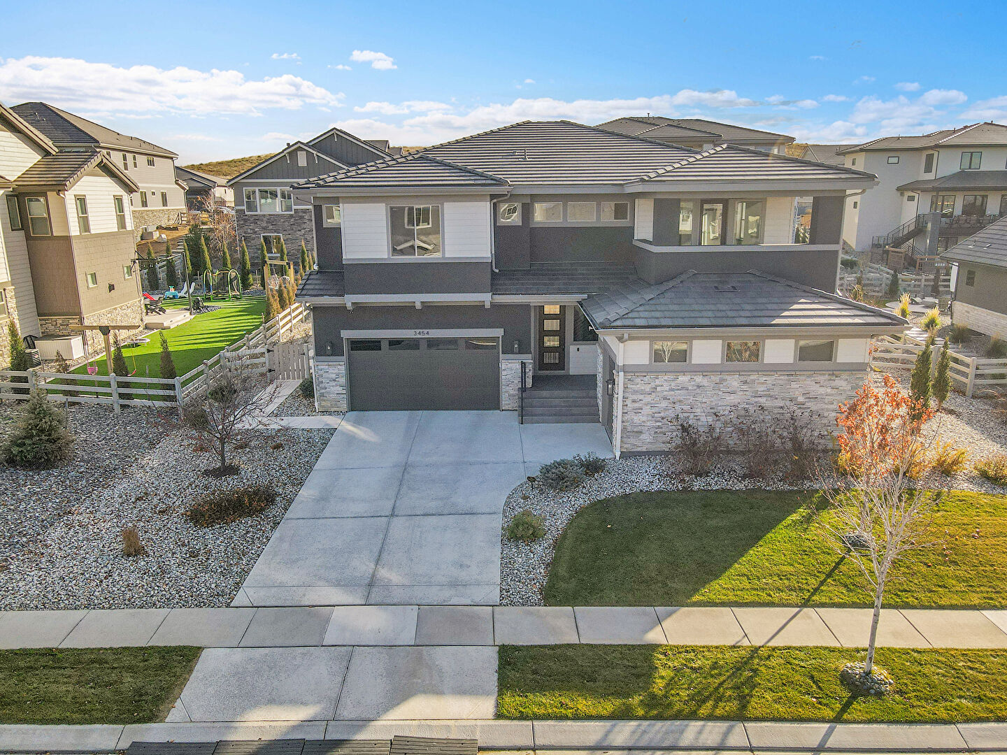 Built In Garage, Driveway, Fence, Horizontal Siding, Lawn, Residential View, Stone Siding, Stucco Siding, Tile Roof, Downspout, Residential View