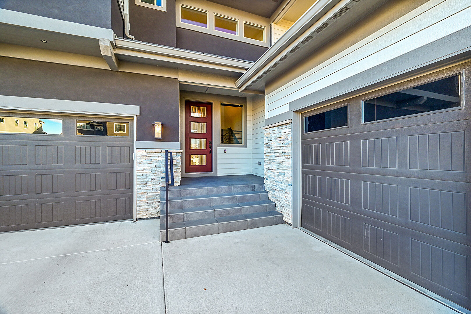 Built In Garage, Downspout, Driveway, Gutters, Horizontal Siding, Lawn, Stone Siding, Stoop, Stucco Siding, Built In Garage, Driveway