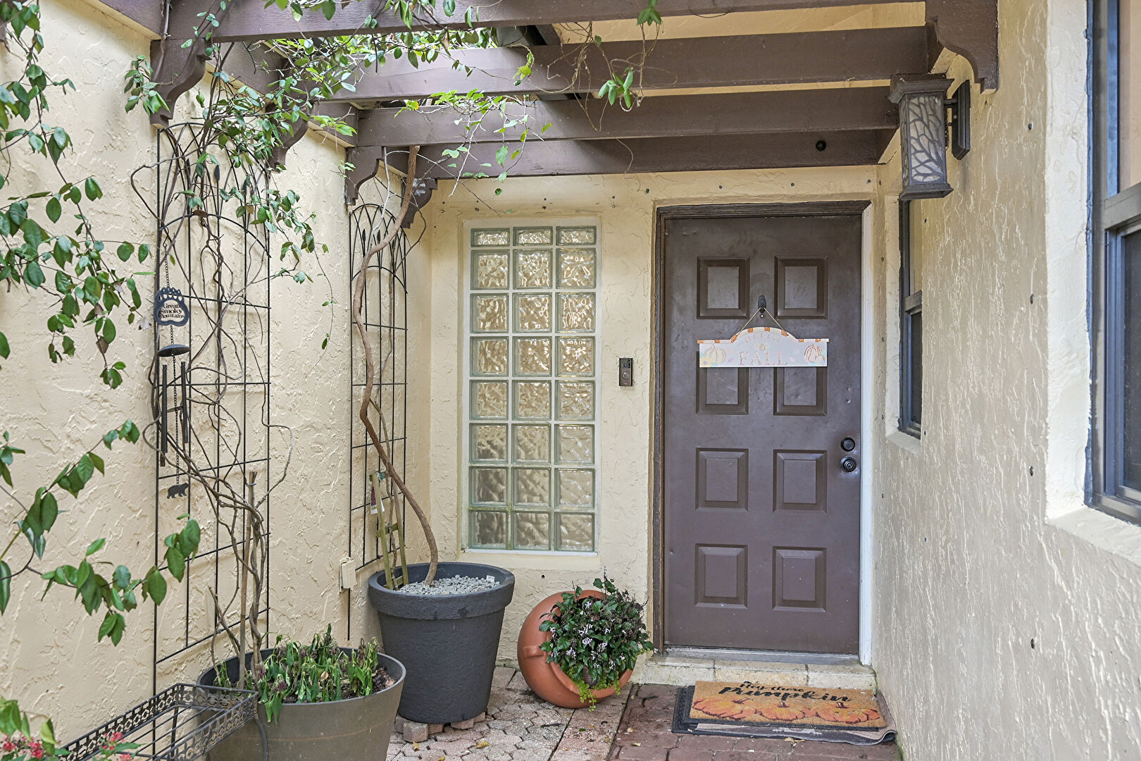 Downspout, Gate, Stucco Siding, Tile Roof, Gutters, Pergola